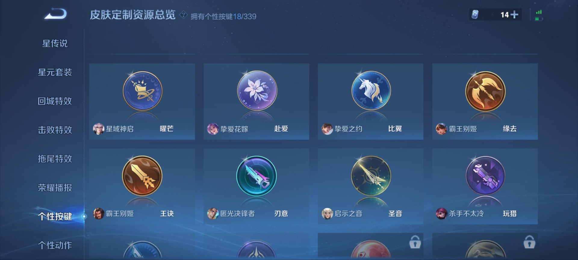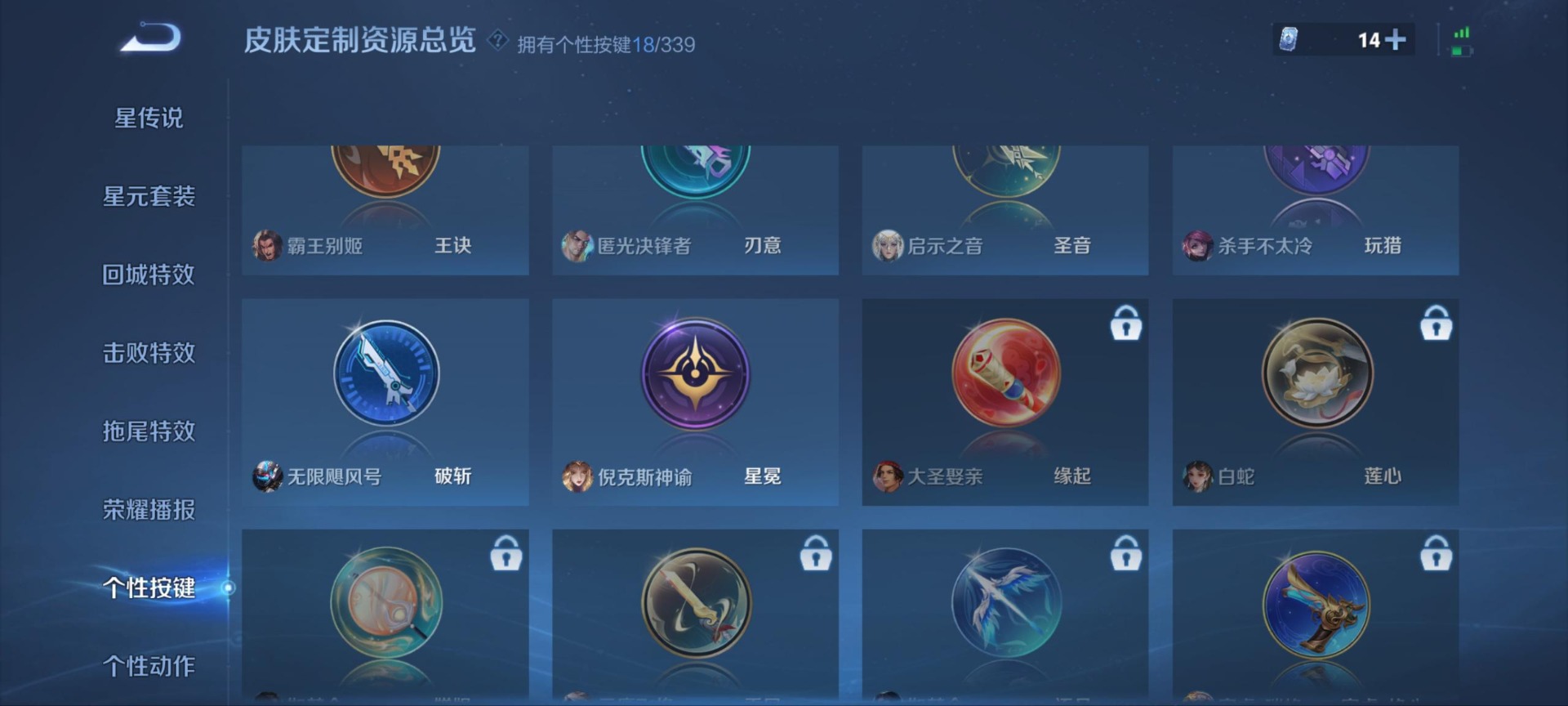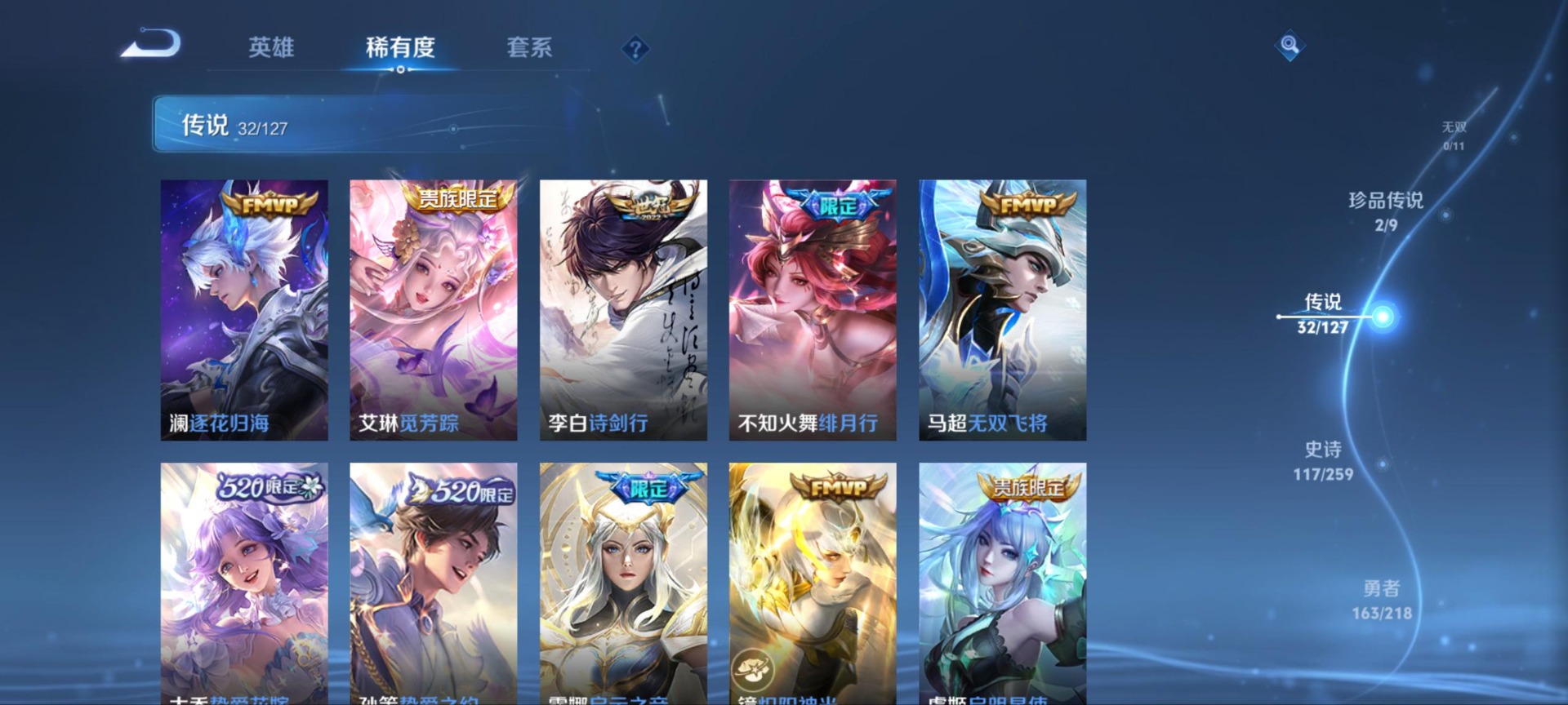 大乔白鹤梁神女,夏侯惇匿光决锋者,廉颇寅虎·御盾,伽罗天狼溯光者,赵云百木心枪,典韦岱宗,不知火舞绯月行,项羽霸王别姬,吕布御风骁将,后羿如梦令,露娜启示之音,司空震愿照·山河定,上官婉儿神器·万象笔,李白诗剑行,安琪拉魔法小厨娘,桑启鸣野蒿,女娲愿照·千秋盛,孙悟空孙行者,孙悟空大圣娶亲,妲己愿照·众生和,虞姬霸王别姬,虞姬愿照·岁时盈,嫦娥如梦令
