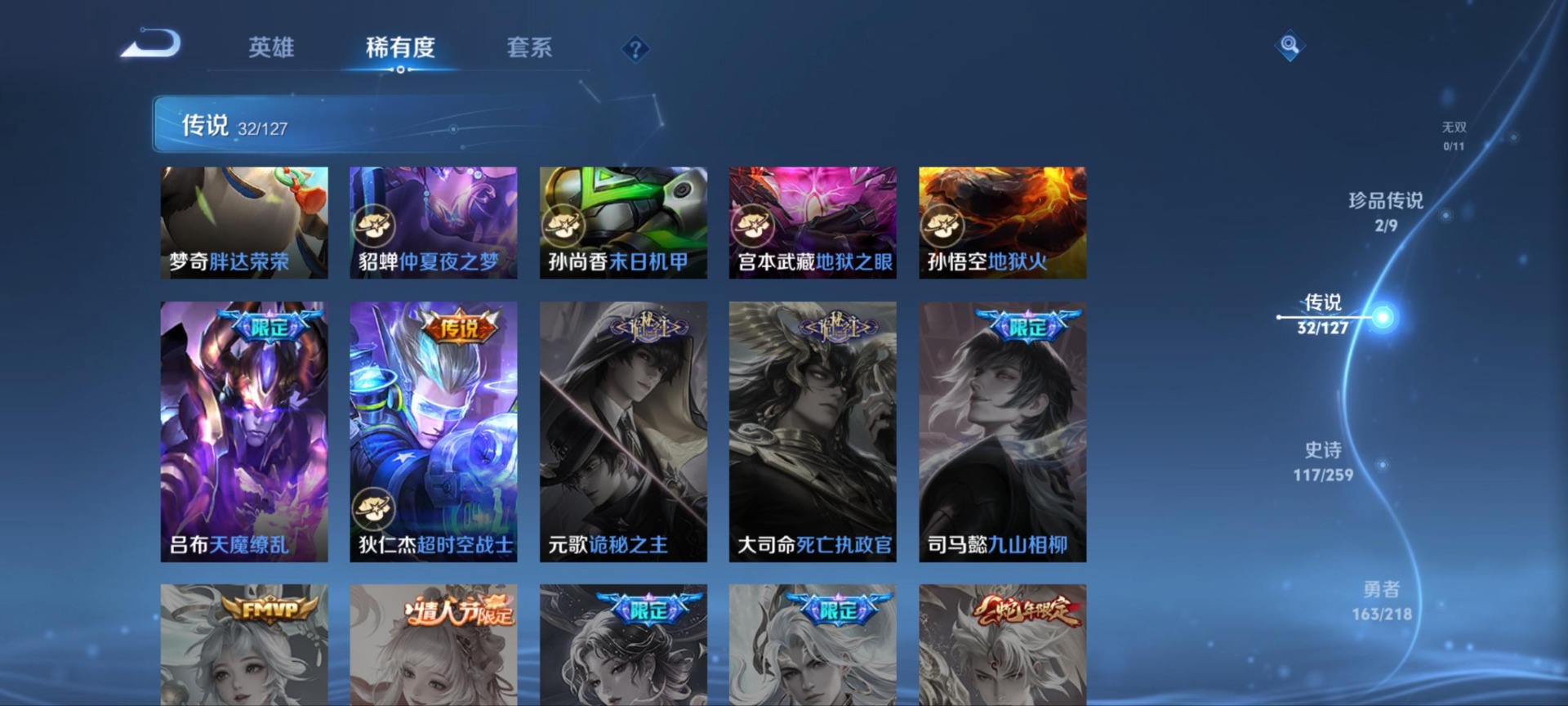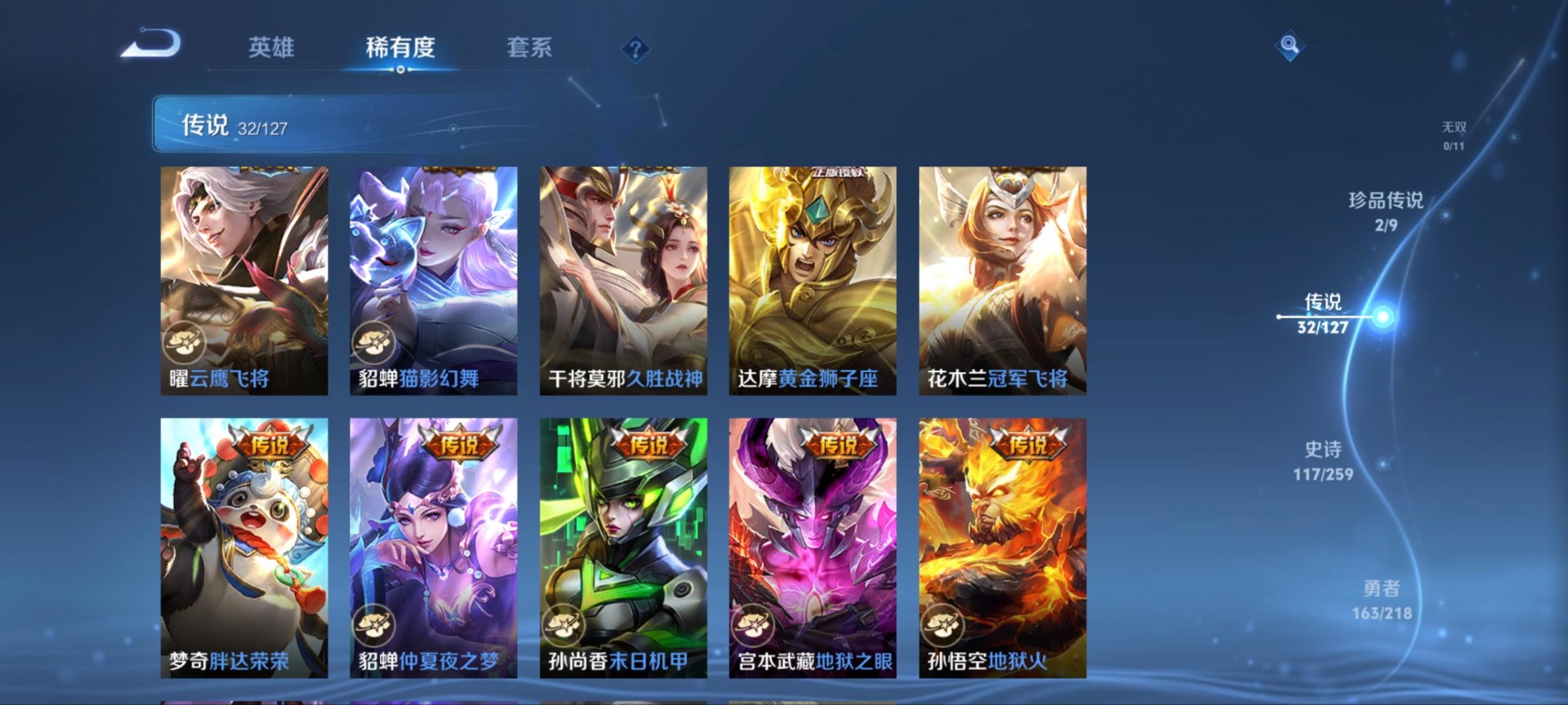 刘邦夺宝奇兵,夏侯惇朔风刀,老夫子醍醐杖,沈梦溪星空之诺,沈梦溪大漠名商,曹操烛龙,孙膑妖精王,苏烈千军破阵,典韦穷奇,达摩沙漠行僧,吕布猎兽之王,庄周蜃楼王,元歌云间偶戏,兰陵王金庭之子,鲁班大师探海日志,明世隐疑决卦,马可波罗暗影游猎,白起狰,鬼谷子原初探秘者,张良古海寻踪,狄仁杰万华元夜,嬴政白昼王子,程咬金演武夺筹,扁鹊炼金王,李元芳云中旅人,弈星混沌棋,虞姬凯尔特女王,米莱狄御霄,钟馗驱傩正仪,狂铁御狮,太乙真人饕餮