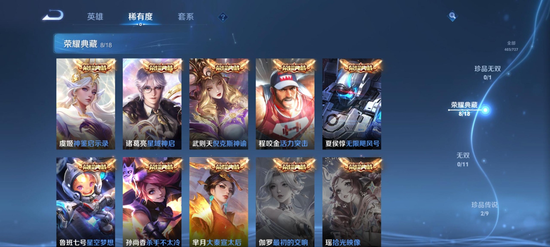 夏侯惇无限飓风号,孙尚香杀手不太冷,鲁班七号星空梦想,武则天倪克斯神谕,诸葛亮星域神启,芈月大秦宣太后,程咬金活力突击,虞姬神鉴启示录