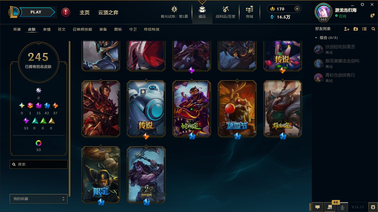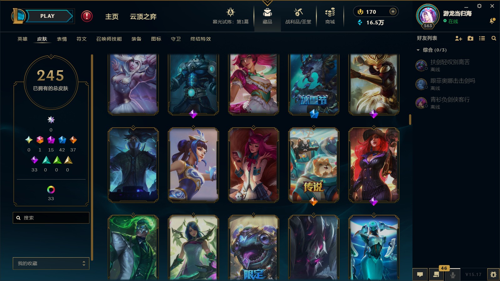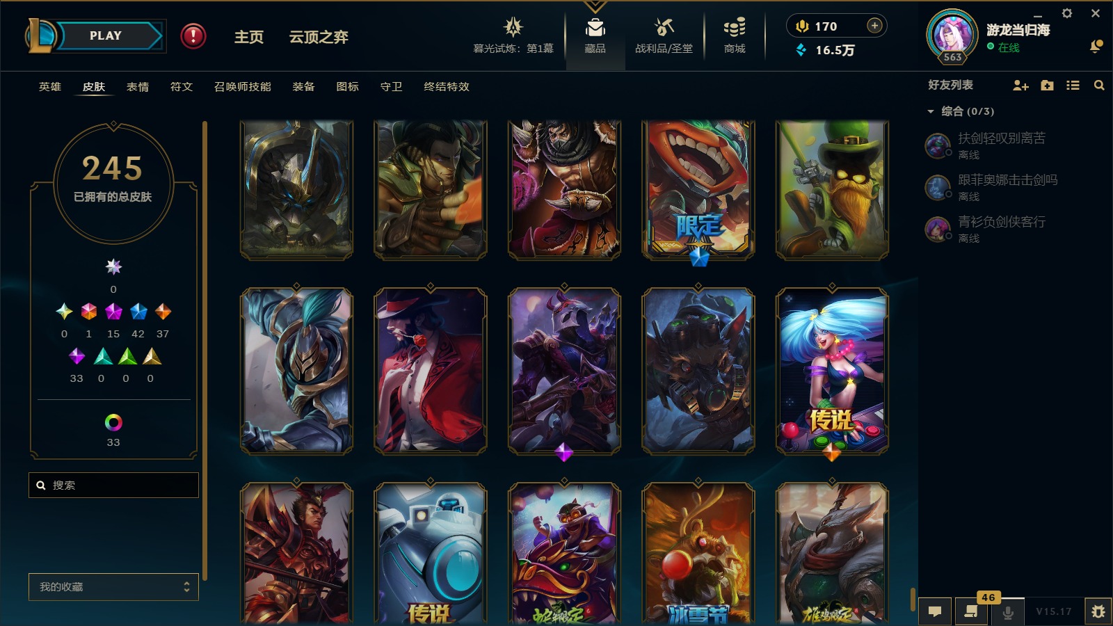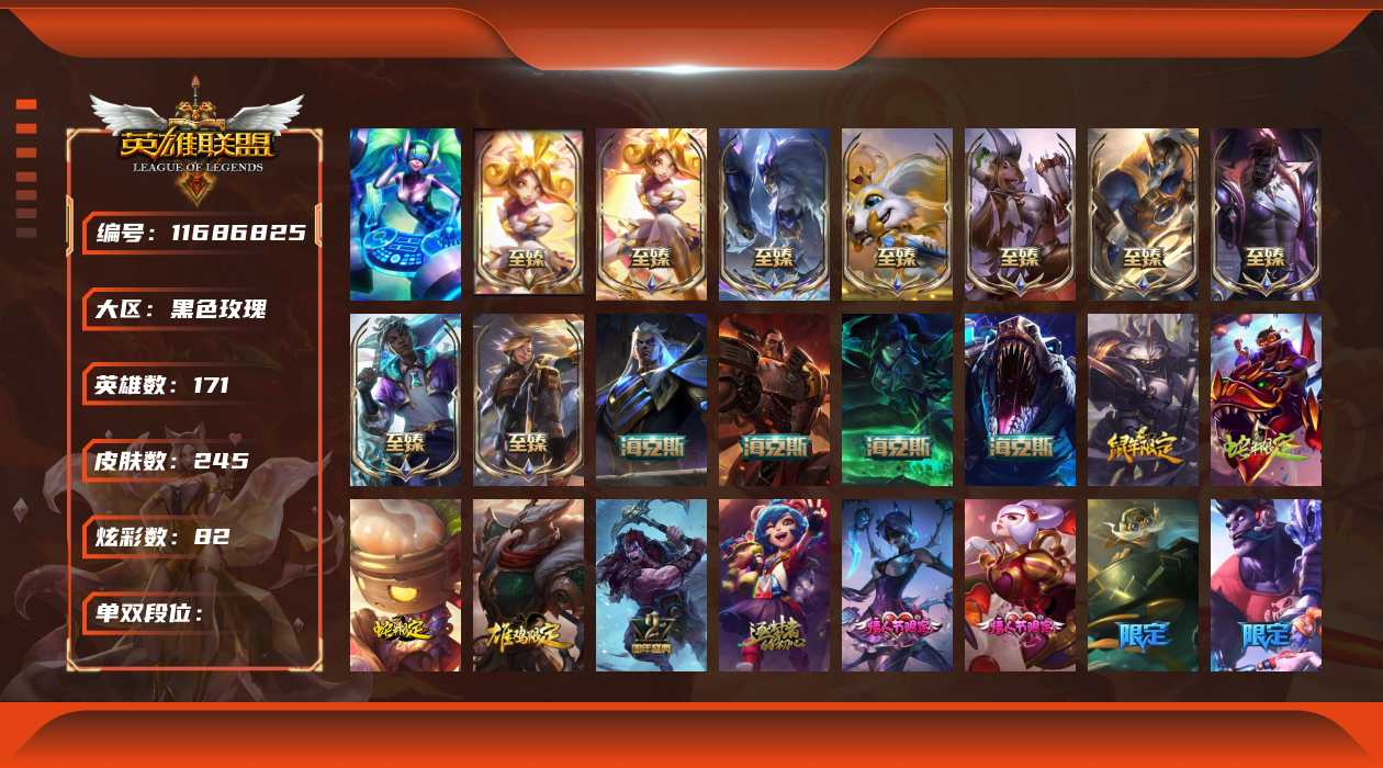 [11686825]1终极 15神话 42限定 37传说 33史诗 245皮肤 82炫彩 171英雄 可二次 可修改实名 优质装备:至臻 绒毛菲兹,至臻 魅惑女巫 厄运小姐,至臻 星之守护者 妮寇,至臻 飞升战神 潘森,至臻 灵能特工 伊泽瑞尔,暗影 沃里克,都铎王朝 图奇,防爆士兵 炼金,冠军蔷薇 乐芙兰,警用试作体K-9 内瑟斯,至臻 星之守护者 艾克,DJ-娑娜,至臻 至高天 奎桑提,灰烬骑士 莫德凯撒,至臻 星之守护者 妮蔻,奥德赛 吉格斯,源计划: 联合 艾希 红莲之弓,冠军之血 希瓦娜 凯旋圣装,无畏骑士 瑟庄妮 赤子初心,玉剑传说 神机花火 青竹,星之守护者 金克丝 黑洞,至臻 绒毛 菲兹,净雪之月 莫甘娜 冬虹,十五周年纪念 希维尔,灌篮高手 德莱厄斯 金色神话,魔女 阿卡丽 虚荣,王国机神 白虎 贾克斯 云霄,至臻 双城之战2 指挥官 凯特琳 华星,点心宝贝 萨勒芬妮 香蕉冰糖葫芦,殿堂传奇 薇恩,殿堂传奇 薇恩 登神 海克斯:恐惧新星 德莱厄斯,摄魂 薇恩,海克斯 雷克顿,海克斯 斯维因 情人节限定:觅心魔灵 奥利安娜,幽梦玫瑰 蜘蛛 赛季限定皮:胜利巨口 克格莫,胜利女神 奥利安娜,胜利之剑 剑魔,胜利枪神 卢锡安,胜利女神 瑟庄妮 冠军限定系列:S1FNC 酒桶,S1FNC 迦娜,S1FNC 嘉文四世,S1FNC 库奇,S2 暗杀星 蒙多,S2 暗杀星 慎,S3 SKT T1 薇恩,S6 SKT T1 娜美 冰雪节限定:“主人不要我了” 阿木木,冰雪节 格雷福斯,魄罗骑士 瑟庄妮,圣诞开心鬼 提莫,圣诞狂欢 努努,圣诞玩偶 波比,圣诞驯鹿 克格莫,冰雪节 茂凯,邪恶圣诞老人 维迦,幸福女神 乐芙兰,北极星使者 沃里克 泳池派对:泳池派对 菲奥娜,泳池派对 李青,泳池派对 普朗克,海之歌 奈德丽 万圣节限定:鬼影森森 茂凯 年限:点心宝贝 阿木木,蛇年 库奇,鸡年 阿兹尔,鼠年 武器 周年:2周年 德莱厄斯,10周年 安妮