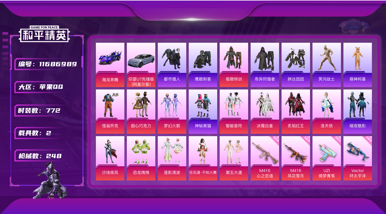 [11686989]13粉装 6特效枪 2载具 17印记 可二次 可修改实名 身法装备:都市猎人,暗影哥特(红眼罩),冥河战士(老木乃伊),萌熊伴侣背包(粉熊背包) 优质装备:冥河战士(老木乃伊),木乃伊套装(老)(冥河战士),怪诞乔克(小丑),仰望U7先锋版(阿盖尔紫),甜心巧克力,海龙奔腾,都市猎人,枪皮-星际漫游M416,萌熊伴侣背包(粉熊背包),M416心之恋语,奇异狩猎者,梦幻火箭(新101)(新火箭少女101粉色套装),极限特训,智能音符,炙焰红王,冰霜白皇,UZI绮梦青鸾,M416风花雪月,洛天依,Vector环太平洋,七级Vector-环太平洋,七级M416-风花雪月,七级UZI-绮梦青鸾,七级M416-心之恋语,狂花道·不知火舞,Kar98K-巳巳如意 热门装扮:沙场疾风,恐龙拽拽,第五大道,莲影清波,神秘黑猫,胖达团团,萌神柯基,鹰眼刺客,都市猎人,暗夜魅影 稀有枪皮:DP-28-豹影疾电 五级特效枪:五级Kar98K-巳巳如意 一级特效枪:一级DP-28-豹影疾电 紫色装扮:SS22特训,SS23特训,娇憨猪猪,酸甜橘柚,萌趣咩咩,SS21特训,SS31特训套装,军械专家,冰川特警,千禧之恋,极速光影,SS30特训套装,SS33特训套装,青涩时光,顶瓜瓜,SS20特训,SS15特训,银白舞王,SS13特训,浪漫樱花,治愈之星,科技之星,SS14特训,萌趣颜团子,茉莉之诺,飞驰魅影,音速流光,SS19特训,军刀雅典娜,英勇保护者,甜心亚梦,虚音幻奏,雪兔飞飞,瑞龙福将,团圆交子,SS17特训,炫光向阳,异彩先驱,缤纷焰火,SS18特训,都市漫游者,酷潮明星,金鼠迎春,长空猛禽,雪山精英,霓虹极客,霓虹街区,缤纷果语,耀眼新星,荣耀,蓝彩潮人,蓝色运动,虎虎生威吉莉,超能勇士,飞行日记,魅力单车,麻辣教官,黄色伏地魔,黄色名流,黄色运动,黑色伏地魔,龙的传人,龟仙人,龙魂突击队,蝶变,香桃花海,沙漠毒蛇,极地朋克,柠萌假日,沙漠兵团,海岛探路者,清新柠檬,滨海假日,夏日倾情,夏日音浪,完美偶像,帅气教官,幻世战舞者,怒火燎原,战地菁英,湖蓝色名流,滨海厨神,绮丽涂鸦,甜蜜菠萝,白色伏地魔,破蛋小黄鸡,神秘领域,福星高照,空岛之星,空投萌叽,红色运动,甜蜜熊情侣,牛气冲天,灼焰舞者,灿烂千阳,炫蓝之夏,热血青春,牛气满满,猛禽,特战英豪,特战装甲,狂沙舞者,镭射皇者