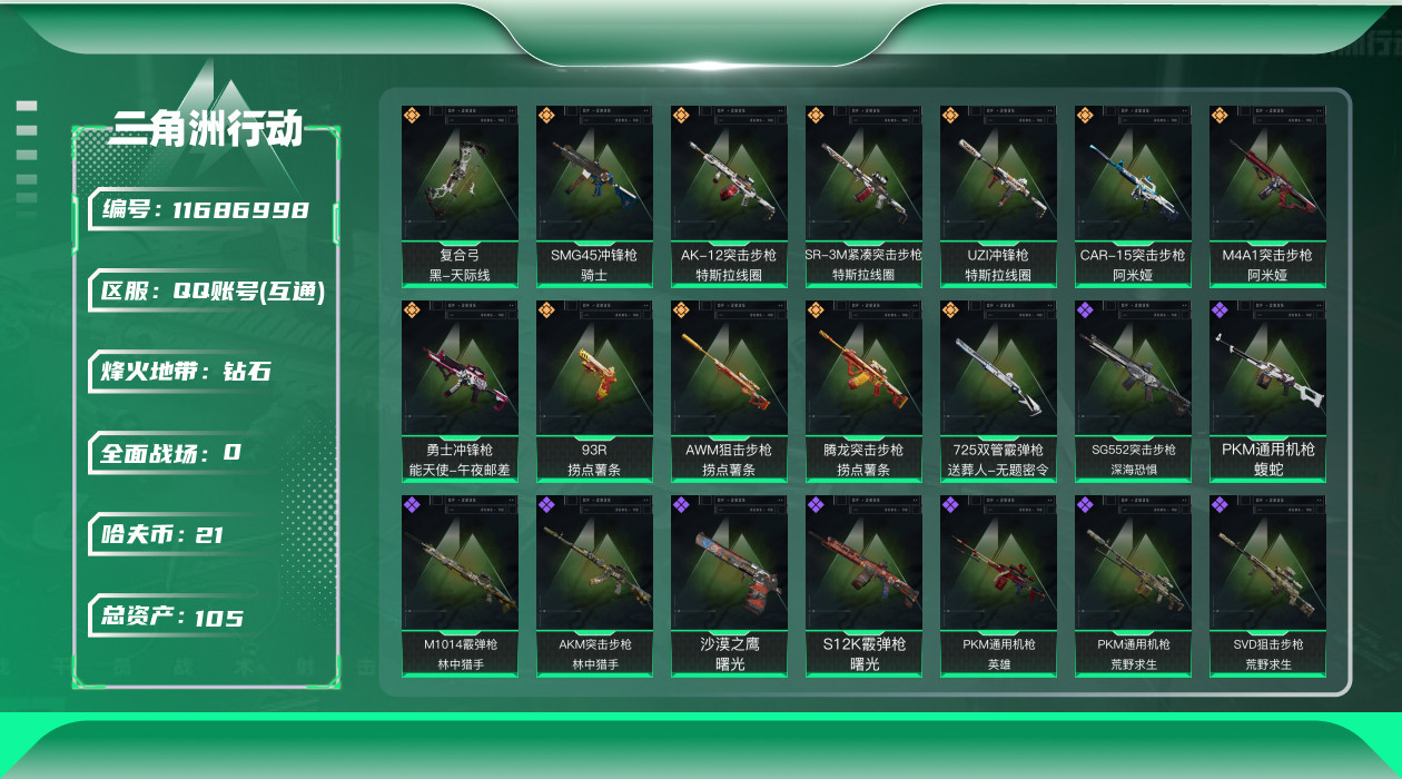 [11686998]总资产:105.6M 1干员外观 12传说枪械 哈夫币:21.849K 高级安全箱(9.17到期) 可二次 可修改实名 烽火地带段位:钻石 全面战场段位:无段位 传说武器皮肤:SMG45冲锋枪-骑士,M4A1突击步枪-阿米娅,CAR-15突击步枪-阿米娅,复合弓-黑-天际线,AWM狙击步枪-捞点薯条,腾龙突击步枪-捞点薯条,93R-捞点薯条,AK-12突击步枪-特斯拉线圈,SR-3M紧凑突击步枪-特斯拉线圈,UZI冲锋枪-特斯拉线圈,勇士冲锋枪-能天使-午夜邮差,725双管霰弹枪-送葬人-无题密令 史诗武器皮肤:PKM通用机枪-蝮蛇,M16A4突击步枪-竞赛选手,PKM通用机枪-荒野求生,SG552突击步枪-深海恐惧,AKM突击步枪-林中猎手,SR-3M紧凑突击步枪-荒野求生,M1014霰弹枪-林中猎手,SVD狙击步枪-荒野求生,M250通用机枪-囚徒,SV-98狙击步枪-囚徒,腾龙突击步枪-无垢,MP7冲锋枪-无垢,PSG-1射手步枪-无垢,沙漠之鹰-曙光,S12K霰弹枪-曙光,PKM通用机枪-英雄 干员外观:蜂医-送葬人·无题密令(S5)
