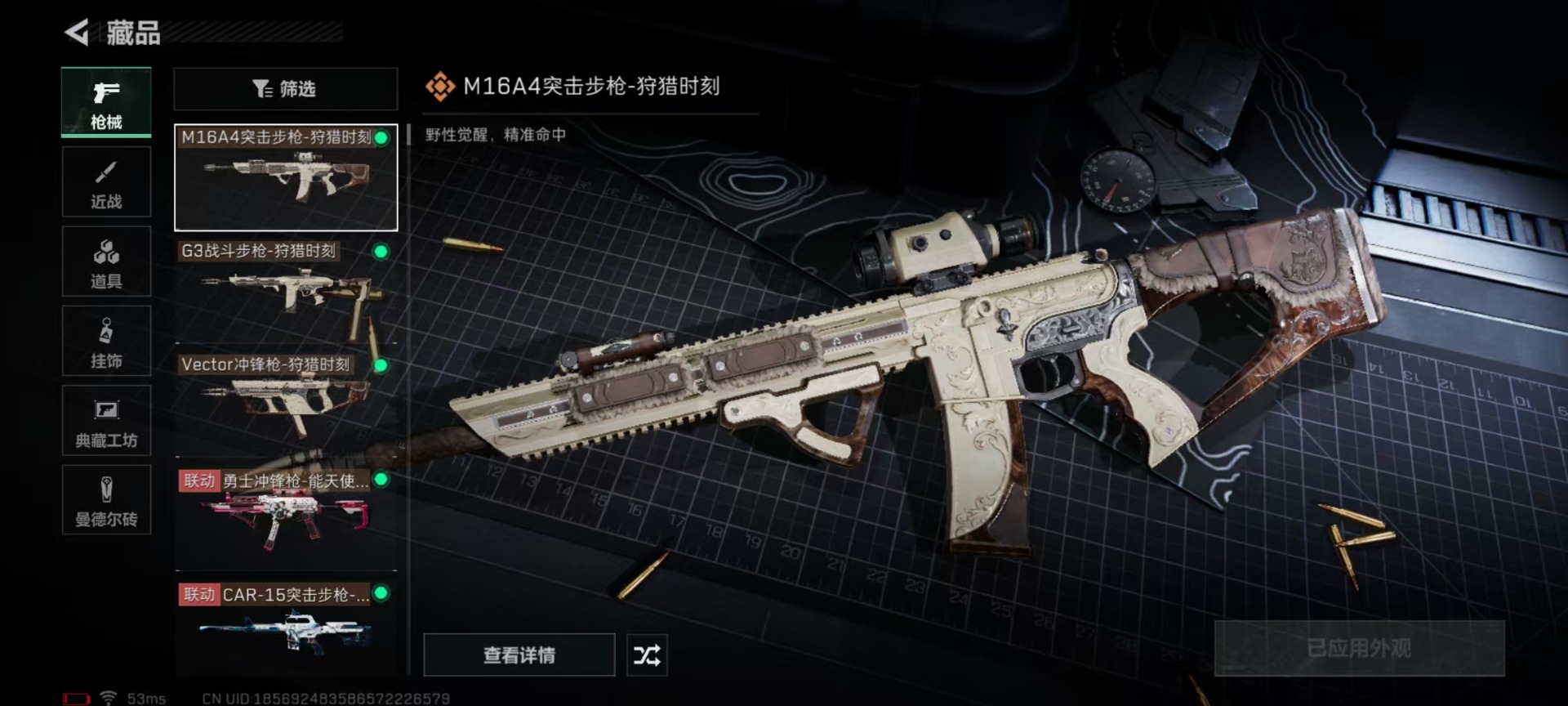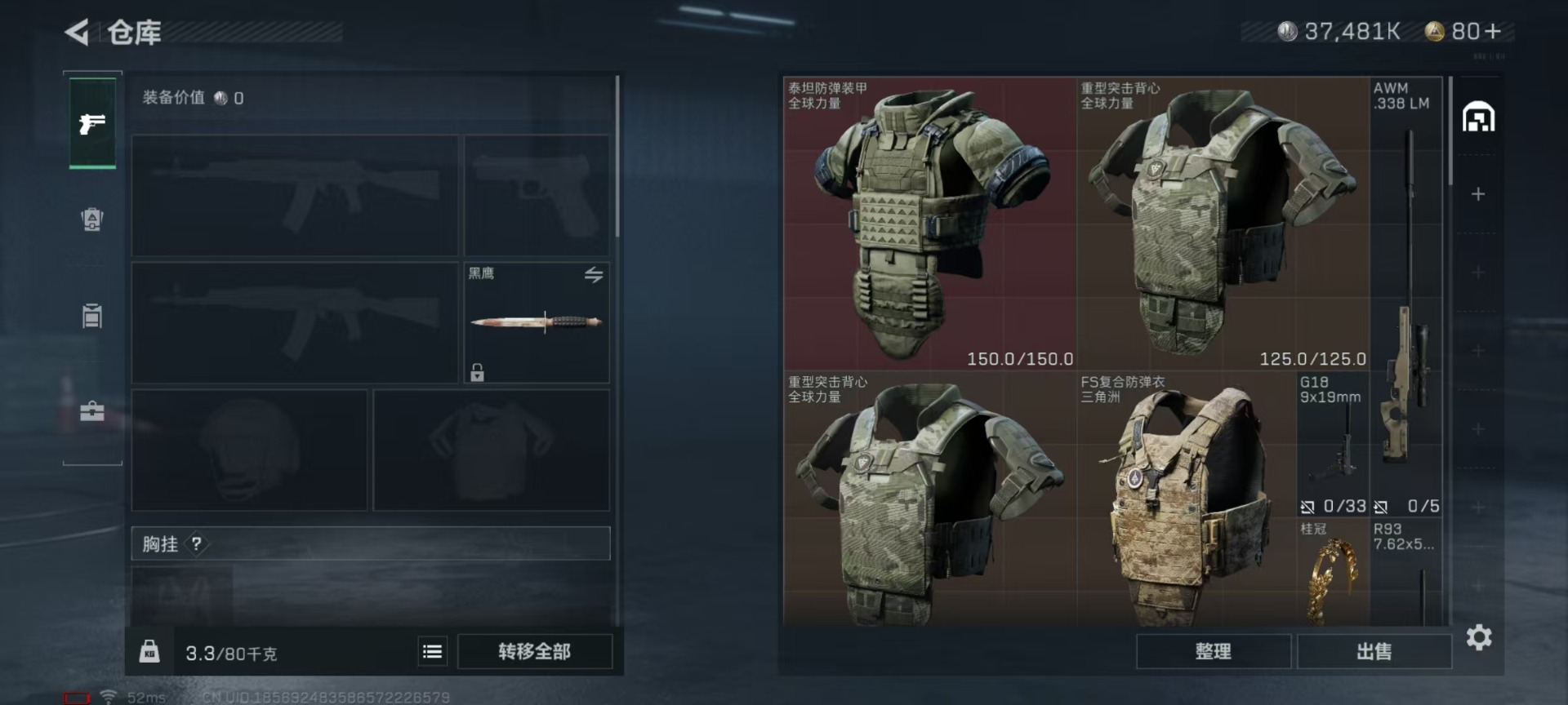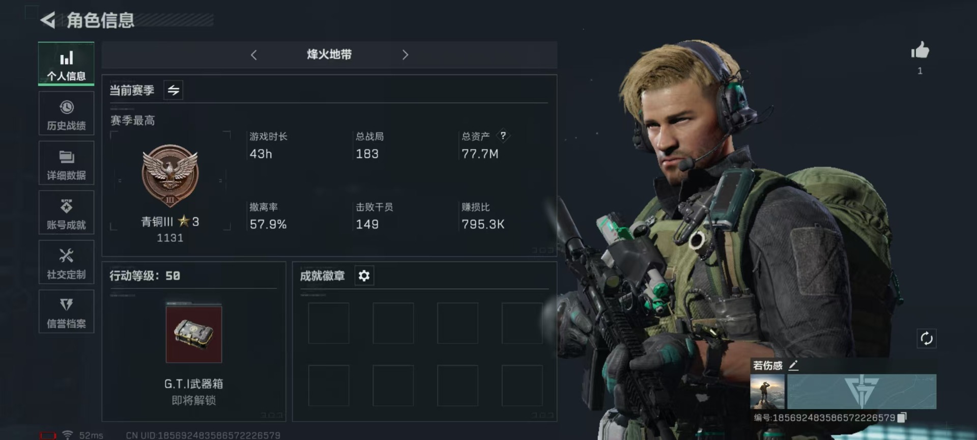 [11687076]总资产:77.7M 6传说枪械 哈夫币:37.481K 进阶安全箱(9.17到期) 可二次 可修改实名 烽火地带段位:青铜 全面战场段位:上等兵 传说武器皮肤:M16A4突击步枪-狩猎时刻,CAR-15突击步枪-阿米娅,复合弓-黑-天际线,Vector冲锋枪-狩猎时刻,G3战斗步枪-狩猎时刻,勇士冲锋枪-能天使-午夜邮差 史诗武器皮肤:M250通用机枪-囚徒,SCAR-H战斗步枪-囚徒