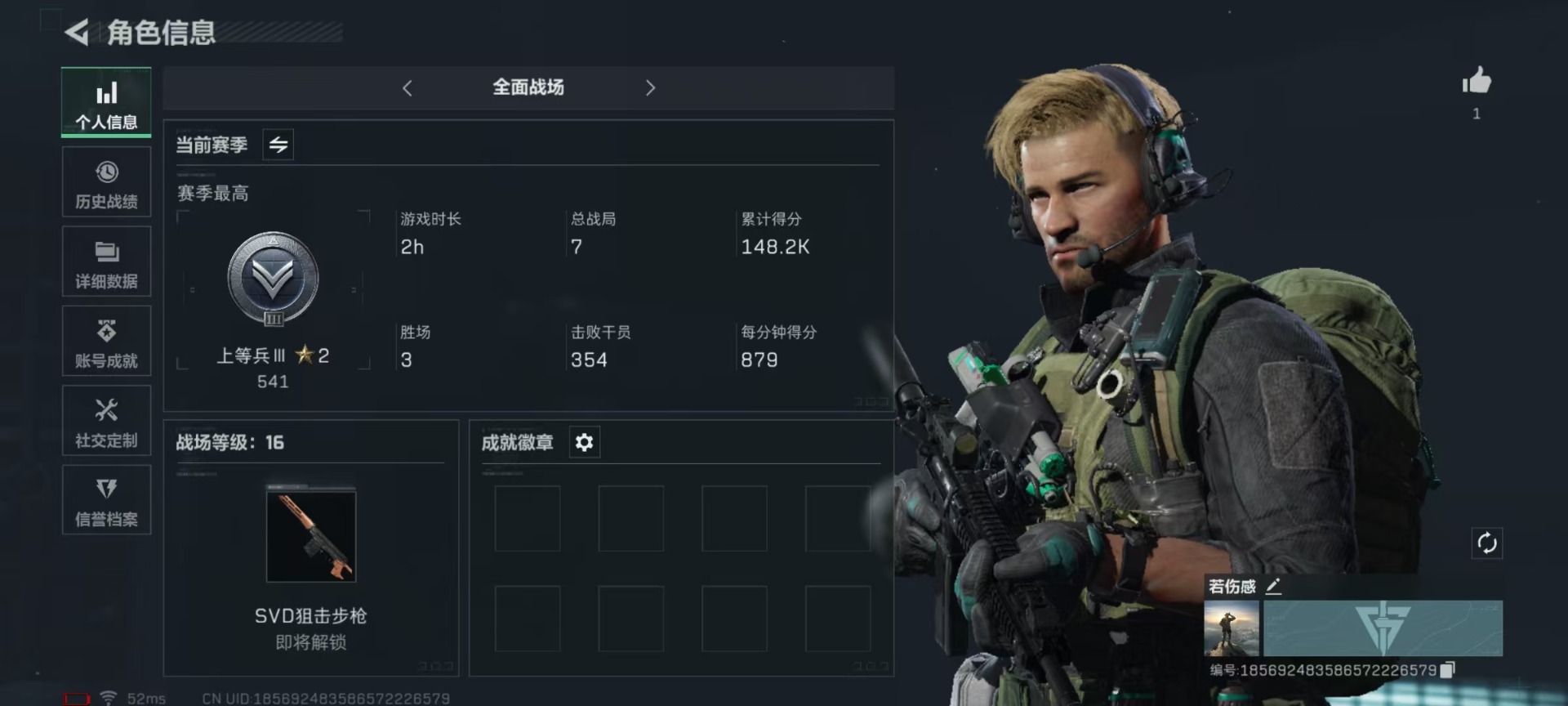 - [12168931]总资产:97.1M 5传说枪械 哈夫币:74.173K 可二次 可修改实名 烽火地带段位:铂金 全面战场段位:上等兵 传说武器皮肤:Vector冲锋枪-能天使-午夜邮差,M16A4突击步枪-狩猎时刻,G3战斗步枪-狩猎时刻,CAR-15突击步枪-阿米娅,Vector冲锋枪-狩猎时刻 史诗武器皮肤:PKM通用机枪-蝮蛇,SV-98狙击步枪-林中猎手,P90冲锋枪-紧急戒备,QJB201轻机枪-Old Habits,M16A4突击步枪-竞赛选手