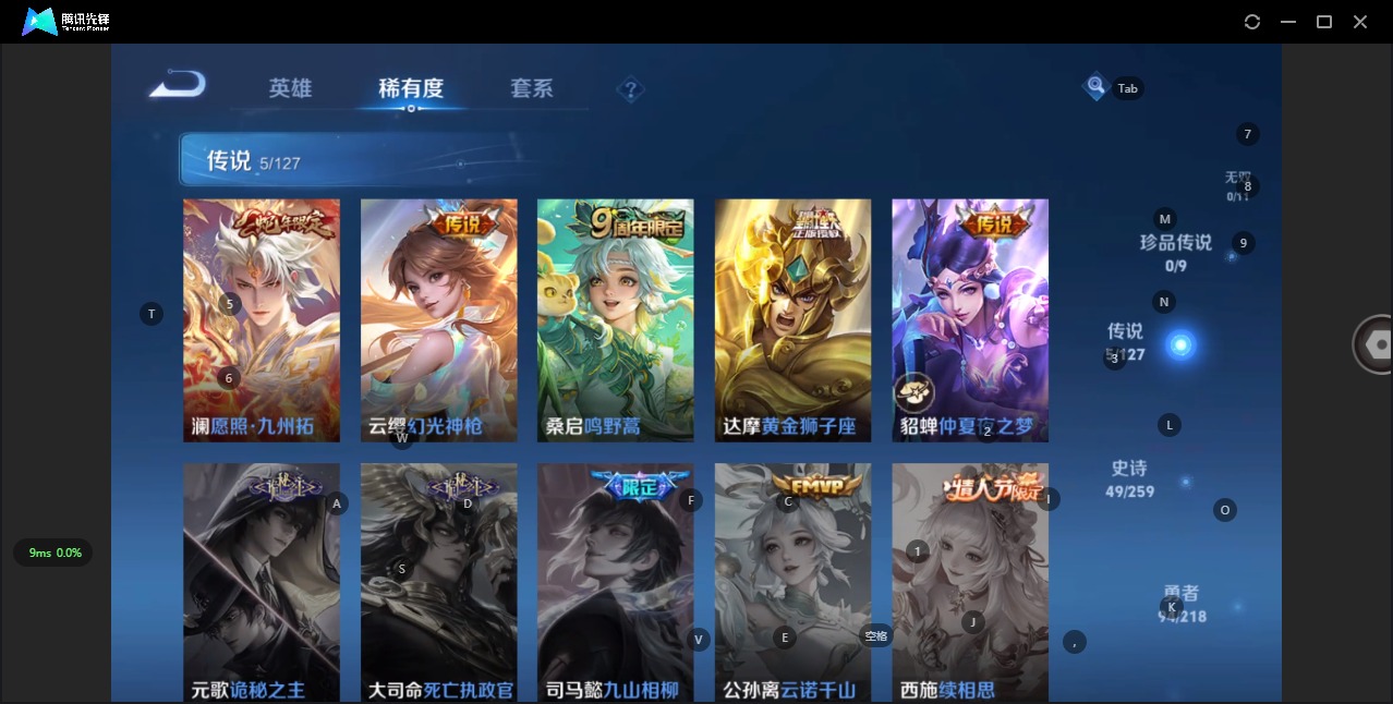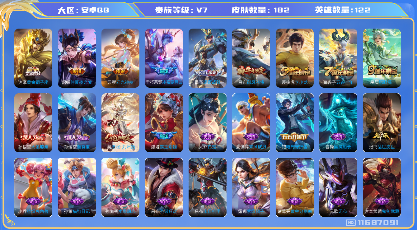 - [11278442]V7 1典藏 2珍品传说 6传说 121英雄 203皮肤 可修改实名 荣耀水晶:银白咏叹调(倪克斯侍卫) 珍品传说:酷洛米之心,黑崎一护 传说皮:地狱之眼,炽阳神光,乞巧织情 珍宝阁皮:蔷薇恋人 限定皮:愿照·九州拓(澜年限),愿照·山河定(司空震年限),逐霄战戟,鸣野蒿,梁祝,引擎之心 史诗皮:茶境仙,糖绘人间,鸭鸭历险记-刘禅,龙之律动,雪豹·霜爪,藏狐·褐绒,石田雨龙,百相守梦-百里守约,百相守梦-黄忠,埋骨钱,乘龙·聚宝船(安琪拉年限),炽弈燎原,化蝶舞,破空之剑,电玩小子(小书包),白龙吟,黄金分割率,特工魅影,千年之狐,江河有灵,高渐离燃音魔法,百解令(蒙犽),冰冠公主,青蛇,偶像歌手,电玩·爆裂旋风,末日机甲-吕布,猫狗日记-孙策,猫狗日记-大乔,时之恋人-孙尚香,乱世虎臣,节奏热浪,女仆咖啡,水果甜心,绅士熊喵,星夜王子,心灵骇客,暗隐猎兽者,幽灵船长,鬼剑武藏,心灵战警,舞动绿茵,纤云弄巧,拒霜思,缤纷独角兽,乘风破浪,逐浪之夏,水晶猎龙者,箭羽风息,金属风暴,圣诞恋歌,鹰眼统帅,魅力维加斯,未来纪元-赵云