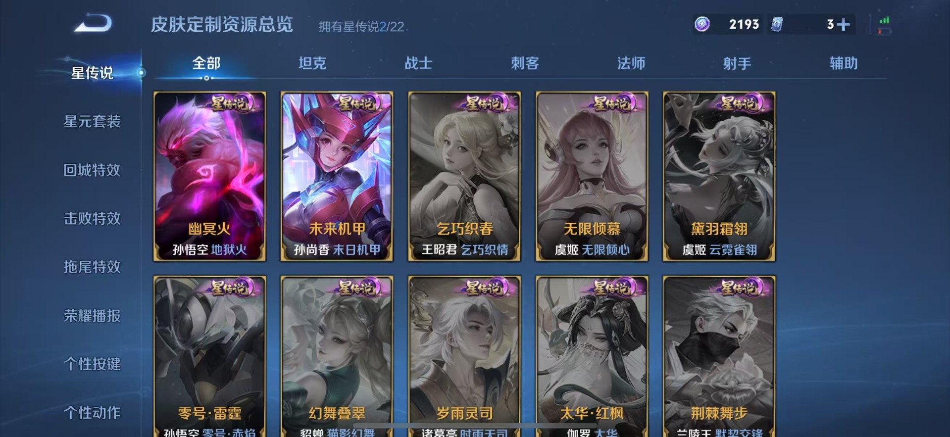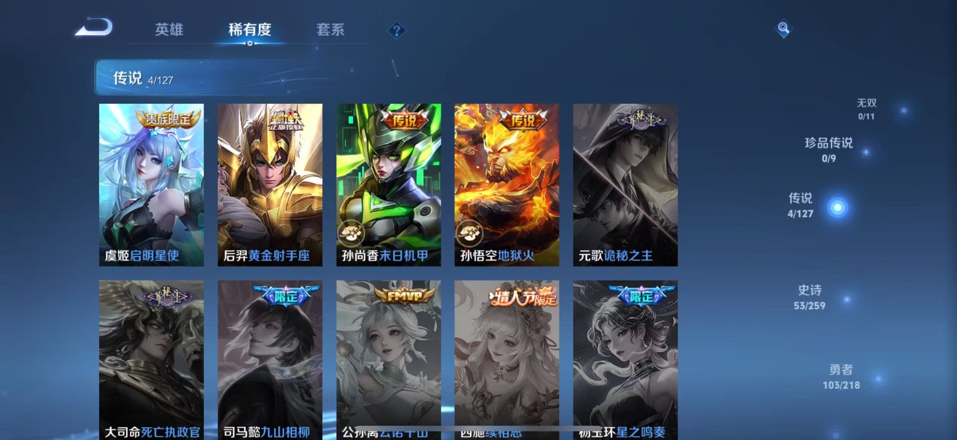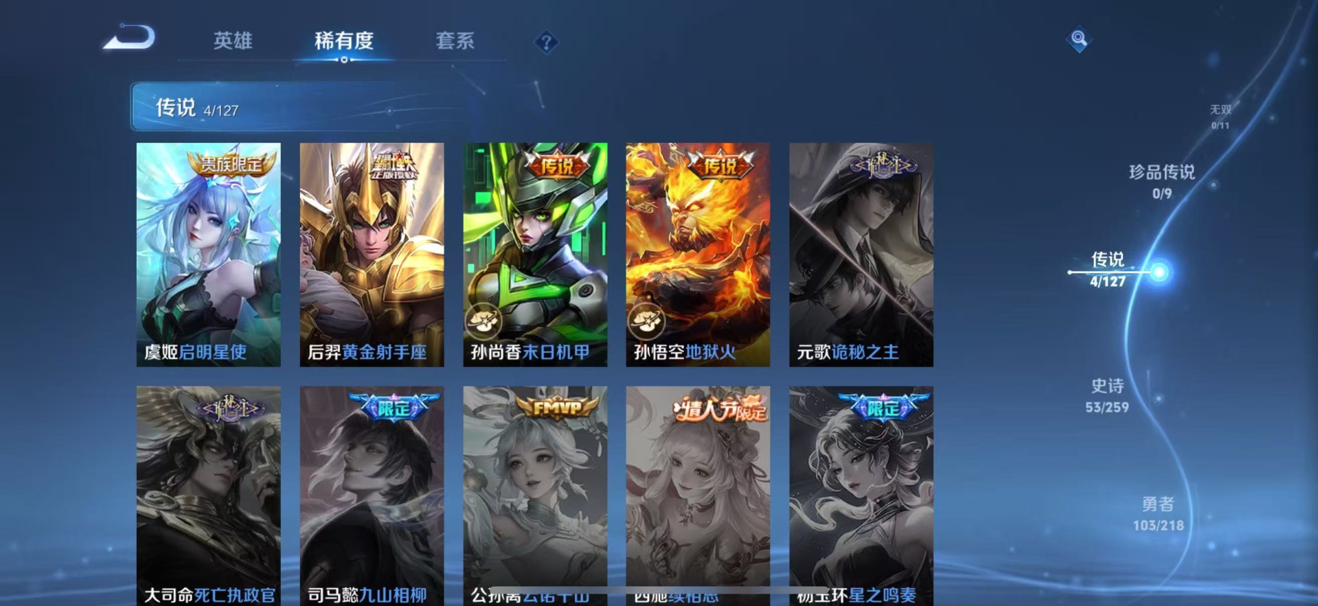 - PX_2094736-贵族等级: V6 英雄数: 100 皮肤数: 108 星传说: 未来机甲,幽冥火 传说皮: 末日机甲-孙尚香,地狱火 限定皮: 李小龙,梁祝,至尊宝,猪悟能