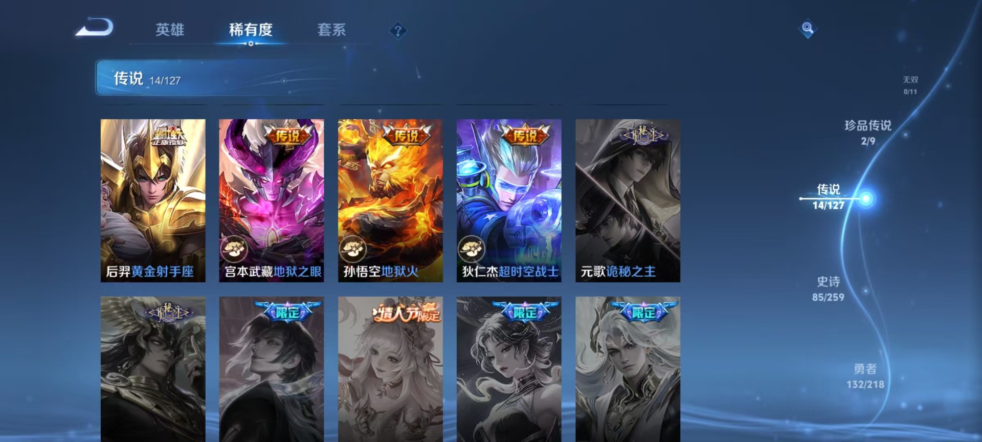 - [11882780]V7 1典藏 1无双 8传说 125英雄 235皮肤 可修改实名 优质装备:星域神启(倪克斯贼亮),器灵·螭龙剑,黄金射手座,一念神魔,仲夏夜之梦(大飞蛾),胖达荣荣,时之恋人-刘备(电焊工),末日机甲-孙策,挚爱之约,涂山容容 珍宝阁皮:胡桃夹子,玩趣恶龙 限定皮:鸣野蒿,至尊宝,傲雪梅枪,神威(电光马子),瑞麟志(木兰年限),高山流水,五谷丰年,青龙志(铠年限),梁祝,李小龙,朱雀志(守约年限),孙行者,匿光追影者,寅虎·心曲(虎婆),百木心枪,唐三藏 史诗皮:化蝶舞,百相守梦-黄忠,黄金分割率,江河有灵,高渐离燃音魔法,无限星赏官,冰冠公主,青蛇,偶像歌手,晚萤,末日机甲-吕布,猫狗日记-孙策,猫狗日记-大乔,乱世虎臣,修罗,女仆咖啡,摇滚巨星,水果甜心,绅士熊喵,天才门将,星夜王子,心灵骇客,时之奇旅-安琪拉,功夫厨神,德古拉伯爵,暗隐猎兽者,幽灵船长,鬼剑武藏,心灵战警,天秀·启明,舞动绿茵,纤云弄巧,拒霜思,缤纷独角兽,乘风破浪,逐浪之夏,水晶猎龙者,金属风暴,圣诞狂欢,圣诞恋歌,鹰眼统帅,暗夜贵公子,魅力维加斯,雪上飞焰,千筹问战,无心,未来纪元-赵云