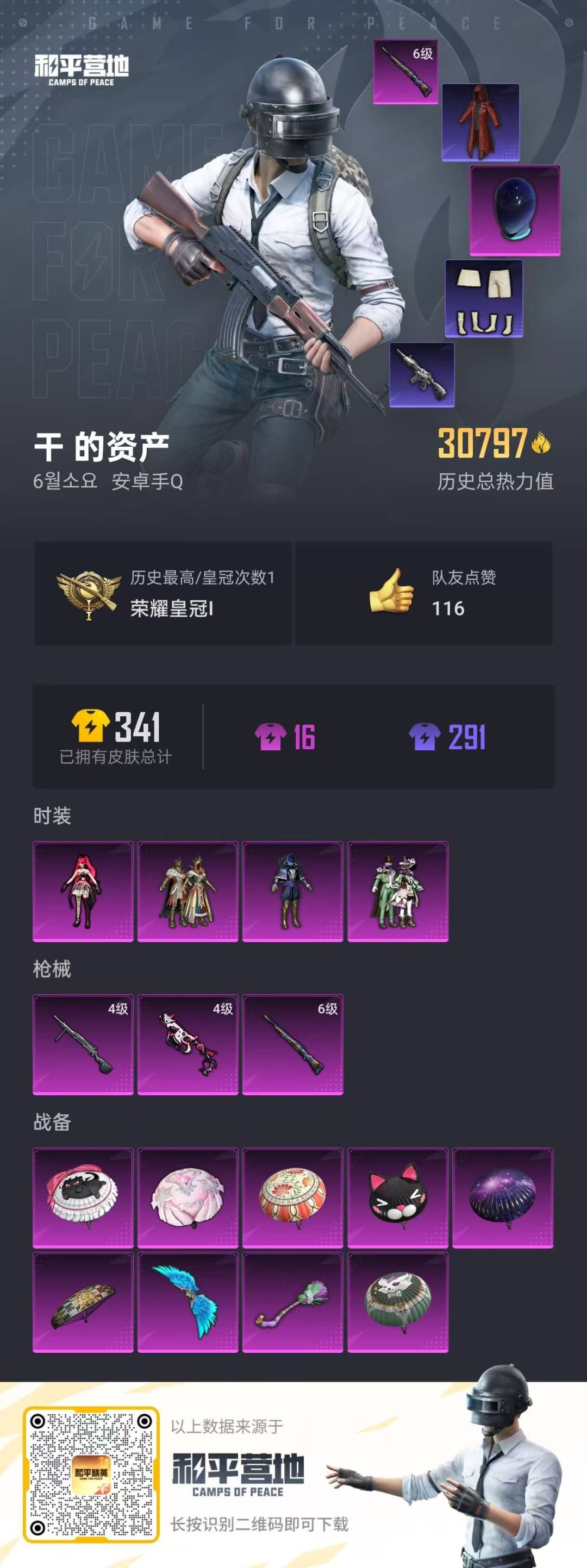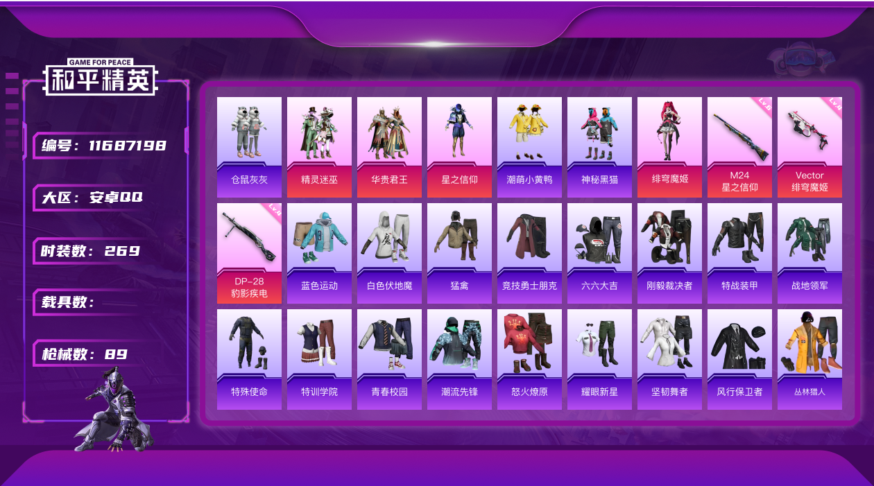 - PX_2057751- 安卓手Q-12王牌印记-有战神框-8粉装-10特效枪-5载具-82769热力值-172套装-224枪皮-7卓越印记-7传奇印记 【8粉装】,初号机 觉醒Ver.,放客神游,洛天依,星穹咏叹调,智耀战神,千金淑猫,圣堂之誓,绚金战神 【10特效枪】SCAR-L-锦绣绵绵-5级 M416-女娲灵识-3级 M416-五爪金龙-7级 Kar98K-巳巳如意-5级 M24-镜域双华-