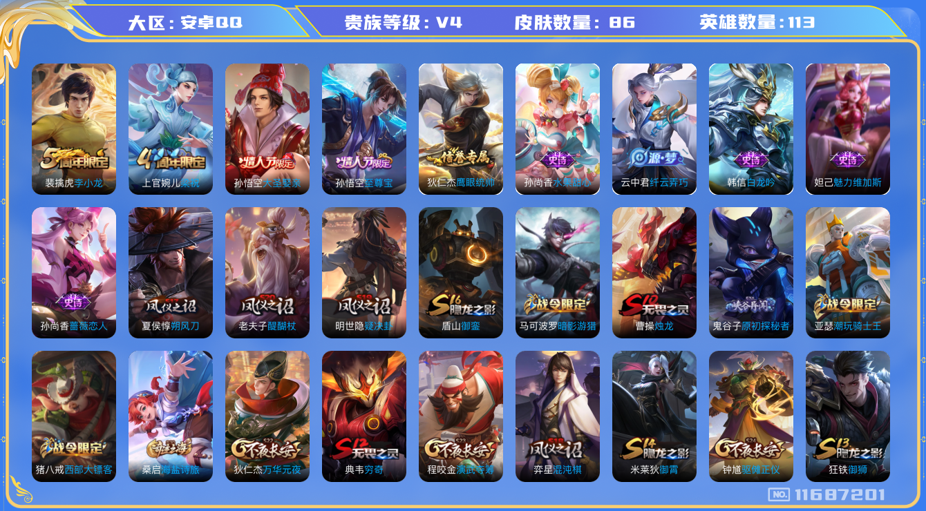 [11687201]V4 113英雄 86皮肤 可修改实名 珍宝阁皮:蔷薇恋人 限定皮:至尊宝,梁祝,李小龙,大圣娶亲 史诗皮:白龙吟,水果甜心,纤云弄巧,鹰眼统帅,魅力维加斯