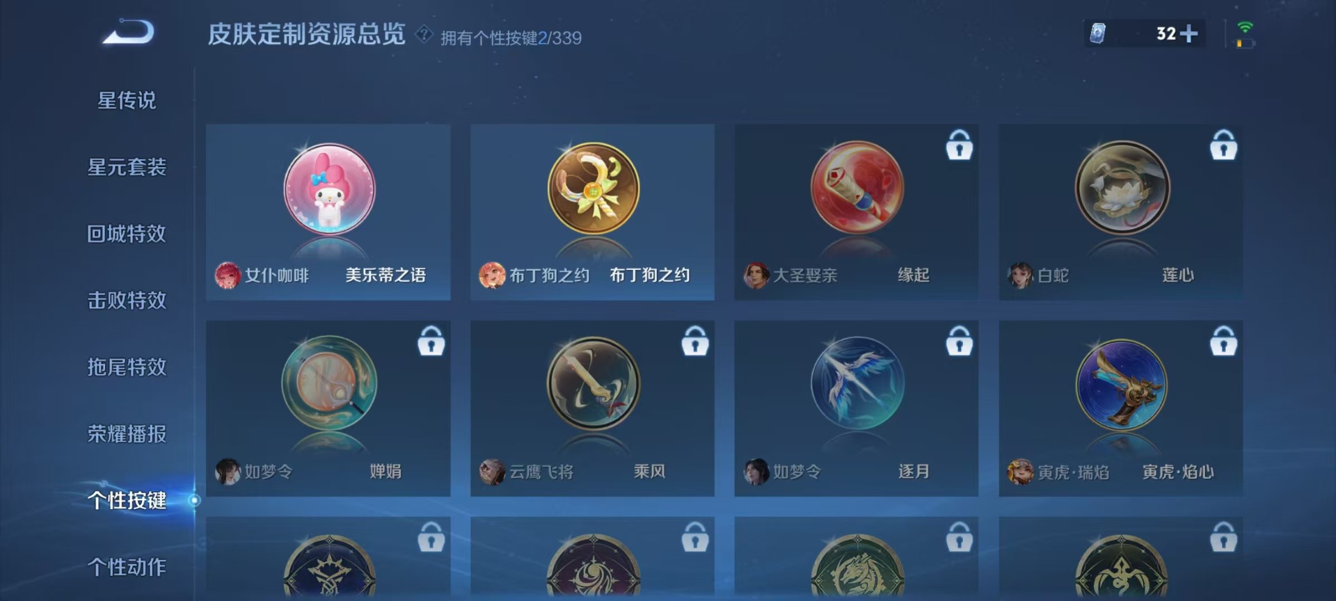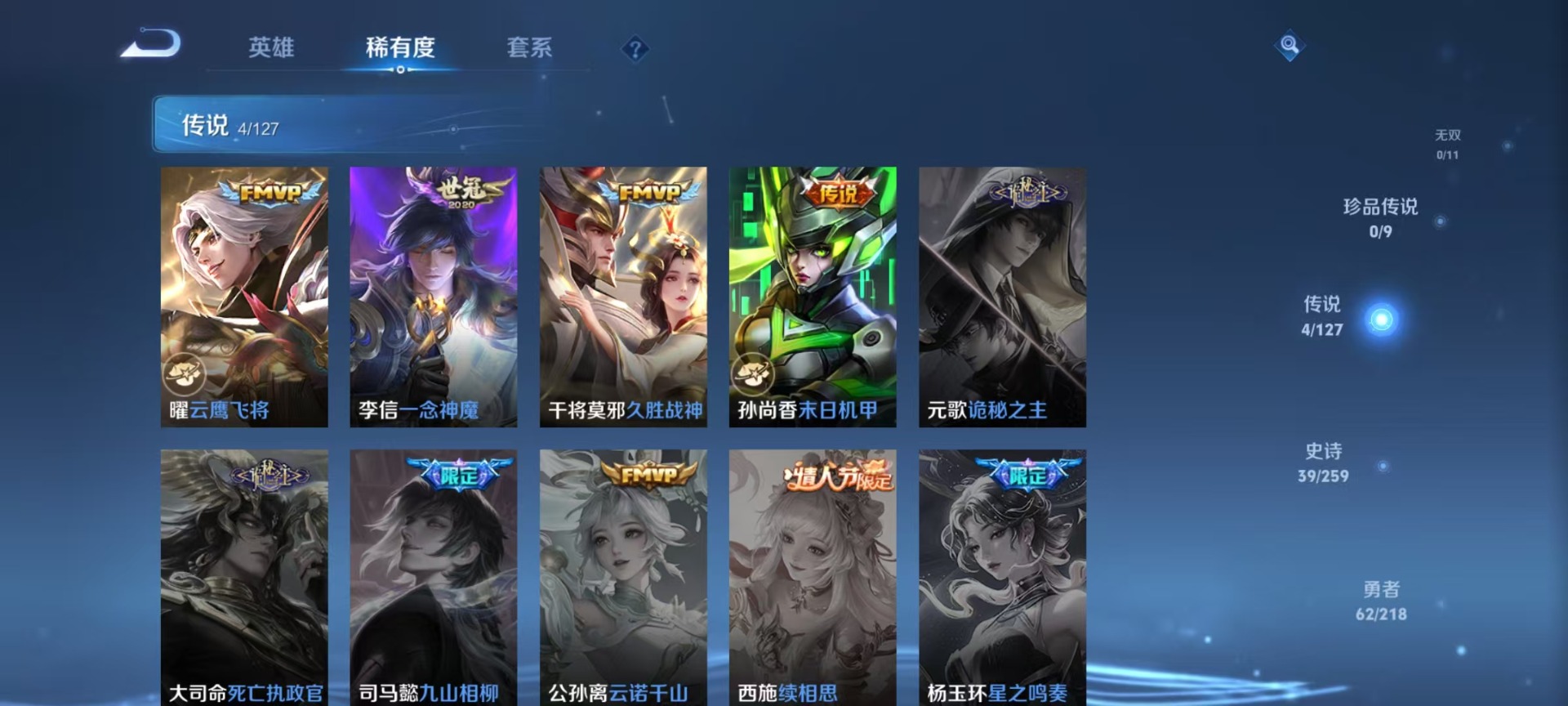 宫本武藏鬼剑武藏,兰陵王暗隐猎兽者,刘邦德古拉伯爵,夏侯惇乘风破浪,李白千年之狐,铠曙光守护者,曹操幽灵船长,廉颇地狱岩魂,程咬金功夫厨神,孙策猫狗日记,百里玄策原初追逐者,雅典娜冰冠公主,雅典娜黎明之约,韩信白龙吟,百里守约特工魅影,墨子龙骑士,吕布圣诞狂欢,露娜紫霞仙子,吕布末日机甲,王昭君偶像歌手,橘右京修罗