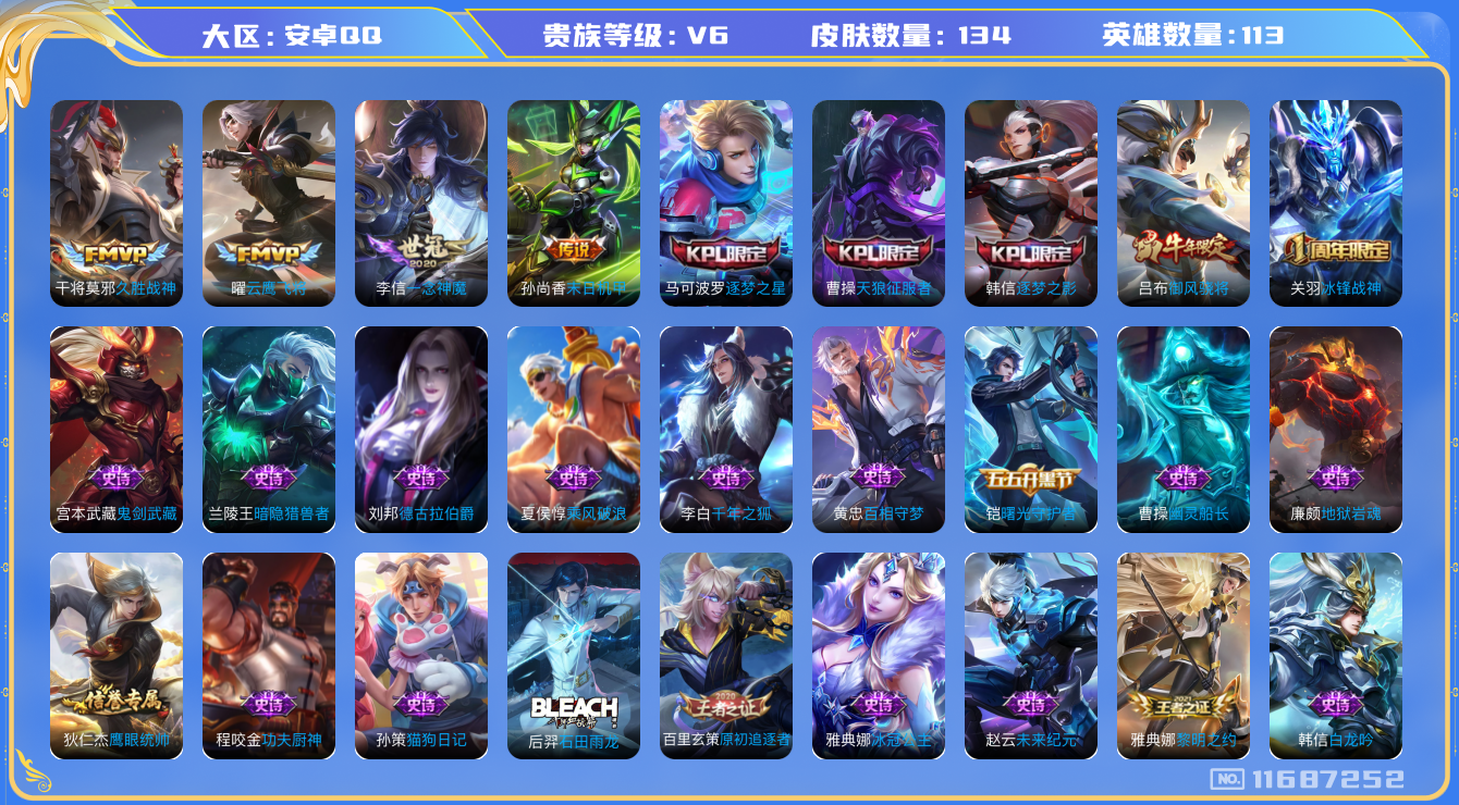 [11687252]V6 4传说 113英雄 134皮肤 可修改实名 优质装备:云鹰飞将(小将军),久胜战神,一念神魔,末日机甲-孙尚香(绿蚂蚱) 珍宝阁皮:万物之道 限定皮:冰锋战神,御风骁将(吕布年限),逐梦之星,天狼征服者,逐梦之影 史诗皮:石田雨龙,百相守梦-黄忠,紫霞仙子,白龙吟,特工魅影,千年之狐,冰冠公主,偶像歌手,龙骑士(小龙虾),末日机甲-吕布,猫狗日记-孙策,修罗,功夫厨神,德古拉伯爵,暗隐猎兽者,幽灵船长,鬼剑武藏,地狱岩魂,繁星吟游(呼啦呼啦),乘风破浪,曙光守护者,原初追逐者,圣诞狂欢,鹰眼统帅,魅力维加斯,黎明之约,未来纪元-赵云