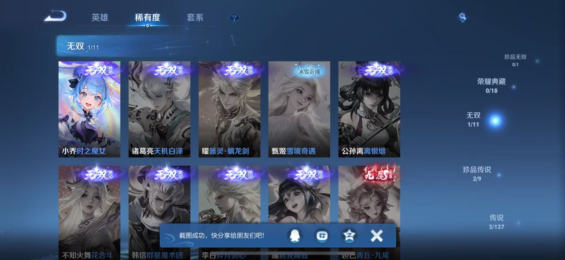 - [11884278]V10 4典藏 1无双 5珍品传说 59传说 125英雄 461皮肤 可修改实名 优质装备:无限飓风号(高达),九霄神辉(木兰典藏),赤影疾锋,韩信群星魔术团(韩信无双),拾光映像(瑶典藏),怪盗基德,大耳狗之梦,朽木白哉,黄金狮子座,黄金射手座,冠军飞将,云鹰飞将(小将军),绛天战甲(鸡嘴战神),猫影幻舞,久胜战神,炽阳神光,一念神魔,末日机甲-孙尚香(绿蚂蚱),地狱火,仲夏夜之梦(大飞蛾),音你心动-小乔,零号·赤焰,地狱之眼,李逍遥,时之恋人-刘备(电焊工),游龙清影(小青龙),淬星耀世,超时空战士-狄仁杰,末日机甲-孙策,挚爱之约,挚爱花嫁,无双飞将,音你闪耀(rap皮),燃星之曲,灼幽烈阳,妄想实况,妄想奇谈,遇见神鼓,鲁班七号-时之奇旅,霜月吟,澜逐花归海,艾琳觅芳踪,琥珀纪元马超,云中君群星魔术团,朵莉亚心动手记,涂山容容 珍品传说:时之奇旅-孙策,兔狲·蓬尾 传说皮:乘龙·问璇玑(孙尚香年限),乘龙·铭钟鼎(赵云年限),乘龙·淬吴钩(孙策年限),典韦战鼓燎原,云诺千山,铠冥王哈迪斯,祥瑞亨通,幻光神枪 珍宝阁皮:妄想食味,万物之道,玩趣恶龙 限定皮:愿照·岁时盈(虞姬年限),愿照·山河定(司空震年限),愿照·千秋盛(女娲年限),鸣野蒿,至尊宝,白虎志(电光耗子),太华(伽罗年限),异界灵契(白毛香),魔法小厨娘,白晶晶,时雨天司(水龙头),神威(电光马子),高山流水,诗剑行,怒海麟威,五谷丰年,青龙志(铠年限),武圣,天狼运算者,游园惊梦,梁祝,御风骁将(吕布年限),岱宗(典韦年限),天狼溯光者,奔雷神使(牛魔年限),祈雪灵祝(雪兔子),天狼绘梦者,李小龙,如梦令-后羿,默契交锋-花木兰,孙行者,大圣娶亲,冰霜恋舞曲,蜜橘之夏,枫霜尽,时之奇旅-妲己,神器·万象笔,山海·玄木吟(马可年限) 史诗皮:鸭鸭历险记-刘禅,飞车小橘子,器灵·浮梦炉,糖绘人间,狼魂孤将,化蝶舞,灵蛊蚀心,星界战将,龙之律动,雪豹·霜爪,藏狐·褐绒,布丁狗之誓,石田雨龙,茶境仙,怒海争锋,破空之剑,东方月初,蒙犽顽岩魄,埋骨钱,芈月浮光幕影,海诺心动手记,琥珀纪元伽罗,上官婉儿群星魔术团,蔬乡物语(鲁班七号),乘龙·聚宝船(安琪拉年限),乘龙·忆丹青(大乔年限),百相守梦-百里守约,百相守梦-黄忠,织梦人,遇见神鹿,紫霞仙子,苍穹之光,电玩小子(小书包),白龙吟,黄金分割率