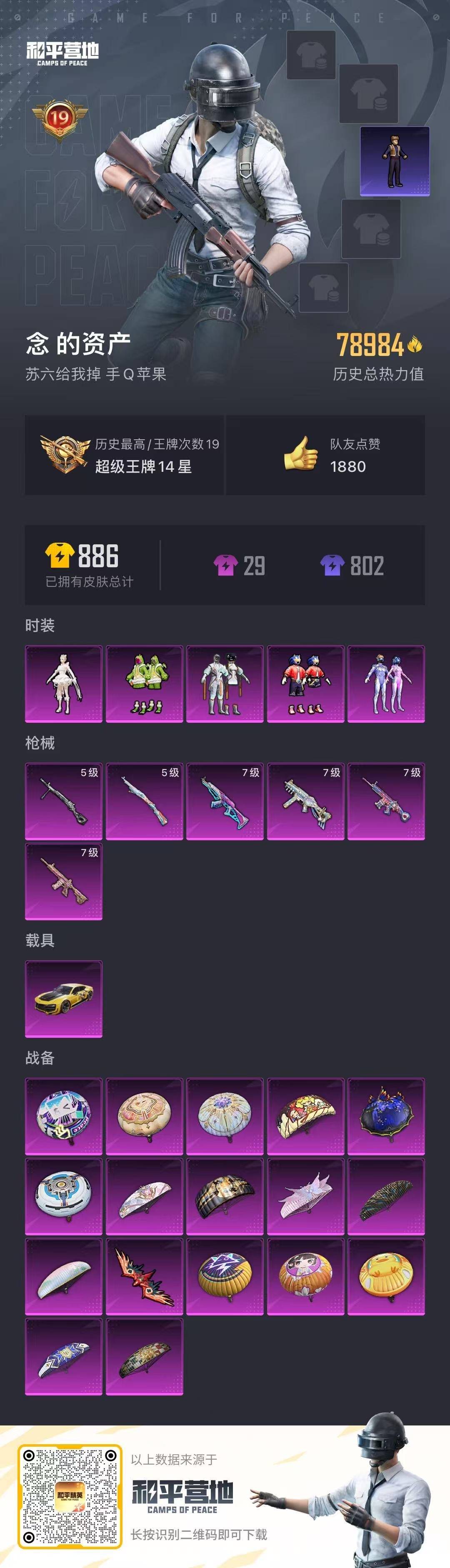 - [11446069]7粉装 8特效枪 9印记 可二次 可修改实名 热门装扮:时空协奏·心弦,千金淑猫,星穹咏叹调,缤纷油彩(猪妹猪脸妹),茉莉星,闲梦青缨,绝色倾城,迅捷狂鲨,呆萌铁蟹,深海小丑鱼 稀有枪皮:Kar98K-巳巳如意,GROZA-镜光银凌,AUG-许七安,AKS-74U-星穹咏叹调,AKM炫紫旋律,SCAR-L青春物语,AUG超新星,SCAR-L-锦绣绵绵 六级特效枪:六级SCAR-L-青春物语 五级特效枪:五级GROZA-镜光银凌,五级Kar98K-伏魔团,五级Kar98K-巳巳如意,五级SCAR-L-锦绣绵绵,五级AUG-超新星 四级特效枪:四级AKS-74U-星穹咏叹调 二级特效枪:二级AUG-许七安 紫色装扮:和煦暖阳,田园牧歌,轻风白浪,SS22特训,萌趣咩咩,SS20特训,SS21特训,暖心橘喵,娇憨猪猪,幻彩翩翩,飞狐塔尔斯,SS30特训套装,妙红点点,SS23特训,SS31特训套装,SS33特训套装,青涩时光,旭日情侣,星梦畅游,艾克斯奥特曼,SS18特训,SS19特训,冰川特警,瑞龙福将,团圆交子,SS17特训,虎虎生威吉莉,蓝彩潮人,迎春赐吉,空岛之星,空投萌叽,绮丽涂鸦,缤纷果语,长空猛禽,龙魂突击队,龙的传人,魅力单车,鹤鸣,麻辣教官,黄色名流,黑色伏地魔,福星高照,沙漠毒蛇,特殊使命,特训学院,猎鹰,猛禽,甜蜜菠萝,海岛探路者,深蓝色名流,湖蓝色名流,滨海假日,滨海厨神,牛气满满,热血青春,SS29特训,冰公主,SS28特训,卖崽青蛙,燕燕于飞,鱼渊荷华,玉兔迎春,青团波波,糖糖葫芦,竞技名士,都市丽猫,摩登魅猫,情公主,惊鸿侠骨,SS25特训,SS24特训(SS24特训套装),锦衣飞扬,幻羽潜行,焰鹰斗篷,SS27特训,粉红小猪,浪漫天命,小丑鱼,华灯初上,黑夜传说,星渊小夜曲,大橘大利,星影赞美诗,粉恋花,蓝冰羽,紫幽梦,SS32特训服(SS32特训套装),瑰梦爱神,青玉碎影,绯格组合,智谋强哥,萌黄之夏,弄潮海豚 优质战备:忍者神龟降落伞,镜光幻境飞行器(镜光幻境飞行翼),千金淑猫降落伞,鬼刀降落伞,炫光之旅降落伞,暗夜鎏金降落伞