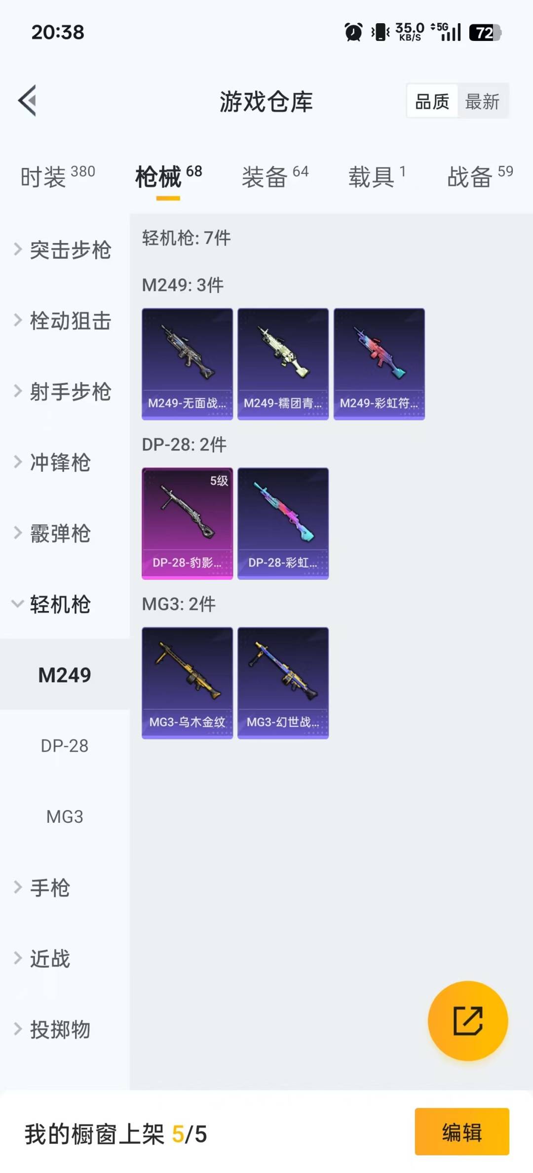 - [12088487]总资产:99.5M 2干员外观 1近战传说 13传说枪械 哈夫币:681.212K 可二次 可修改实名 优质装备:近战-北极星,Vector冲锋枪-美杜莎 烽火地带段位:钻石 全面战场段位:无段位 传说武器皮肤:SR-25射手步枪-水墨云图,AS Val突击步枪-蛇年祥瑞,SMG45冲锋枪-骑士,复合弓-黑-天际线,K437突击步枪-北极星,QCQ171冲锋枪-北极星,725双管霰弹枪-送葬人-无题密令,CAR-15突击步枪-阿米娅,AK-12突击步枪-夜鹰,M4A1突击步枪-蚀金玫瑰,CAR-15突击步枪-黑鹰坠落 史诗武器皮肤:M1014霰弹枪-潜袭者,SR-3M紧凑突击步枪-英雄,SR-25射手步枪-战场英杰,PKM通用机枪-蝮蛇,AUG突击步枪-蝮蛇,M700狙击步枪-蝮蛇,G3战斗步枪-战场英杰,SG552突击步枪-尖端治疗,M1014霰弹枪-林中猎手,P90冲锋枪-暗影猎手,PKM通用机枪-守夜人,AS Val突击步枪-尖端治疗,M700狙击步枪-守夜人,Ash-12战斗步枪-守夜人,SR-25射手步枪-尖端治疗,MP5冲锋枪-深海恐惧,勇士冲锋枪-深海恐惧,SG552突击步枪-深海恐惧,AKM突击步枪-林中猎手,M16A4突击步枪-竞赛选手,M250通用机枪-囚徒,SV-98狙击步枪-林中猎手,PSG-1射手步枪-无垢,PKM通用机枪-荒野求生,QBZ95-1突击步枪-曙光,沙漠之鹰-曙光,Vector冲锋枪-阿萨拉文明,SVD狙击步枪-阿萨拉工艺,S12K霰弹枪-曙光,PKM通用机枪-英雄,M700狙击步枪-竞技风,QSZ92G-风林火山,93R-博士 干员外观:红狼-蚀金玫瑰,威龙-飞虎