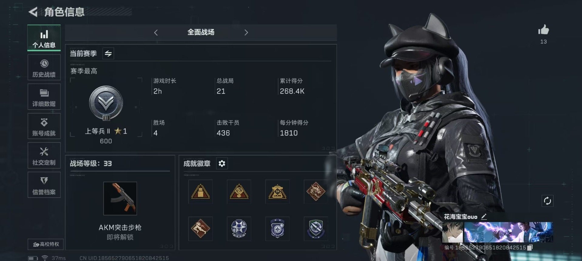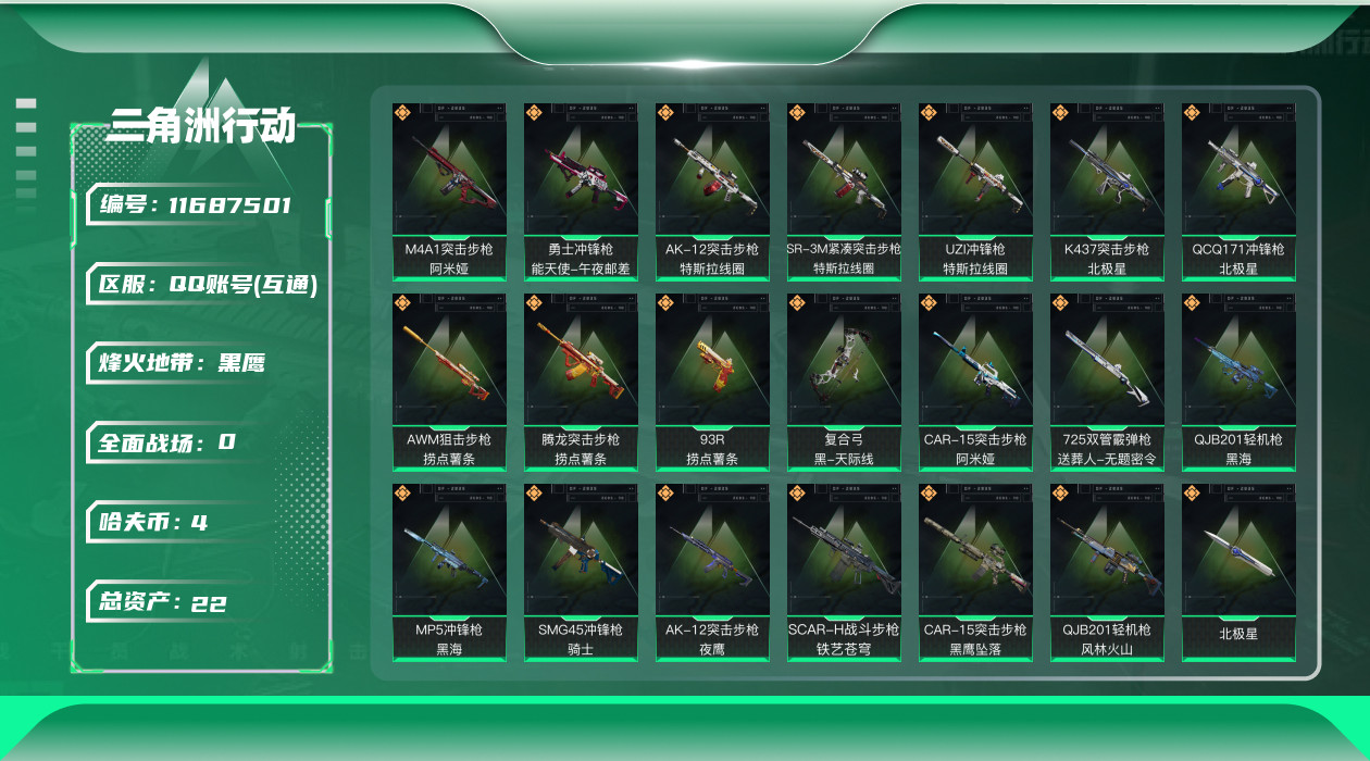 [11687501]总资产:22.1M 2近战传说 22传说枪械 哈夫币:4.521K 高级安全箱(2×3)9.15号到期 可二次 可修改实名 优质装备:近战-黑海,近战-北极星 烽火地带段位:黑鹰 全面战场段位:上等兵 传说武器皮肤:QJB201轻机枪-风林火山,SCAR-H战斗步枪-铁艺苍穹,AK-12突击步枪-夜鹰,SMG45冲锋枪-骑士,M4A1突击步枪-阿米娅,CAR-15突击步枪-阿米娅,复合弓-黑-天际线,AWM狙击步枪-捞点薯条,QCQ171冲锋枪-北极星,腾龙突击步枪-捞点薯条,93R-捞点薯条,AK-12突击步枪-特斯拉线圈,SR-3M紧凑突击步枪-特斯拉线圈,UZI冲锋枪-特斯拉线圈,勇士冲锋枪-能天使-午夜邮差,725双管霰弹枪-送葬人-无题密令,K437突击步枪-北极星,MP5冲锋枪-黑海,QJB201轻机枪-黑海,CAR-15突击步枪-黑鹰坠落 史诗武器皮肤:PKM通用机枪-荒野求生,SR-3M紧凑突击步枪-荒野求生,SVD狙击步枪-荒野求生,MP7冲锋枪-无垢,沙漠之鹰-曙光