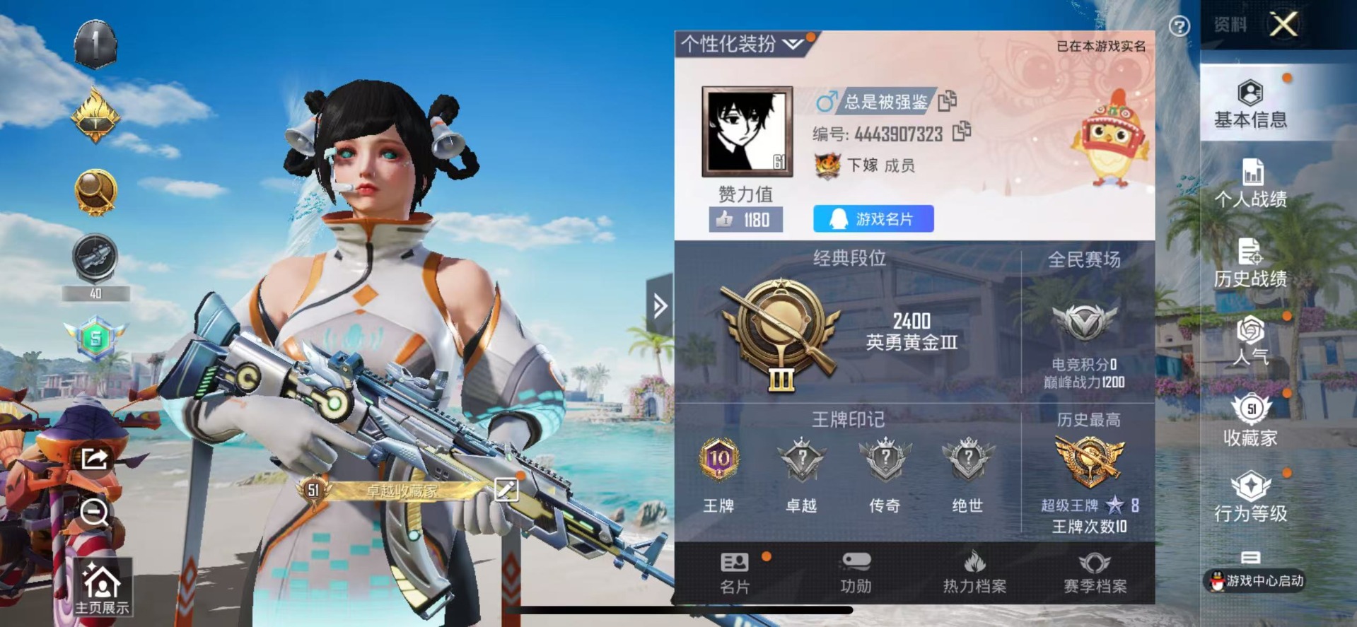 [11687529]2粉装 4特效枪 1载具 10印记 可二次 可修改实名 优质装备:AKM炫紫旋律,M416五爪金龙,M416心之恋语,智能音符,M762激战未来,锦绣火鲤 热门装扮:软萌银虎,蔷薇魔法师,暗夜魅影 载具:鬼马风驰 五级特效枪:五级M762-激战未来,五级Kar98K-伏魔团,五级M416-五爪金龙 四级特效枪:四级M416-心之恋语 紫色装扮:SS22特训,SS21特训,六六大吉,冰川特警,冷焰舞者,SS20特训,青春冒险家,潮流游乐家,SS15特训,鹤发童颜,时空追击者,暴风机械师,SS16特训,快乐星愿,银白舞王,SS13特训,治愈之星,迅捷之星,科技之星,SS14特训,萌趣颜团子,特种颜团子,飞驰魅影,音速流光,SS19特训,吉莉礼服,雪兔飞飞,瑞龙福将,团圆交子,SS17特训,SS18特训,都市漫游者,长空猛禽,耀眼新星,蓝色运动,虎虎生威吉莉,飞行日记,魅力单车,黎明保卫者,朋克治安官,极速红龙,格斗先锋,滨海假日,夏日音浪,幻世战舞者,怒火燎原,湖蓝色名流,滨海厨神,白熊同盟,破晓战魂,神秘领域,甜蜜告白,福星高照,牛气冲天,灰色格斗者,炫蓝之夏,热血青春,牛气满满,特战装甲,特殊使命,特训学院,狂沙舞者,镭射皇者,竞技名士,SS24特训(SS24特训套装),金羽特工,萌主吾皇,摇滚狂鲨,迷域探索者,玲珑飞花,SS8特训,丝绸行者,神秘舞者,粉甜马卡龙,白虎圣者,原初圣火,逆风勇士,SS12特训,韶华初心,辉星之火,纯白誓言,众神之王,智慧之神,SS9特训,舞夜骑士,风华少年志,SS10特训,暗夜契约,机械英豪,机械征服者,SS11特训,萌黄之夏,金耀舞者,蓝调潮人,贵族骑装,街舞达人,街舞之王,海上生明月 优质战备:炫紫旋律降落伞,繁花小夜曲降落伞,飞行器-心之恋语(心之恋语飞行翼),扶摇飞仙降落伞,潮汐统领降落伞,阿狸红降落伞,心之恋语降落伞,香水柠檬降落伞