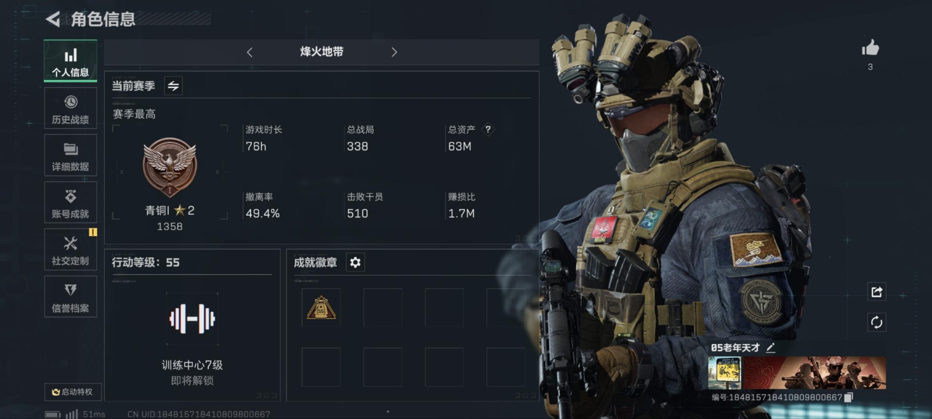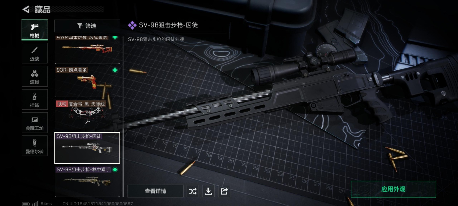 [11687545]总资产:63M 9传说枪械 哈夫币:1.084K 可二次 可修改实名 安全保护中 优质装备:顶级安全箱(3x3) 烽火地带段位:青铜 全面战场段位:无段位 传说武器皮肤:93R-捞点薯条,AWM狙击步枪-捞点薯条,腾龙突击步枪-捞点薯条,CAR-15突击步枪-阿米娅,SR-3M紧凑突击步枪-特斯拉线圈,UZI冲锋枪-特斯拉线圈,勇士冲锋枪-能天使-午夜邮差,复合弓-黑-天际线,M4A1突击步枪-阿米娅 史诗武器皮肤:SV-98狙击步枪-林中猎手,SV-98狙击步枪-囚徒