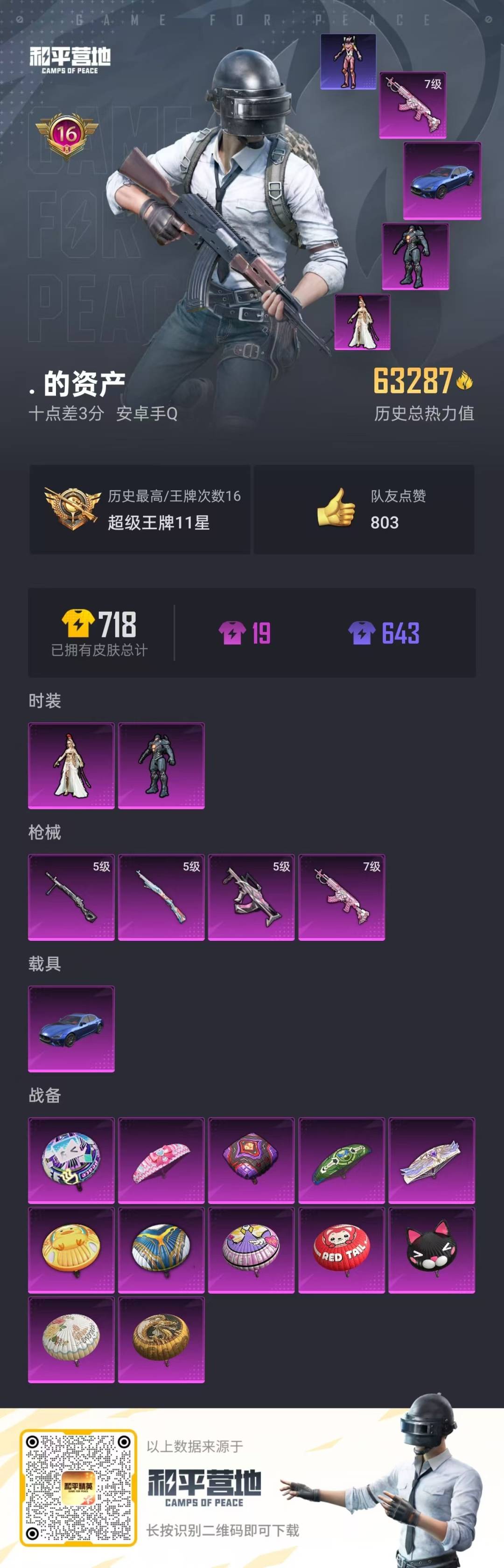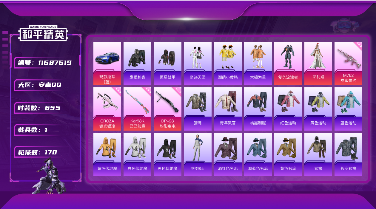 [11687619]2粉装 4特效枪 1载具 16印记 可二次 可修改实名 身法装备:8号机(新粉螳螂),Mark.06(新蓝螳螂),萌熊伴侣背包(粉熊背包) 优质装备:玛莎拉蒂Ghibli(蓝),萌熊伴侣背包(粉熊背包),M762甜蜜誓约,七级M762-甜蜜誓约,GROZA-镜光银凌,萨利娅,Kar98K-巳巳如意 热门装扮:复仇流浪者,奇迹天团,大橘为重,潮萌小黄鸭,恒星战甲,鹰眼刺客 稀有枪皮:DP-28-豹影疾电 五级特效枪:五级GROZA-镜光银凌,五级Kar98K-巳巳如意,五级DP-28-豹影疾电 紫色装扮:SS22特训,娇憨猪猪,萌趣咩咩,SS21特训,SS31特训套装,SS5特训,人气偶像,六六大吉,冰川特警,冷焰舞者,凛冬战士,北国孤狼,SS30特训套装,SS33特训套装,青涩时光,SS20特训,SS15特训,艾克斯奥特曼,闪银刀客,SS16特训,SS13特训,浪漫樱花,治愈之星,迅捷之星,科技之星,SS14特训,特种颜团子,猎梦纪元,SS19特训,吉莉礼服,甜心亚梦,虚音幻奏,瑞龙福将,团圆交子,SS17特训,SS18特训,都市魅力,酒红色名流,酷潮明星,长空猛禽,雪山征服者,雪山精英,霓虹街区,青年教官,青春校园,风暴特警,缤纷果语,耀眼新星,蓝彩潮人,蓝色运动,虎虎生威吉莉,街头潮人,跃动心情,魅力单车,麻辣教官,黄色伏地魔,黄色名流,黄色运动,黎明保卫者,黑色伏地魔,龙的传人,龟仙人,冰河战士,龙魂突击队,蝶变,香桃花海,和平特警,沙漠毒蛇,极地朋克,极速红龙,橘黑制服,派对绅士,涂山之恋,深蓝色名流,幻影武者,圣诞大吉,坚韧舞者,夏日音浪,夜莺强袭者,完美偶像,帅气教官,幻世战舞者,时尚圣诞,战地督导,战地菁英,探宝勇士,湖蓝色名流,绮丽涂鸦,甜蜜菠萝,疯狂小兔子,白熊同盟,白色伏地魔,破晓战魂,破蛋小黄鸡,神秘领域,甜蜜告白,福星高照,空岛之星,空投萌叽,竞技勇士朋克,竞技达人朋克,红色运动,牛气冲天,灰色格斗者,灼焰舞者,炫蓝之夏,热血青春,熔岩使者,牛气满满,猛禽,狂沙舞者,猎鹰,雏菊兔兔,萝兰蝴蝶,SS29特训,达芬奇,星途旅人,SS28特训,8号机(新粉螳螂),Mark.06(新蓝螳螂),鱼渊荷华,玉兔迎春,燕燕于飞,巳巳如意,都市丽猫,青团波波,糖糖葫芦,竞技名士,街头风暴,SS24特训(SS24特训套装),SS25特训,粉红小猪,SS27