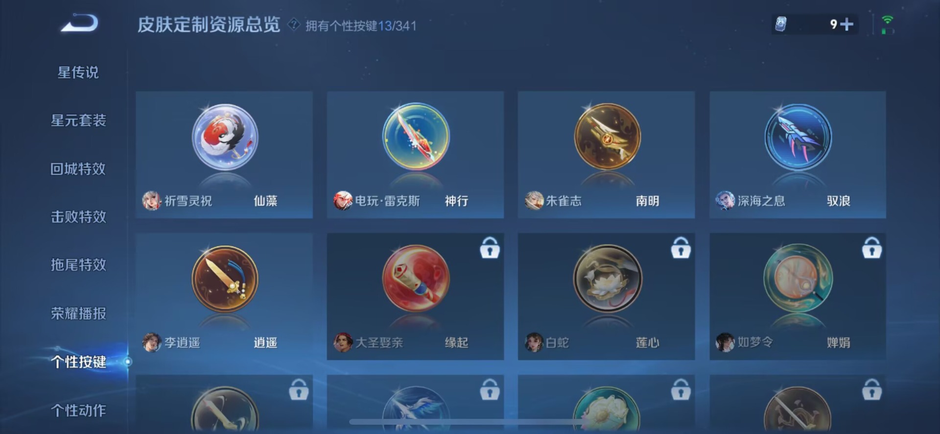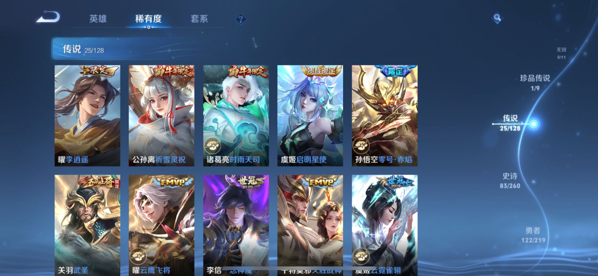 甄姬女儿国国王,伽罗天狼溯光者,赵云百木心枪,干将莫邪冰霜恋舞曲,诸葛亮时雨天司,公孙离祈雪灵祝,司空震愿照·山河定,裴擒虎李小龙,裴擒虎寅虎·赤拳,上官婉儿梁祝,上官婉儿天狼绘梦者,李白诗剑行,花木兰青春决赛季,马可波罗逐梦之星,马可波罗深海之息,桑启鸣野蒿,孙悟空孙行者,孙悟空大圣娶亲,孙悟空至尊宝,马超神威,韩信傲雪梅枪,百里守约朱雀志,关羽武圣,关羽冰锋战神