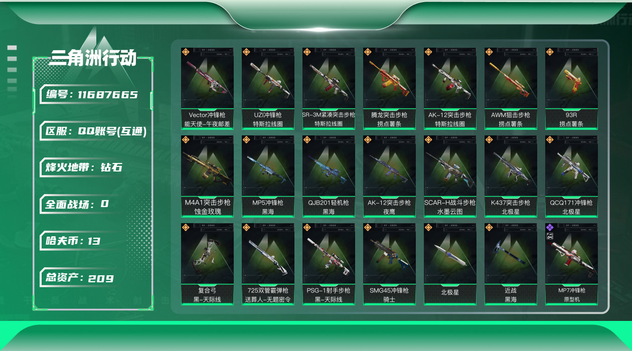 [11687665]总资产:209M 2干员外观 2近战传说 20传说枪械 哈夫币:13.932K 高级安全箱(2×3)9.15号到期 可二次 可修改实名 优质装备:近战-黑海,近战-北极星 烽火地带段位:钻石 全面战场段位:军士长 传说武器皮肤:SCAR-H战斗步枪-水墨云图,AK-12突击步枪-夜鹰,SMG45冲锋枪-骑士,93R-捞点薯条,PSG-1射手步枪-黑-天际线,AWM狙击步枪-捞点薯条,腾龙突击步枪-捞点薯条,AK-12突击步枪-特斯拉线圈,SR-3M紧凑突击步枪-特斯拉线圈,UZI冲锋枪-特斯拉线圈,Vector冲锋枪-能天使-午夜邮差,复合弓-黑-天际线,725双管霰弹枪-送葬人-无题密令,K437突击步枪-北极星,QCQ171冲锋枪-北极星,MP5冲锋枪-黑海,M4A1突击步枪-蚀金玫瑰,QJB201轻机枪-黑海 史诗武器皮肤:AK-12突击步枪-原型机(典藏),MP7冲锋枪-原型机(典藏),M700狙击步枪-蝮蛇,PKM通用机枪-蝮蛇,Ash-12战斗步枪-守夜人,M16A4突击步枪-竞赛选手,PKM通用机枪-守夜人,AS Val突击步枪-尖端治疗,M700狙击步枪-守夜人,SG552突击步枪-尖端治疗,SR-25射手步枪-尖端治疗,PKM通用机枪-荒野求生,SG552突击步枪-深海恐惧,AKM突击步枪-林中猎手,MP5冲锋枪-青枳,G3战斗步枪-锡兰,SR-3M紧凑突击步枪-荒野求生,M1014霰弹枪-林中猎手,SV-98狙击步枪-林中猎手,PTR-32突击步枪-英雄,SVD狙击步枪-荒野求生,M250通用机枪-囚徒,SV-98狙击步枪-囚徒,SCAR-H战斗步枪-囚徒,腾龙突击步枪-无垢,MP7冲锋枪-无垢,PSG-1射手步枪-无垢,沙漠之鹰-曙光,SVD狙击步枪-阿萨拉工艺,S12K霰弹枪-曙光 干员外观:红狼-蚀金玫瑰,骇爪-水墨云图