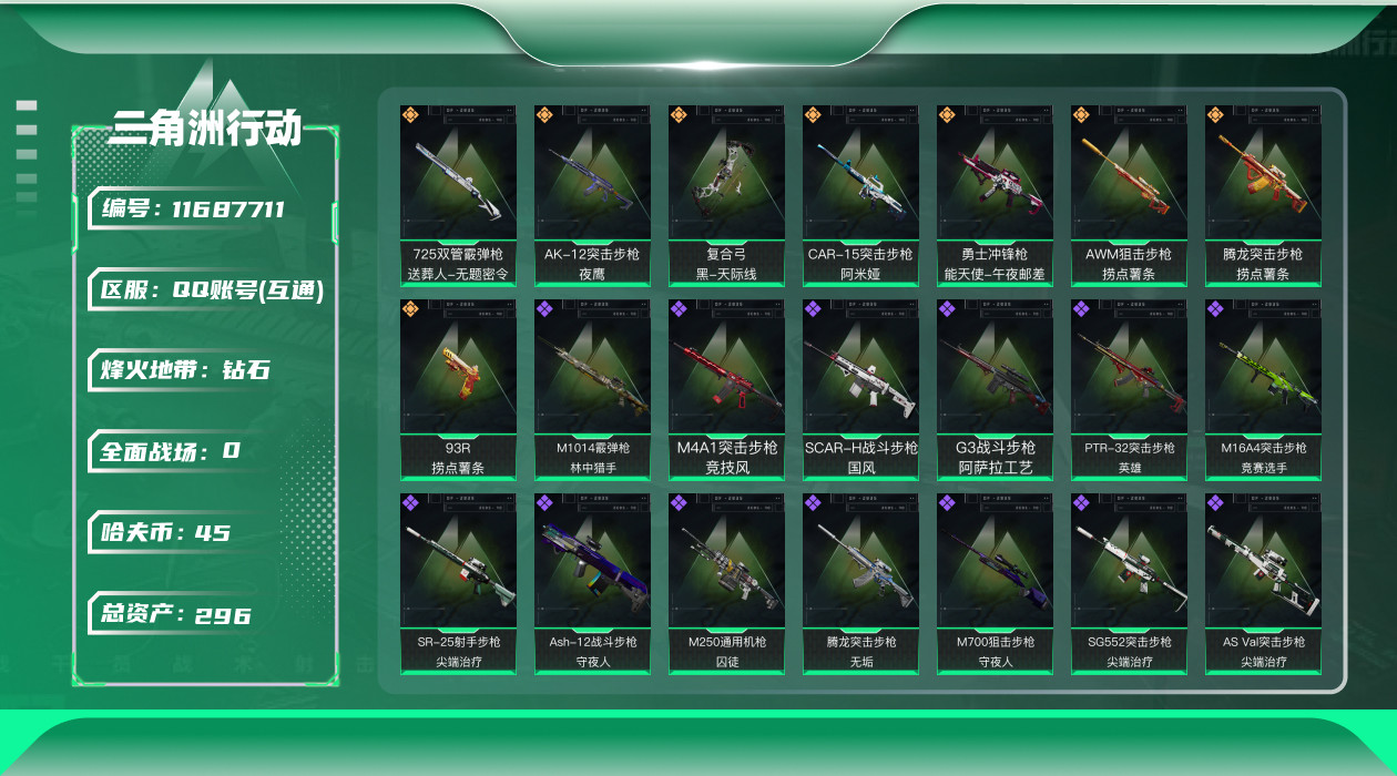 [11687711]总资产:296.3M 3干员外观 8传说枪械 哈夫币:45.231K 顶级安全箱(3×3)9.15号到期 可二次 可修改实名 优质装备:顶级安全箱(3x3) 烽火地带段位:钻石 全面战场段位:军士长 传说武器皮肤:AWM狙击步枪-捞点薯条,腾龙突击步枪-捞点薯条,93R-捞点薯条,勇士冲锋枪-能天使-午夜邮差,复合弓-黑-天际线,725双管霰弹枪-送葬人-无题密令,CAR-15突击步枪-阿米娅,AK-12突击步枪-夜鹰 史诗武器皮肤:AUG突击步枪-蝮蛇,SG552突击步枪-尖端治疗,M1014霰弹枪-林中猎手,PKM通用机枪-守夜人,AS Val突击步枪-尖端治疗,M700狙击步枪-守夜人,Ash-12战斗步枪-守夜人,SR-25射手步枪-尖端治疗,MP5冲锋枪-深海恐惧,AKM突击步枪-林中猎手,M16A4突击步枪-竞赛选手,M250通用机枪-囚徒,SV-98狙击步枪-林中猎手,PTR-32突击步枪-英雄,SV-98狙击步枪-囚徒,腾龙突击步枪-无垢,MP7冲锋枪-无垢,PSG-1射手步枪-无垢,SVD狙击步枪-荒野求生,SR-3M紧凑突击步枪-荒野求生,PKM通用机枪-荒野求生,M4A1突击步枪-竞技风,SCAR-H战斗步枪-国风,G3战斗步枪-阿萨拉工艺,SVD狙击步枪-阿萨拉工艺 干员外观:无名-夜鹰,露娜-黑·天际线,蛊-能天使·午夜邮差
