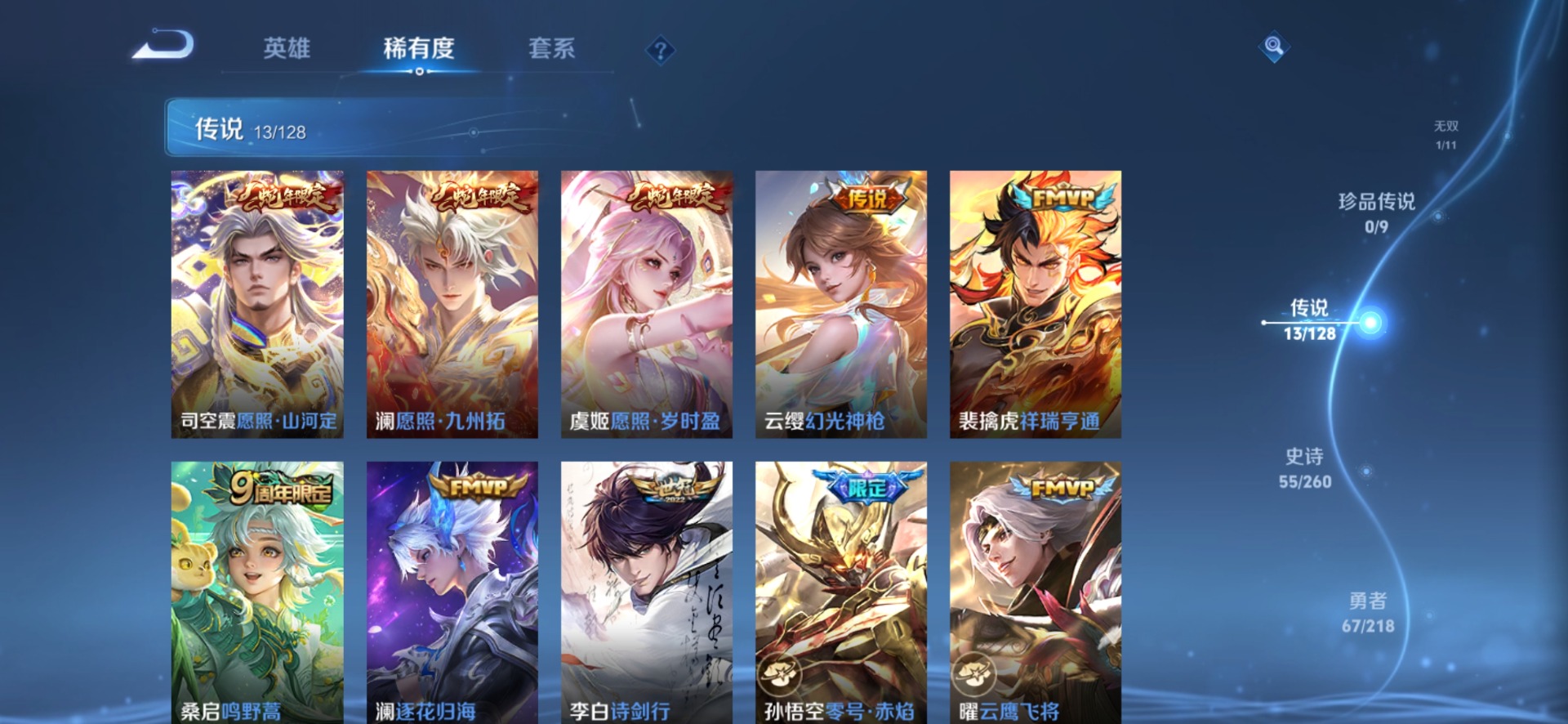 [11687743]V7 1典藏 1无双 13传说 122英雄 147皮肤 可修改实名 优质装备:星域神启(倪克斯贼亮),器灵·螭龙剑,黄金狮子座,云鹰飞将(小将军),久胜战神,一念神魔,零号·赤焰,澜逐花归海 传说皮:祥瑞亨通,幻光神枪 珍宝阁皮:玩趣恶龙 限定皮:愿照·九州拓(澜年限),愿照·岁时盈(虞姬年限),愿照·山河定(司空震年限),逐霄战戟,鸣野蒿,傲雪梅枪,诗剑行,岱宗(典韦年限),天狼溯光者,逐梦之音,引擎之心,百木心枪,玉兔公主,山海·玄木吟(马可年限) 史诗皮:鸭鸭历险记-刘禅,器灵·浮梦炉,糖绘人间,化蝶舞,谪仙醉月,龙之律动,石田雨龙,茶境仙,怒海争锋,破空之剑,决胜骁骑,百相守梦-百里守约,紫霞仙子,电玩小子(小书包),黄金分割率,特工魅影,千年之狐,江河有灵,百解令(蒙犽),偶像歌手,女仆咖啡,水果甜心,天才门将,星夜王子,功夫厨神,暗隐猎兽者,幽灵船长,鬼剑武藏,心灵战警,天秀·启明,地狱岩魂,纤云弄巧,拒霜思,乘风破浪,逐浪之夏,水晶猎龙者,曙光守护者,箭羽风息,金属风暴,圣诞狂欢,鹰眼统帅,魅力维加斯,黎明之约,未来纪元-赵云