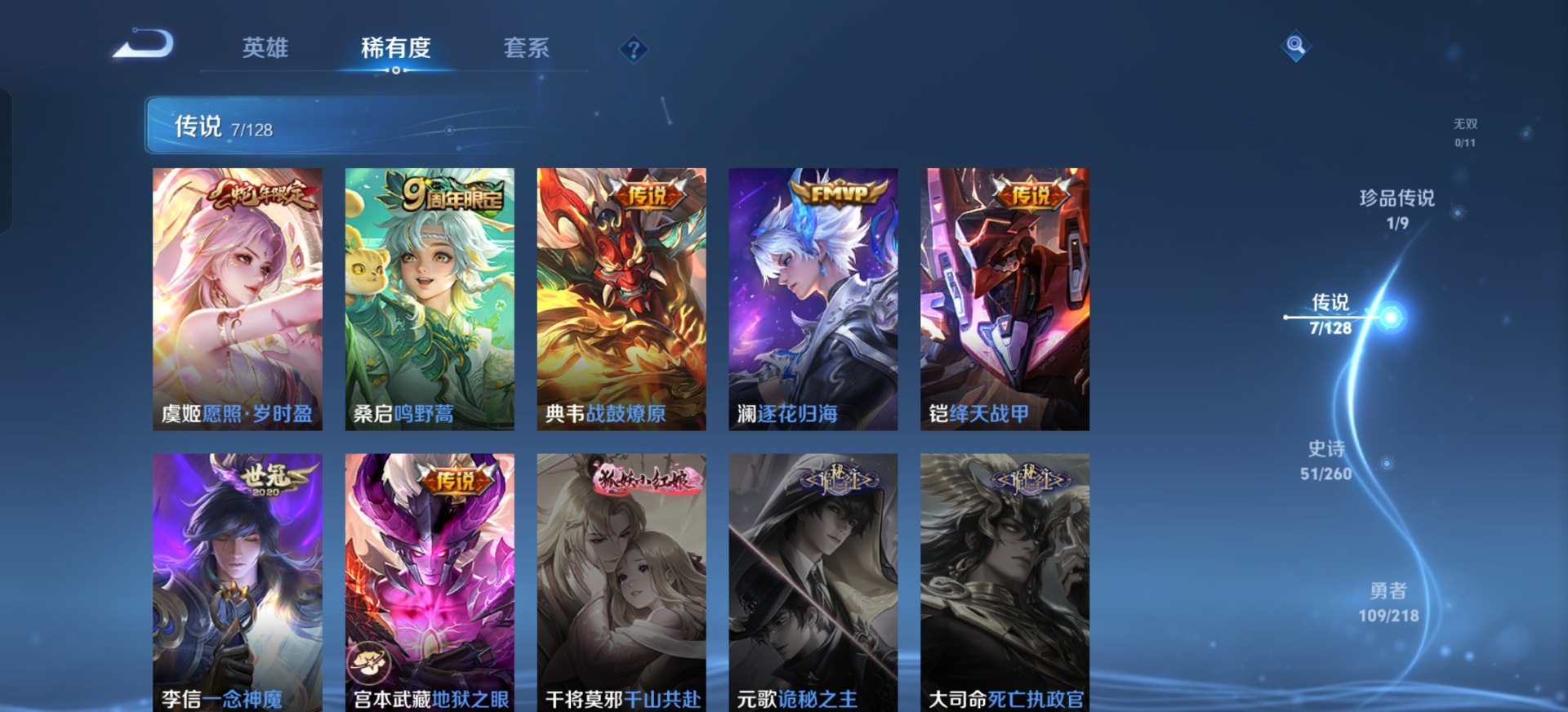 大乔猫狗日记,刘邦德古拉伯爵,夏侯惇乘风破浪,铠曙光守护者,曹操幽灵船长,廉颇地狱岩魂,伽罗箭羽风息,小乔缤纷独角兽,露娜紫霞仙子,吕布末日机甲,诸葛亮黄金分割率,司马懿暗渊魔法,刘禅天才门将,宫本武藏鬼剑武藏,兰陵王暗隐猎兽者,花木兰水晶猎龙者,李白千年之狐,夏洛特永昼,白起星夜王子,亚瑟心灵战警,嬴政摇滚巨星,程咬金功夫厨神,雅典娜冰冠公主,李元芳逐浪之夏,百里守约特工魅影,墨子金属风暴,蔡文姬舞动绿茵,王昭君偶像歌手,橘右京修罗