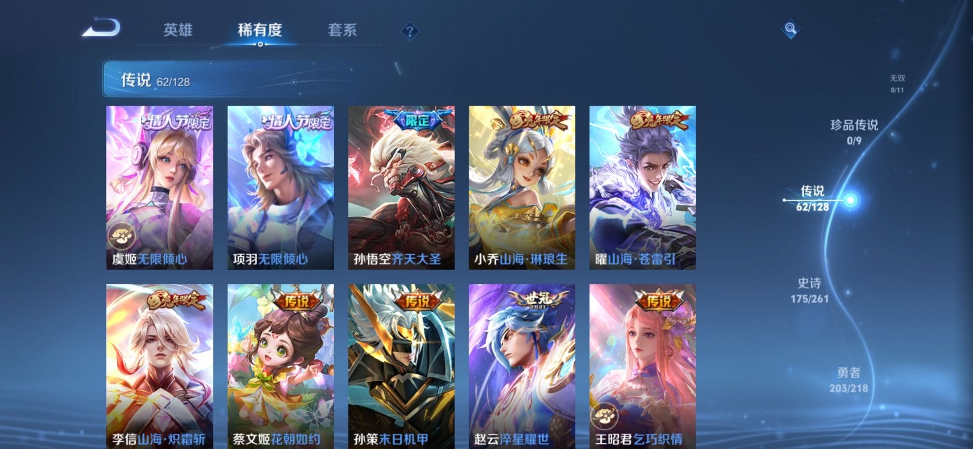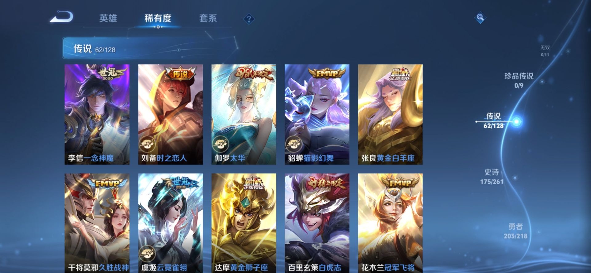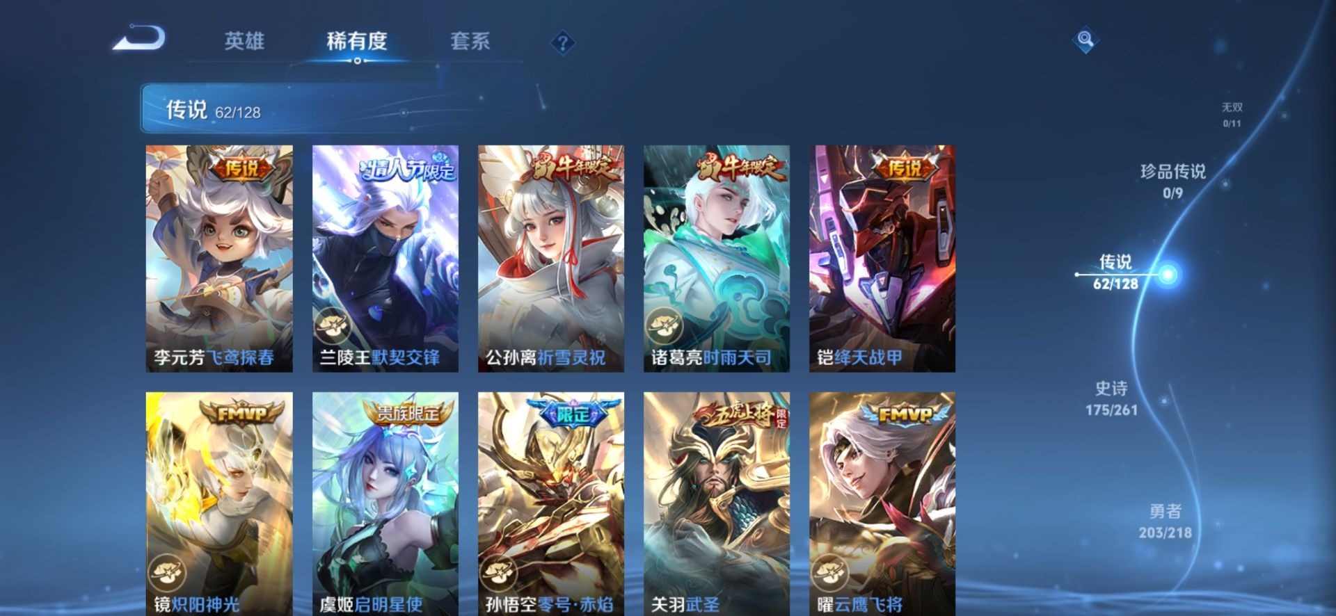 - PX_2095953-【金标女娲】贵族等级: V7 英雄数: 124 皮肤数: 289 荣耀水晶: 最初的交响 无双皮: 小乔时之魔女 珍品传说: 怪盗基德,时之奇旅-孙策 星传说: 星际治安官 传说皮: 冠军飞将,久胜战神,炽阳神光,超时空战士-狄仁杰,挚爱之约,无双飞将,画中仙,浮生妄,落雪白狼,幻光神枪,续相思 限定皮: 遇见飞天,李小龙,游园惊梦,引擎之心,白鹤梁神女,异界灵契,冰霜恋舞曲