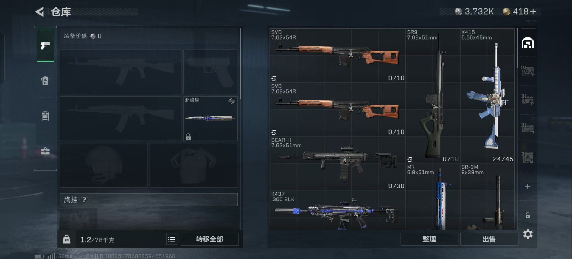 [11687785]总资产:49.6M 5干员外观 2近战传说 26传说枪械 哈夫币:3.732K 高级安全箱(9.17到期) 可二次 可修改实名 优质装备:近战-影锋,近战-北极星,K416突击步枪-命运(典藏),QBZ95-1突击步枪-王牌之剑(典藏) 烽火地带段位:钻石 全面战场段位:上等兵 传说武器皮肤:QJB201轻机枪-风林火山,SR-25射手步枪-水墨云图,SCAR-H战斗步枪-水墨云图,M1014霰弹枪-影锋,AWM狙击步枪-影锋,SCAR-H战斗步枪-铁艺苍穹,AK-12突击步枪-夜鹰,G18-飞虎,M16A4突击步枪-狩猎时刻,M4A1突击步枪-阿米娅,CAR-15突击步枪-阿米娅,复合弓-黑-天际线,Vector冲锋枪-狩猎时刻,G3战斗步枪-狩猎时刻,QCQ171冲锋枪-北极星,勇士冲锋枪-能天使-午夜邮差,725双管霰弹枪-送葬人-无题密令,K437突击步枪-北极星,M4A1突击步枪-蚀金玫瑰,QBZ95-1突击步枪-破军,CAR-15突击步枪-黑鹰坠落,Vector冲锋枪-能天使-午夜邮差 史诗武器皮肤:K416突击步枪-暗鸦,SR-3M紧凑突击步枪-英雄,QBZ95-1突击步枪-ACE,M4A1突击步枪-特勤执行,AUG突击步枪-特勤执行,Vector冲锋枪-红色彗星,PTR-32战斗步枪-ACE,PKM通用机枪-蝮蛇,G3战斗步枪-战场英杰,M16A4突击步枪-竞赛选手,AS Val突击步枪-尖端治疗,SG552突击步枪-尖端治疗,PKM通用机枪-荒野求生,MP5冲锋枪-深海恐惧,勇士冲锋枪-深海恐惧,SG552突击步枪-深海恐惧,AKM突击步枪-林中猎手,M1014霰弹枪-林中猎手,PTR-32突击步枪-英雄,AS Val突击步枪-典狱官,M250通用机枪-囚徒,SCAR-H战斗步枪-囚徒,MP7冲锋枪-无垢,QBZ95-1突击步枪-曙光,SCAR-H战斗步枪-国风,S12K霰弹枪-曙光,PKM通用机枪-英雄,PKM通用机枪-魔药,AUG突击步枪-战术迷彩 干员外观:威龙-铁面判官,红狼-蚀金玫瑰,骇爪-水墨云图,威龙-飞虎,露娜-黑·天际线