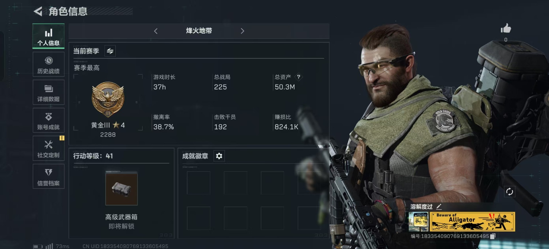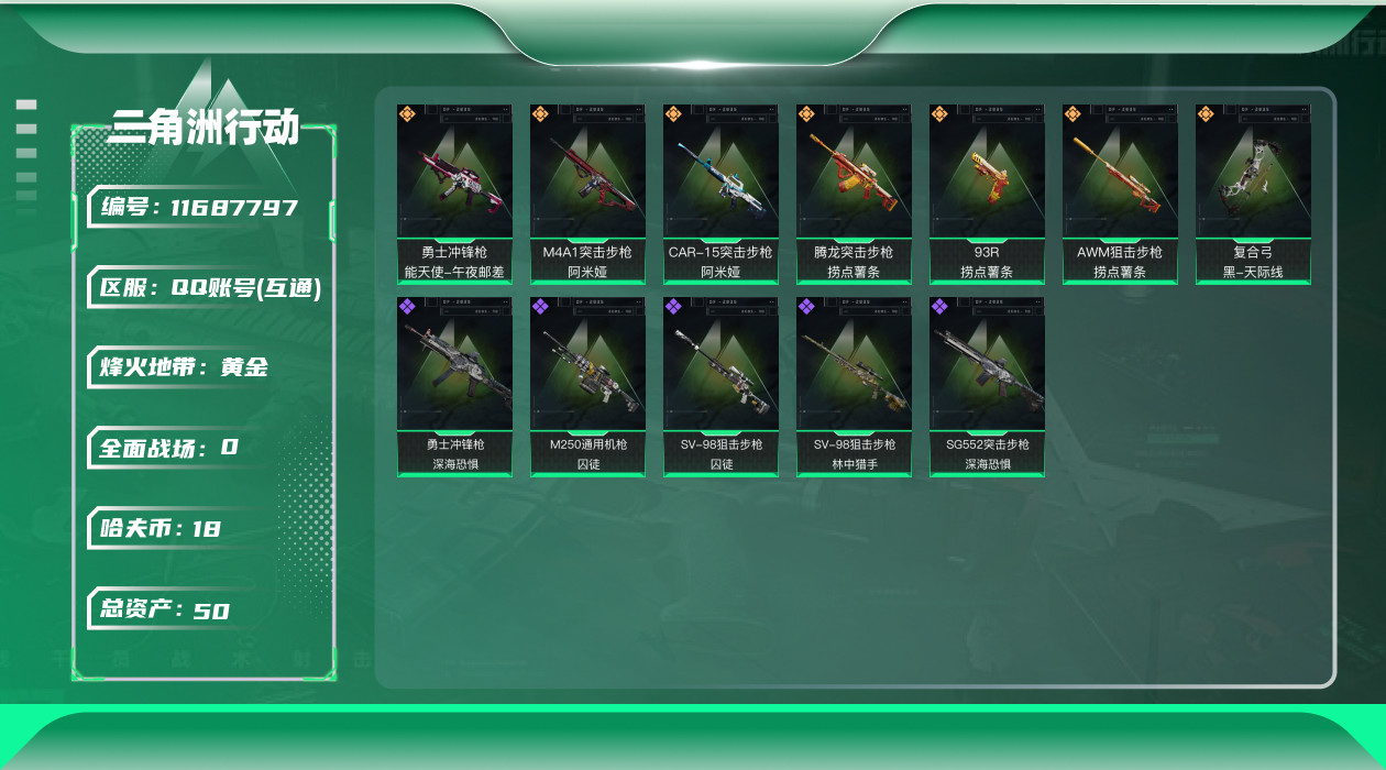 [11687797]总资产:50.3M 7传说枪械 哈夫币:18.611K 进阶安全箱(9.17到期) 可二次 可修改实名 烽火地带段位:黄金 全面战场段位:无段位 传说武器皮肤:M4A1突击步枪-阿米娅,CAR-15突击步枪-阿米娅,复合弓-黑-天际线,AWM狙击步枪-捞点薯条,腾龙突击步枪-捞点薯条,93R-捞点薯条,勇士冲锋枪-能天使-午夜邮差 史诗武器皮肤:勇士冲锋枪-深海恐惧,SG552突击步枪-深海恐惧,SV-98狙击步枪-林中猎手,M250通用机枪-囚徒,SV-98狙击步枪-囚徒