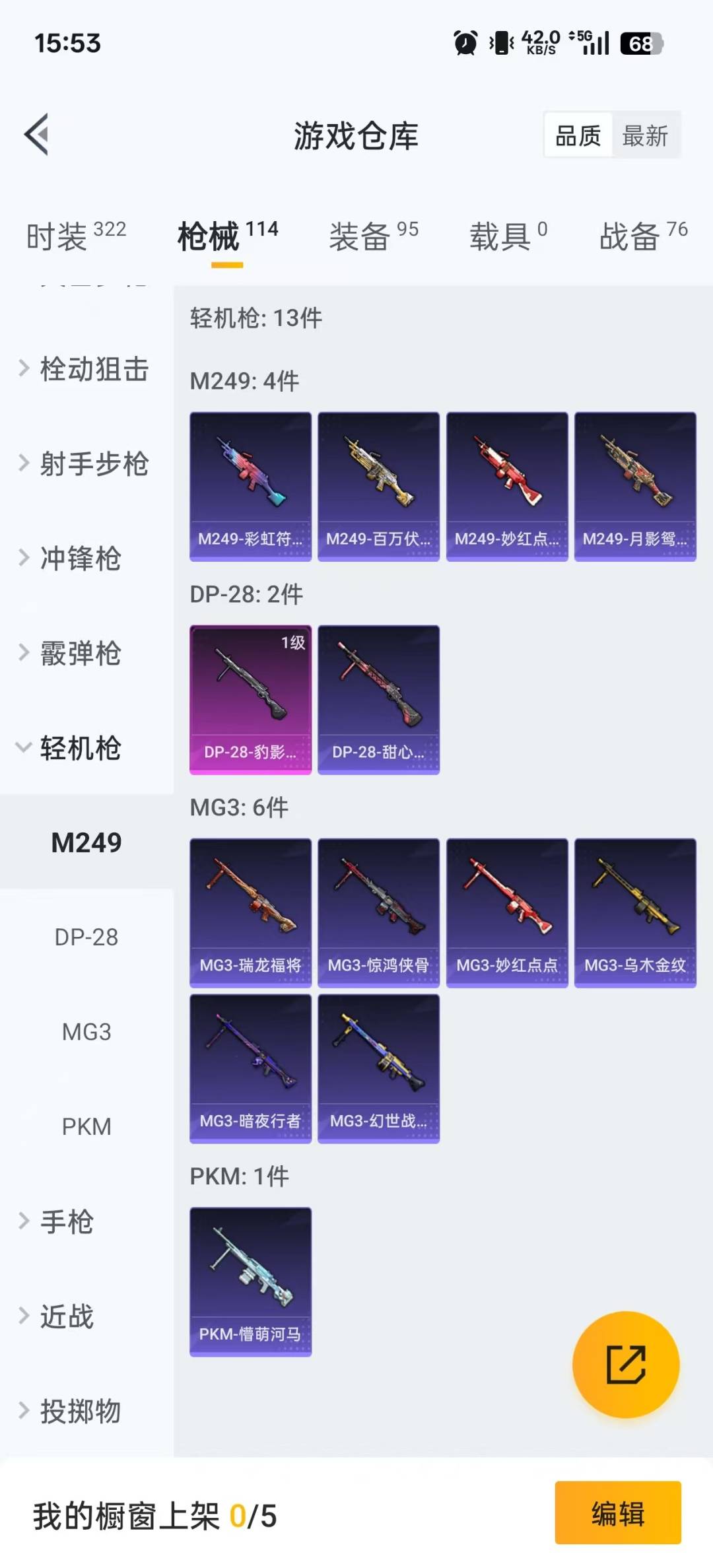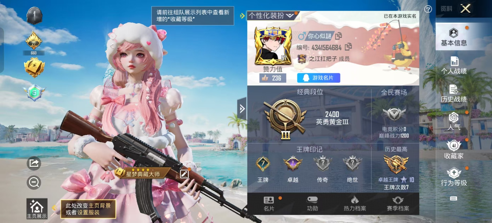 - [12252991]3粉装 3特效枪 5印记 可二次 可修改实名 优质装备:SCAR-L-锦绣绵绵,M416电玩时刻,星穹咏叹调,羊梦糖心 热门装扮:恐龙拽拽 稀有枪皮:DP-28-豹影疾电 五级特效枪:五级DP-28-豹影疾电,五级M416-电玩时刻,五级SCAR-L-锦绣绵绵 紫色装扮:SS31特训套装,人气偶像,冰川特警,北国孤狼,霓虹热舞,旭日情侣,云朵鹅,彩虹兔,雪绒豹,SS33特训套装,顶瓜瓜,乐音,电音精灵,都市魅力,酒红色名流,长空猛禽,霓虹街区,青年教官,缤纷果语,蓝彩潮人,蓝色运动,街头潮人,超能勇士,蓝海鲸歌,无面战甲,魅力单车,黄色伏地魔,黄色名流,黄色运动,黑色伏地魔,龙的传人,龟仙人,柠萌假日,橘黑制服,深蓝色名流,幻影武者,夜莺强袭者,完美偶像,帅气教官,战地菁英,湖蓝色名流,绮丽涂鸦,甜蜜菠萝,疯狂小兔子,白色伏地魔,破蛋小黄鸡,空岛之星,竞技达人朋克,红色运动,猛禽,猎鹰,异域银装,都市丽猫,竞技名士,惊鸿侠骨,SS25特训,锦衣飞扬,焰鹰斗篷,幻羽潜行,SS27特训,萌趣绒叽,忠义严颜,云霞荷露,SS26特训,春光漫游,快闪甜心,贝斯之夜,大橘大利,星影赞美诗,耀粉歌者,SS32特训服(SS32特训套装),绯格组合,白糯汤圆 优质战备:霓虹漫游降落伞,龙行天下降落伞,莲影清波降落伞,萌物绒绒飞行器,猪猪侠降落伞,时光之誓降落伞,幻彩电音降落伞,喜羊羊与灰太狼降落伞