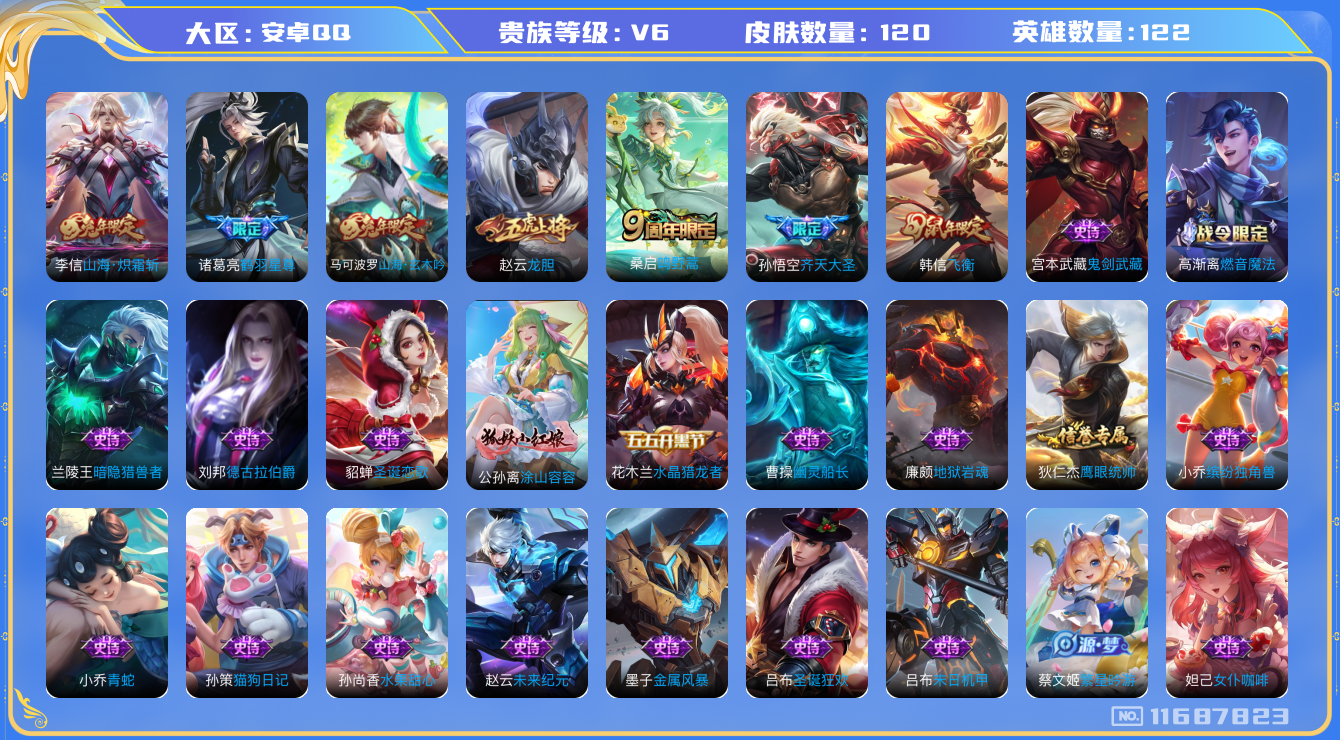- [11958985]王者荣耀-安卓QQ 贵族4 史诗皮肤29 皮肤数量150 皮肤价值:83392 英雄123 【内测皮肤】2/高渐离_玩趣恶龙/孙尚香_蔷薇恋人【史诗皮肤】29/黄忠_百相守梦/后羿_石田雨龙/狂铁_龙之律动/韩信_飞衡/铠_曙光守护者/阿古朵_江河有灵/鬼谷子_五谷丰年/庄周_高山流水/裴擒虎_李小龙/上官婉儿_梁祝/杨玉环_遇见飞天/阿轲_节奏热浪/程咬金_功夫厨神/蔡文姬_舞动绿茵/百里守约_特工魅影/安琪拉_心灵骇客/夏侯惇_乘风破浪/阿轲_暗夜猫娘/妲己_女仆咖啡/妲己_魅力维加斯/貂蝉_圣诞恋歌/宫本武藏_鬼剑武藏/吕布_圣诞狂欢/墨子_金属风暴/孙尚香_水果甜心/赵云_未来纪元/甄姬_冰雪圆舞曲/狄仁杰_鹰眼统帅/ 【其他皮肤】120/莱西奥_踏浪烽翎/庄周_锦麟游梦/姜子牙_星梦巡礼/甄姬_逆浪荇歌/白起_死霸装/姬小满_小满鸭/钟馗_虚灵犬护/露娜_命运加冕/苍_苍林狼骑/东皇太一_噬灭天穹/吕布_逐霄战戟/程咬金_无双福将/铠_龙域领主/项羽_海滩派对/鬼谷子_天穹祈灯/张良_古海寻踪/鲁班大师_探海日志/裴擒虎_擒涛扼浪/桑启_海盐诗旅/沈梦溪_大漠名商/兰陵王_金庭之子/李元芳_云中旅人/达摩_沙漠行僧/苏烈_千军破阵/钟馗_驱傩正仪/程咬金_演武夺筹/狄仁杰_万华元夜/鬼谷子_原初探秘者/老夫子_醍醐杖/明世隐_疑决卦/弈星_混沌棋/夏侯惇_朔风刀/盾山_御銮/牛魔_御旌/米莱狄_御霄/狂铁_御狮/典韦_穷奇/芈月_重明/曹操_烛龙/太乙真人_饕餮/白起_狰/后羿_完美运算/李元芳_妄想特派/刘禅_唤灵魔甲/鲁班大师_乓乓大师/狂铁_特工战影/盾山_圆桌骑士/刘备_纽约教父/扁鹊_化身博士/关羽_龙腾万里/宫本武藏_万象初新/刘备_万事如意/甄姬_花好人间/廉颇_功夫炙烤/猪八戒_潮玩探月行/露娜_瓷语鉴心/刘禅_秘密基地/哪吒_次元突破/吕布_野性能量/明世隐_虹云星官/鬼谷子_幻乐之宴/老夫子_功夫老勺/王昭君_幻想奇妙夜/钟无艳_海滩丽影/后羿_阿尔法小队/花木兰_兔女郎/阿轲_爱心护理/安琪拉_玩偶对对碰/白起_白色死神/扁鹊_救世之瞳/程咬金_星际陆战队/达摩_大发明家/典韦_黄金武士/宫本武藏_未来纪元/韩信_街头霸王/韩信_教廷特使/孙膑_天使之翼/武则天_东方不败/赵云_忍炎影/妲己_少女阿狸/露娜_哥特玫瑰/亚瑟_死亡骑士/诸葛亮_掌控之力/孙尚香_沉稳之力/宫本武藏_霸王丸/狄仁杰_阴阳师/暃_碧珀绯影/金蝉_前尘/云缨_赤焰之缨/曜_归虚梦演/瑶_森/猪八戒_年年有余/上官婉儿_修竹墨客/李信_灼热之刃/伽罗_花见巫女/司马懿_魇语军师/孙策_海之征途/裴擒虎_街头旋风/杨玉环_霓裳曲/百里守约_绝影神枪/鬼谷子_阿摩司公爵/干将莫邪_第七人偶/诸葛亮_星航指挥官/杨戬_埃及法老/雅典娜_战争女神/夏侯惇_战争骑士/虞姬_加勒比小姐/李元芳_特种部队/钟馗_地府判官/李白_范海辛/狄仁杰_锦衣卫/貂蝉_异域舞娘/后羿_精灵王/老夫子_潮流仙人/刘禅_英喵野望/鲁班七号_木偶奇遇记/鲁班七号_福禄兄弟/孙悟空_西部大镖客/王昭君_精灵公主/钟无艳_生化警戒