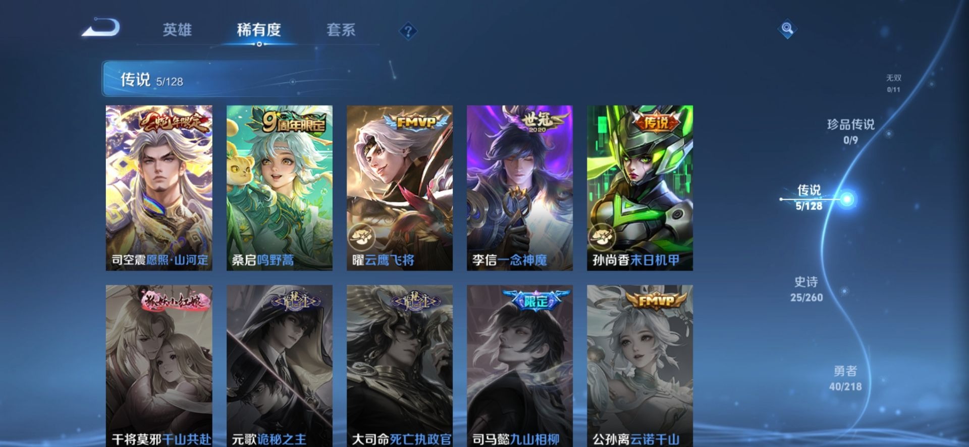 - [11688543]V9 2典藏 1无双 2珍品传说 22传说 125英雄 299皮肤 可修改实名 优质装备:鸣剑·曳影,弑枪猎影(韩信典藏),离恨烟(公孙离无双),朽木白哉,黑崎一护,黄金狮子座,云鹰飞将(小将军),绛天战甲(鸡嘴战神),炽阳神光,末日机甲-孙尚香(绿蚂蚱),地狱火,地狱之眼,时之恋人-刘备(电焊工),淬星耀世,无双飞将,山海·炽霜斩(李信年限),灼幽烈阳,妄想实况,澜逐花归海 传说皮:乘龙·铭钟鼎(赵云年限),乘龙·淬吴钩(孙策年限) 珍宝阁皮:妄想食味 限定皮:陌上桑,夏侯惇霜北刀,至尊宝,白虎志(电光耗子),白晶晶,时雨天司(水龙头),飞衡(韩信年限),瑞麟志(木兰年限),遇见飞天,青龙志(铠年限),武圣,天狼狩猎者,龙胆,烈魂,岱宗(典韦年限),玄武志(苏烈年限),朱雀志(守约年限),如梦令-后羿,圣诞老人,默契交锋-兰陵王,孙行者,大圣娶亲,引擎之心,百木心枪,时之奇旅-妲己,神器·万象笔,梦圆繁星 史诗皮:星界战将,龙之律动,石田雨龙,撼地雄心,破空之剑,涂山红红,东方月初,蒙犽顽岩魄,琥珀纪元伽罗,蔬乡物语(鲁班七号),紫霞仙子,苍穹之光,电玩小子(小书包),白龙吟,黄金分割率,特工魅影,千年之狐,永昼,江河有灵,末日机甲-莱西奥,雪夜绮愿(周瑜),真我赫兹(百里守约),魅语,百解令(蒙犽),高渐离燃音魔法,无限星赏官,匿光破解者,冰冠公主,偶像歌手,晚萤,暗夜猫娘,龙骑士(小龙虾),末日机甲-吕布,猫狗日记-孙策,猫狗日记-大乔,时之恋人-孙尚香,节奏热浪,修罗,女仆咖啡,水果甜心,绅士熊喵,天才门将,星夜王子,心灵骇客,功夫厨神,德古拉伯爵,暗隐猎兽者,幽灵船长,鬼剑武藏,暗渊魔法,舞动绿茵,地狱岩魂,纤云弄巧,拒霜思,缤纷独角兽,乘风破浪,逐浪之夏,水晶猎龙者,曙光守护者,箭羽风息,金属风暴,圣诞恋歌,鹰眼统帅,暗夜贵公子,雪上飞焰,赏金猎手,滕王阁序,未来纪元-赵云