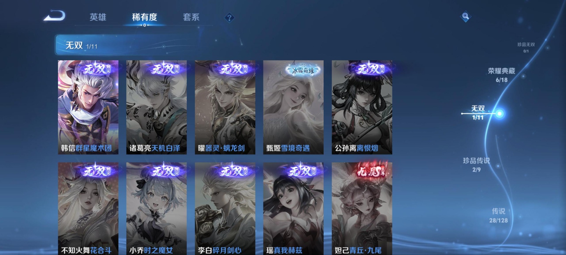 黄忠烈魂,甄姬幽恒,曹操天狼征服者,伽罗太华,张飞虎魄,赵云龙胆,典韦岱宗,后羿如梦令,庄周玄嵩,司空震愿照·山河定,裴擒虎李小龙,裴擒虎天狼狩猎者,上官婉儿梁祝,安琪拉魔法小厨娘,桑启鸣野蒿,孙悟空孙行者,百里玄策白虎志,马超神威,雅典娜神奇女侠,妲己时之彼端,韩信飞衡,嫦娥如梦令,关羽武圣