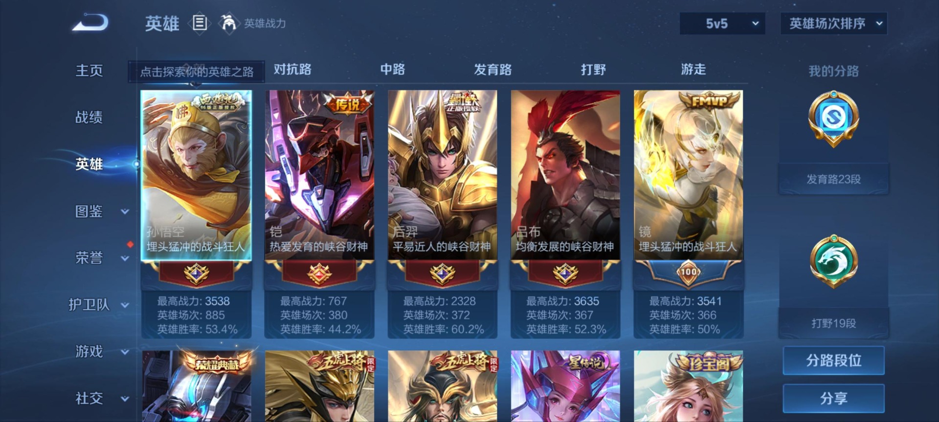 - PX_2103242-贵族等级: V7 英雄数: 124 皮肤数: 171 星传说: 幽冥之眼 传说皮: 久胜战神,地狱之眼,李逍遥 限定皮: 李小龙,游园惊梦,梁祝,天魔缭乱,神威,朱雀志,至尊宝,高山流水,五谷丰年,鸣野蒿