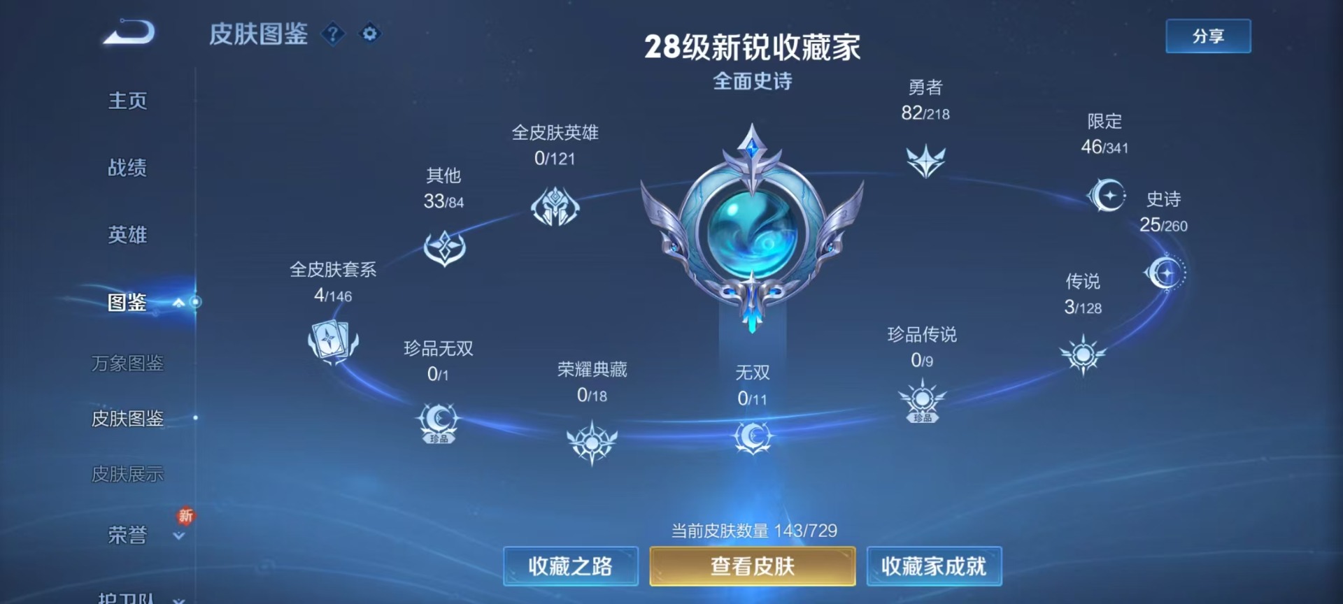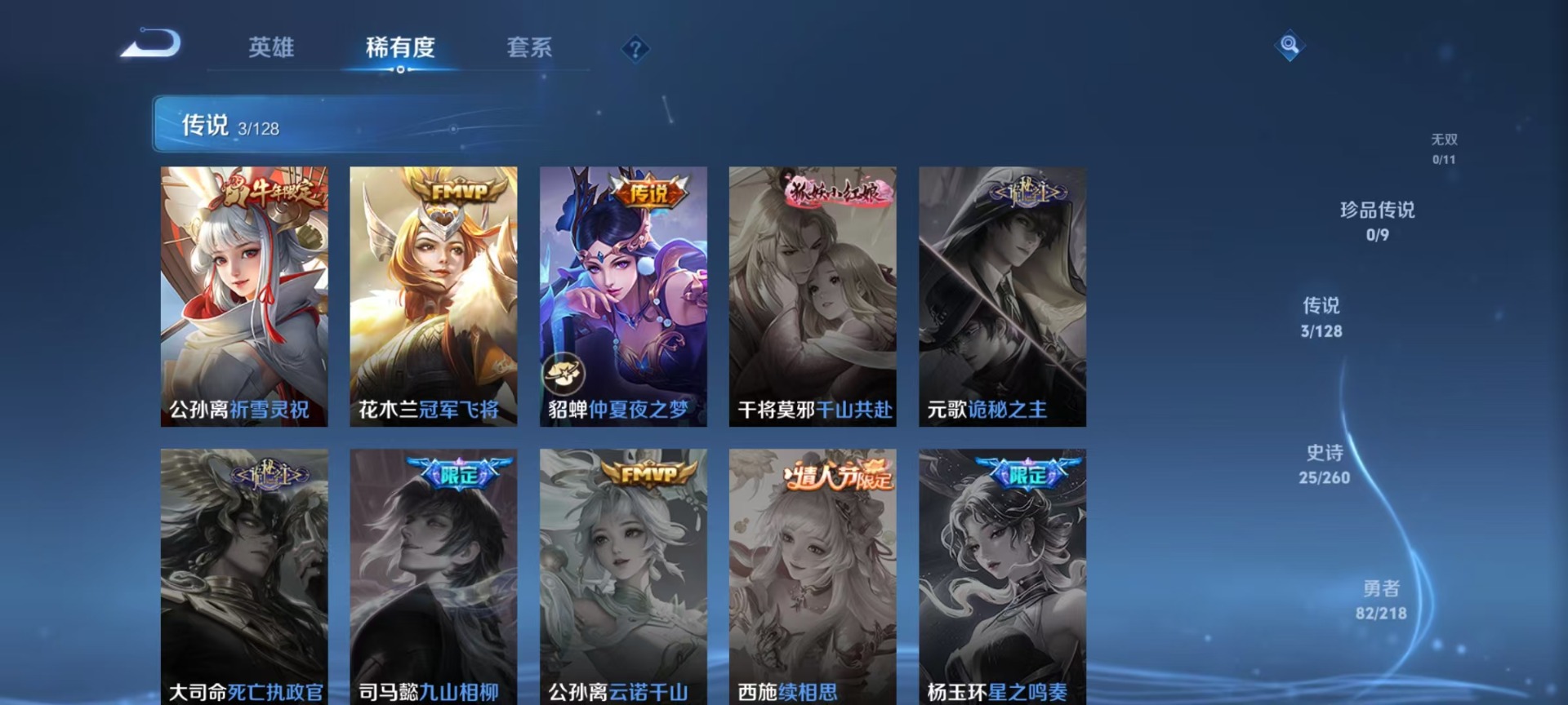 - PX_2085562-77 安卓QQ/无双王者/257皮肤/125英雄/1典藏/0珍品无双/1无双/1珍品传说/22传说/83史诗/9稀有英雄 【1 珍品传说】器灵·落星盏 嫦娥, 【1 典藏皮肤】最初的交响 伽罗, 【1 无双皮肤】离恨烟 公孙离, 【22 传说皮肤】启明星使 虞姬,云霓雀翎 虞姬,深海之息 马可波罗,武陵仙君 诸葛亮,炽阳神光 镜,启示之音 露娜,黄金射手座 后羿,遇见神鼓 吕