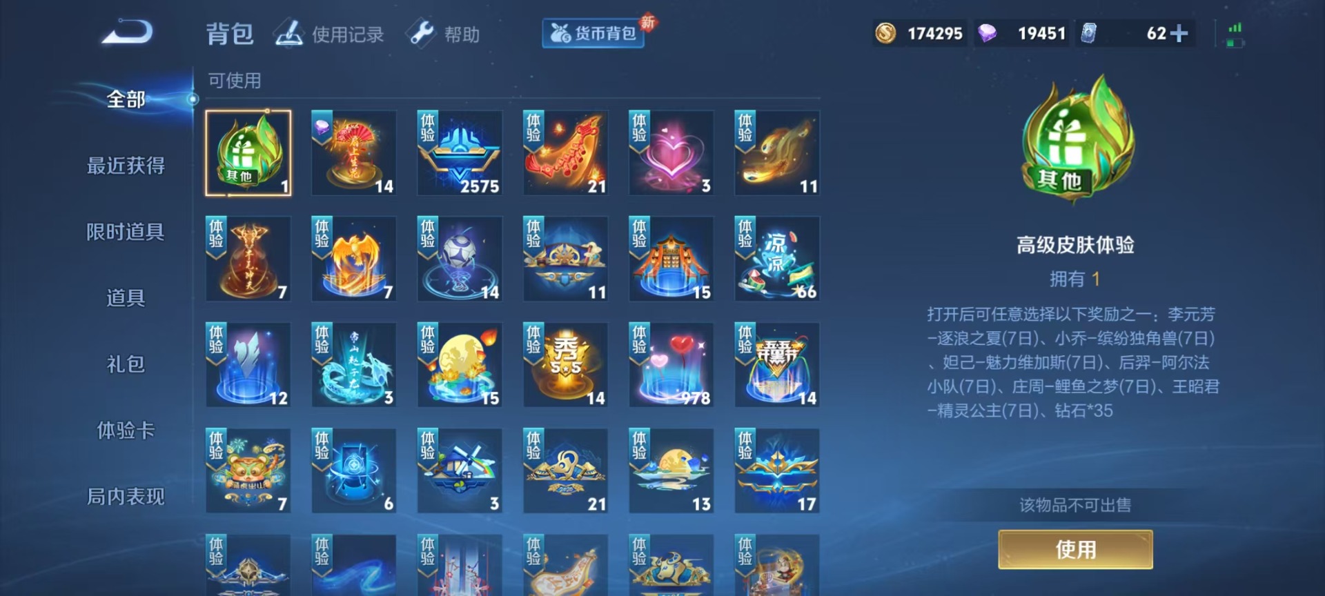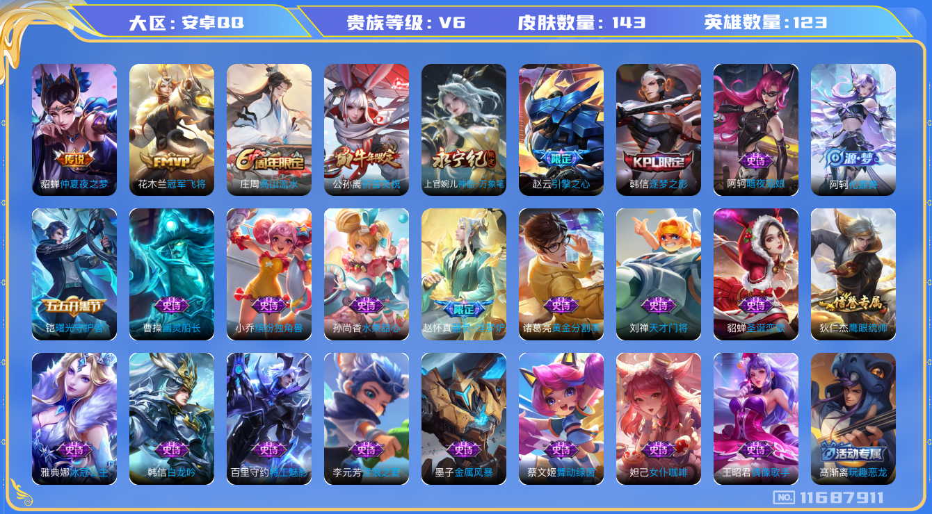 - [12294750]V7 1典藏 1珍品传说 8传说 125英雄 277皮肤 可修改实名 优质装备:鸣剑·曳影,怪盗基德,炽阳神光,一念神魔,千山共赴,涂山容容 传说皮:吕布曦玄引,幻光神枪 珍宝阁皮:万物之道,蔷薇恋人,玩趣恶龙 限定皮:愿照·九州拓(澜年限),愿照·山河定(司空震年限),逐霄战戟,鸣野蒿,神威(电光马子),高山流水,五谷丰年,冰锋战神,御风骁将(吕布年限),李小龙,圣诞老人,默契交锋-花木兰,孙行者,猪悟能 史诗皮:器灵·浮梦炉,糖绘人间,龙之律动,茶境仙,蒙犽顽岩魄,破空之剑,百相守梦-黄忠,星界战将,紫霞仙子,黄金分割率,特工魅影,千年之狐,永昼,江河有灵,高渐离燃音魔法,蒙恬荣光圣徽,魅语,偶像歌手,电玩·爆裂旋风,末日机甲-吕布,猫狗日记-孙策,乱世虎臣,节奏热浪,摇滚巨星,水果甜心,绅士熊喵,天才门将,星夜王子,时之奇旅-安琪拉,功夫厨神,德古拉伯爵,暗隐猎兽者,幽灵船长,鬼剑武藏,地狱岩魂,缤纷独角兽,乘风破浪,逐浪之夏,月团寄思,水晶猎龙者,曙光守护者,箭羽风息,金属风暴,原初追逐者,圣诞狂欢,鹰眼统帅,魅力维加斯,黎明之约,未来纪元-赵云