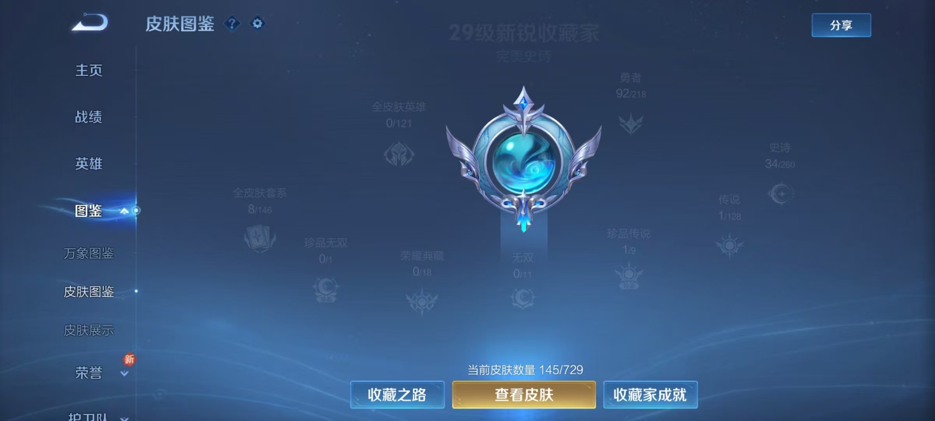 - PX_2062089-实名: 可修改 贵族等级: V6 英雄数: 122 皮肤数: 161 星传说: 金色仲夏夜 传说皮: 云鹰飞将,猫影幻舞,仲夏夜之梦,零号·赤焰,貂蝉曦玄引,续相思 限定皮: 遇见飞天,李小龙,梁祝,高山流水,时之奇旅-妲己,五谷丰年,山海·玄木吟,至美·乘鲤谣