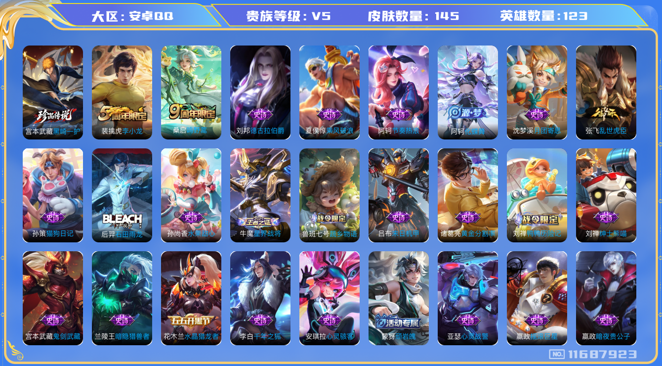 [11687923]V5 1珍品传说 1传说 123英雄 145皮肤 可修改实名 优质装备:黑崎一护 珍宝阁皮:玩趣恶龙 限定皮:鸣野蒿,李小龙 史诗皮:鸭鸭历险记-刘禅,化蝶舞,星界战将,石田雨龙,蒙犽顽岩魄,蔬乡物语(鲁班七号),黄金分割率,特工魅影,千年之狐,蒙恬荣光圣徽,末日机甲-吕布,猫狗日记-孙策,乱世虎臣,节奏热浪,女仆咖啡,摇滚巨星,水果甜心,绅士熊喵,心灵骇客,德古拉伯爵,暗隐猎兽者,鬼剑武藏,心灵战警,乐园奇幻夜,乘风破浪,月团寄思,水晶猎龙者,金属风暴,鹰眼统帅,暗夜贵公子,黎明之约,未来纪元-赵云