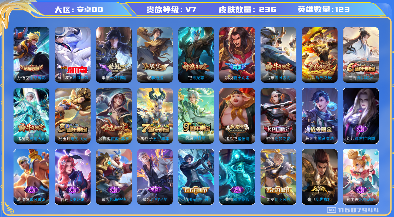 [11687944]V7 1典藏 1珍品传说 5传说 123英雄 236皮肤 可修改实名 优质装备:全息碎影(猴子典藏),怪盗基德,一念神魔,李逍遥 珍宝阁皮:妄想食味,玩趣恶龙 限定皮:鸣野蒿,时雨天司(水龙头),遇见飞天,高山流水,五谷丰年,青龙志(铠年限),御风骁将(吕布年限),逐梦之影,辉光之辰,霸王别姬-项羽,猪悟能,寅虎·赤拳(老虎年限) 史诗皮:星界战将,百相守梦-周瑜,怒海争锋,蒙犽顽岩魄,蔬乡物语(鲁班七号),百相守梦-百里守约,百相守梦-黄忠,苍穹之光,电玩小子(小书包),特工魅影,千年之狐,百解令(蒙犽),高渐离燃音魔法,蒙恬荣光圣徽,冰冠公主,电玩·爆裂旋风,龙骑士(小龙虾),末日机甲-吕布,乱世虎臣,节奏热浪,修罗,女仆咖啡,摇滚巨星,水果甜心,星夜王子,德古拉伯爵,幽灵船长,鬼剑武藏,心灵战警,舞动绿茵,拒霜思,乘风破浪,逐浪之夏,水晶猎龙者,曙光守护者,热力回旋,箭羽风息,金属风暴,原初追逐者,鹰眼统帅,黎明之约,无心