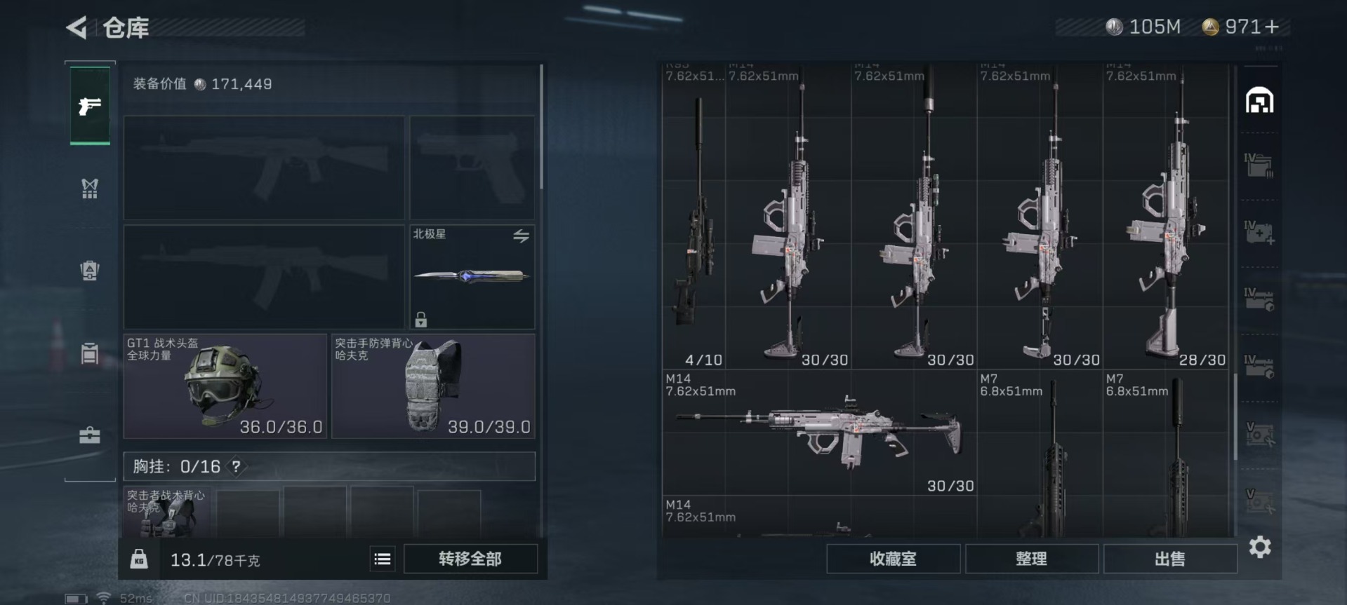 - [11253066]总资产:153.7M 2传说枪械 哈夫币:125K 可二次 可修改实名 优质装备:顶级安全箱(3x3) 烽火地带段位:青铜 全面战场段位:无段位 传说武器皮肤:CAR-15突击步枪-阿米娅,勇士冲锋枪-能天使-午夜邮差 史诗武器皮肤:AUG突击步枪-蝮蛇,勇士冲锋枪-深海恐惧,AKM突击步枪-林中猎手,M1014霰弹枪-林中猎手,SV-98狙击步枪-林中猎手,Vector冲锋枪-阿萨拉文明