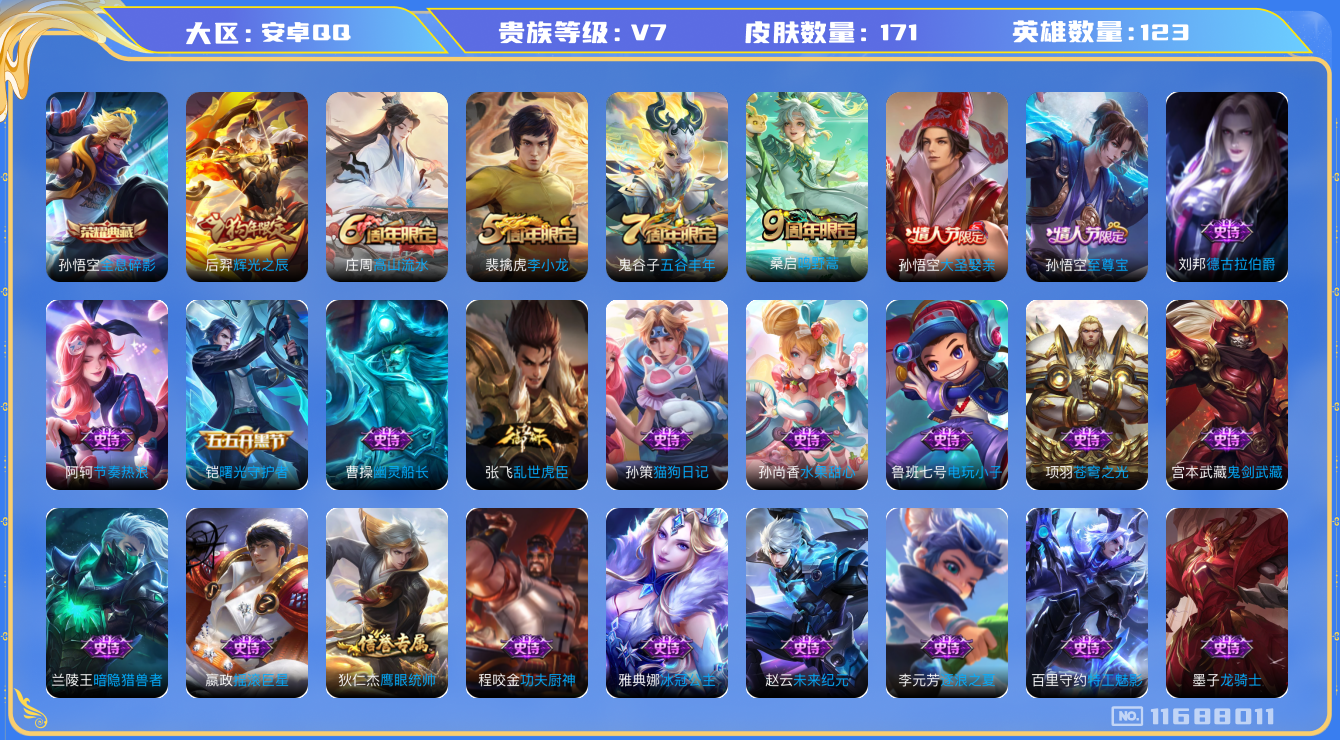 [11688011]V7 1典藏 1传说 123英雄 171皮肤 可修改实名 优质装备:全息碎影(猴子典藏) 珍宝阁皮:妄想食味,蔷薇恋人,玩趣恶龙 限定皮:鸣野蒿,至尊宝,高山流水,五谷丰年,李小龙,辉光之辰,大圣娶亲 史诗皮:苍穹之光,电玩小子(小书包),特工魅影,冰冠公主,偶像歌手,龙骑士(小龙虾),猫狗日记-孙策,乱世虎臣,节奏热浪,女仆咖啡,摇滚巨星,水果甜心,功夫厨神,德古拉伯爵,暗隐猎兽者,幽灵船长,鬼剑武藏,逐浪之夏,曙光守护者,金属风暴,鹰眼统帅,魅力维加斯,未来纪元-赵云