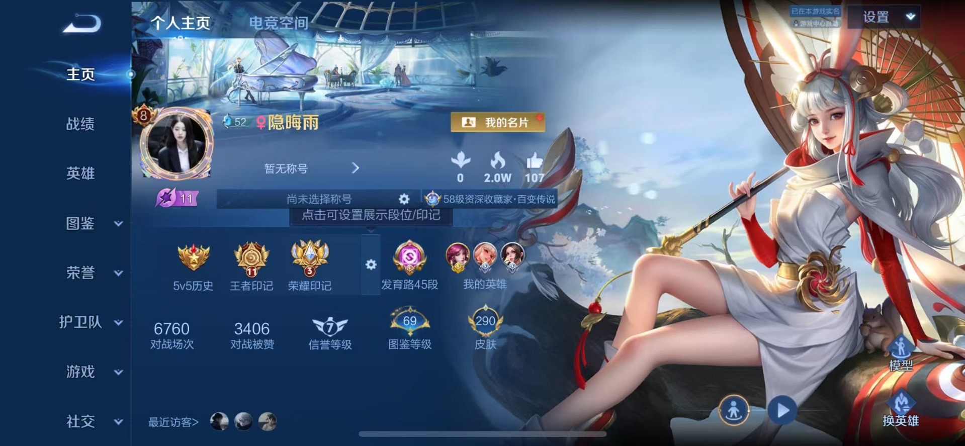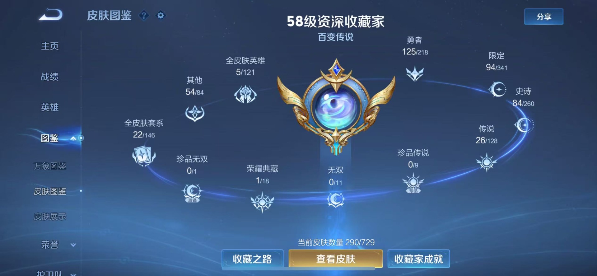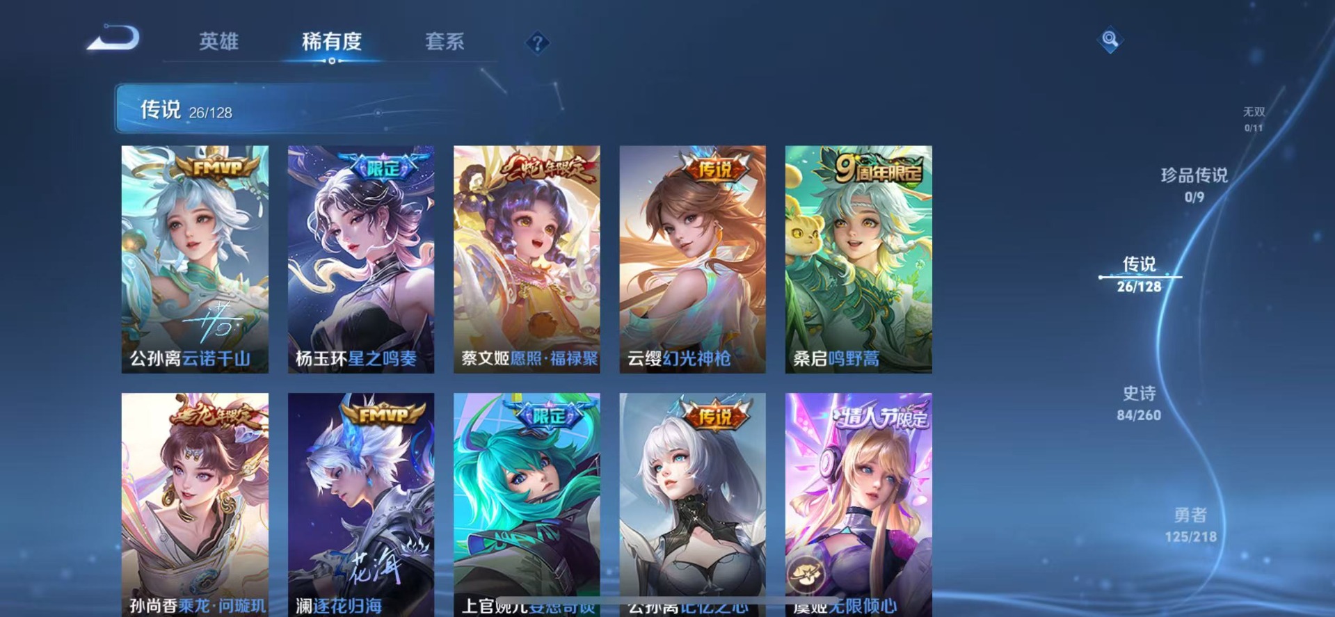 - [36843]英雄数: 83 勇者皮肤数: 46 史诗皮肤数: 10 传说皮肤数: 1 稀有英雄: 艾琳,娜可露露,不知火舞,桑启,戈娅 当前段位: 王者 限定皮肤: 高山流水,五谷丰年 内测皮肤: 女武神 史诗皮肤: 逐浪之夏,水果甜心,乘风破浪,水晶猎龙者 赛季/战令皮肤: 朔风刀,混沌棋,疑决卦,醍醐杖,原初探秘者,万华元夜,演武夺筹,驱傩正仪,千军破阵,星际陆战队(达摩),金庭之子,大漠名商,云中旅人,海盐诗旅 实名: 无人脸修改机会/实名是本人 普通皮肤: 五福同心,龙腾万里,归虚梦演(曜),掌控之力,守护之力,化身博士,缤纷绘卷,黄金武士,天使之翼,红桃皇后,星际陆战队(程咬金),阴阳师,汉昭烈帝,兔女郎,死亡骑士,救世之瞳,白色死神,野性能量,冰雪圆舞曲,露花倒影,花见巫女,未来旅行,龙域领主,蔷薇王座,万圣前夜,异域舞娘,潮流仙人,东海龙王,战争女神,精灵王,死神来了,赤焰之缨,启蛰,棒球奇才,海之征途,精准探案法,花间舞,绝影神枪,阿摩司公爵,特种部队,隐刃,木偶奇遇记,海军大将,一千零一夜,英喵野望,前尘,碧珀绯影