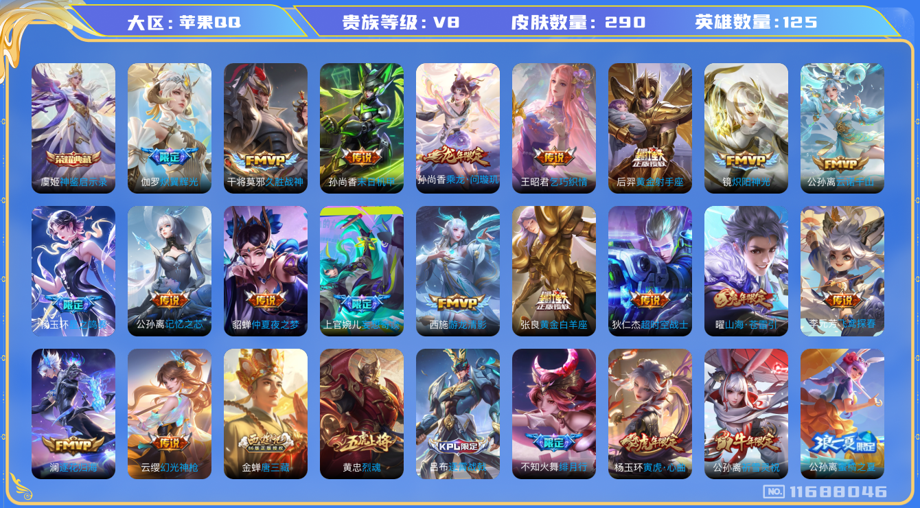 - [12265769]V10 4典藏 3无双 2珍品传说 52传说 126英雄 440皮肤 典藏英雄武则天 可修改实名 优质装备:鸣剑·曳影,星域神启(倪克斯贼亮),幻阙歌(貂蝉典藏),弑枪猎影(韩信典藏),青丘·九尾(妲己无双),碎月剑心(李白无双),花合斗,怪盗基德,器灵·落星盏,黄金狮子座,黄金射手座,绛天战甲(鸡嘴战神),黄金白羊座,猫影幻舞,炽阳神光,仲夏夜之梦(大飞蛾),音你心动-小乔,零号·赤焰,海洋之心,地狱之眼,飞鸢探春,音你心动-周瑜,胖达荣荣,李逍遥,时之恋人-刘备(电焊工),淬星耀世,超时空战士-狄仁杰,花朝如约(花篮子),无双飞将,山海·炽霜斩(李信年限),山海·琳琅生(小乔年限),浮生妄,青丘·九尾,百相守梦(张飞),电玩·雷克斯,鹤羽星尊,灼幽烈阳,永恒水手月亮,夜礼服假面,小动物乐团,澜逐花归海,艾琳觅芳踪,云中君群星魔术团,涂山容容 传说皮:乘龙·淬吴钩(孙策年限),幻光神枪 珍宝阁皮:胡桃夹子,女武神 限定皮:愿照·九州拓(澜年限),愿照·众生和(妲己年限),鸣野蒿,至尊宝,白虎志(电光耗子),凤求凰(白切鸡),太华(伽罗年限),异界灵契(白毛香),傲雪梅枪,补天,前尘镜,星穹之声,神威(电光马子),飞衡(韩信年限),遇见飞天,诗剑行,怒海麟威,五谷丰年,青龙志(铠年限),冰锋战神,岱宗(典韦年限),天狼绘梦者,李小龙,玄武志(苏烈年限),朱雀志(守约年限),霸王别姬-虞姬,大圣娶亲,天魔缭乱,青春决赛季,云端筑梦师,热情桑巴,美猴王,寅虎·赤拳(老虎年限),无尽星芒,唐三藏,枫霜尽,匿光启智者,梦圆繁星 史诗皮:鸭鸭历险记-刘禅,化蝶舞,灵蛊蚀心,星界战将,龙之律动,石田雨龙,茶境仙,炽弈燎原,破空之剑,战舞者,涂山红红,东方月初,蒙犽顽岩魄,琥珀纪元伽罗,上官婉儿群星魔术团,蔬乡物语(鲁班七号),曹操夜都魔契,百相守梦-百里守约,百相守梦-黄忠,织梦人,遇见神鹿,紫霞仙子,苍穹之光,电玩小子(小书包),黄金分割率,特工魅影,千年之狐,永昼,江河有灵,雪夜绮愿(周瑜),百解令(蒙犽),高渐离燃音魔法,蒙恬荣光圣徽,无限星赏官,匿光破解者,冰冠公主,偶像歌手,晚萤,暗夜猫娘,银翎春语,龙骑士(小龙虾),末日机甲-吕布,猫狗日记-孙策,猫狗日记-大乔,乱世虎臣,节奏热浪,女仆咖啡,摇滚巨星,水果甜心,绅士熊喵,天才门将,星夜王子,心灵骇客,功夫厨神