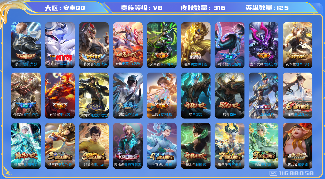 [11688058]V8 1典藏 1珍品传说 17传说 125英雄 316皮肤 可修改实名 优质装备:鸣剑·曳影,怪盗基德,黄金狮子座,冠军飞将,久胜战神,云霓雀翎,末日机甲-孙尚香(绿蚂蚱),地狱火,零号·赤焰,地狱之眼 传说皮:乘龙·淬吴钩(孙策年限),死亡执政官,九山相柳,幻光神枪 珍宝阁皮:妄想食味,蔷薇恋人,玩趣恶龙 限定皮:愿照·九州拓(澜年限),逐霄战戟,鸣野蒿,白虎志(电光耗子),时雨天司(水龙头),神威(电光马子),飞衡(韩信年限),瑞麟志(木兰年限),遇见飞天,高山流水,五谷丰年,青龙志(铠年限),梁祝,天狼狩猎者,岱宗(典韦年限),李小龙,孙行者,猪悟能 史诗皮:器灵·浮梦炉,化蝶舞,星界战将,龙之律动,百相守梦-周瑜,茶境仙,破空之剑,蒙犽顽岩魄,蔬乡物语(鲁班七号),百相守梦-百里守约,百相守梦-黄忠,紫霞仙子,苍穹之光,电玩小子(小书包),特工魅影,千年之狐,江河有灵,雪夜绮愿(周瑜),百解令(蒙犽),高渐离燃音魔法,蒙恬荣光圣徽,冰冠公主,青蛇,偶像歌手,电玩·爆裂旋风,百相守梦(刘备),暗夜猫娘,末日机甲-吕布,猫狗日记-孙策,乱世虎臣,节奏热浪,修罗,女仆咖啡,摇滚巨星,水果甜心,星夜王子,心灵骇客,功夫厨神,德古拉伯爵,暗隐猎兽者,幽灵船长,鬼剑武藏,心灵战警,乐园奇幻夜,天秀·启明,舞动绿茵,地狱岩魂,纤云弄巧,拒霜思,乘风破浪,逐浪之夏,水晶猎龙者,曙光守护者,箭羽风息,金属风暴,原初追逐者,圣诞恋歌,鹰眼统帅,魅力维加斯,黎明之约,赏金猎手,无心,未来纪元-赵云