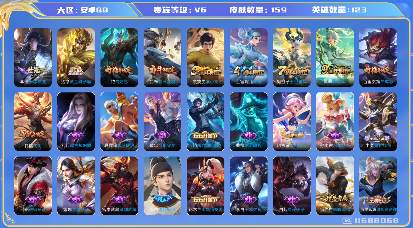 [11688068]V6 4传说 123英雄 159皮肤 可修改实名 优质装备:黄金狮子座,一念神魔 珍宝阁皮:妄想食味,胡桃夹子 限定皮:鸣野蒿,白虎志(电光耗子),飞衡(韩信年限),五谷丰年,青龙志(铠年限),梁祝,御风骁将(吕布年限),李小龙 史诗皮:星界战将,谪仙醉月,龙之律动,百相守梦-黄忠,紫霞仙子,特工魅影,千年之狐,江河有灵,蒙恬荣光圣徽,冰冠公主,偶像歌手,修罗,水果甜心,星夜王子,德古拉伯爵,幽灵船长,鬼剑武藏,舞动绿茵,乘风破浪,逐浪之夏,水晶猎龙者,曙光守护者,原初追逐者,圣诞狂欢,鹰眼统帅,魅力维加斯,黎明之约,未来纪元-赵云