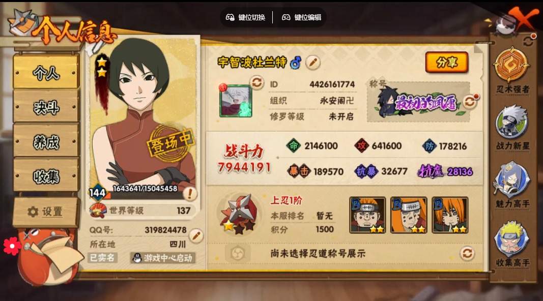 - 火影忍者手游/QQ/安卓QQ1-100区/1区宇智波佐助