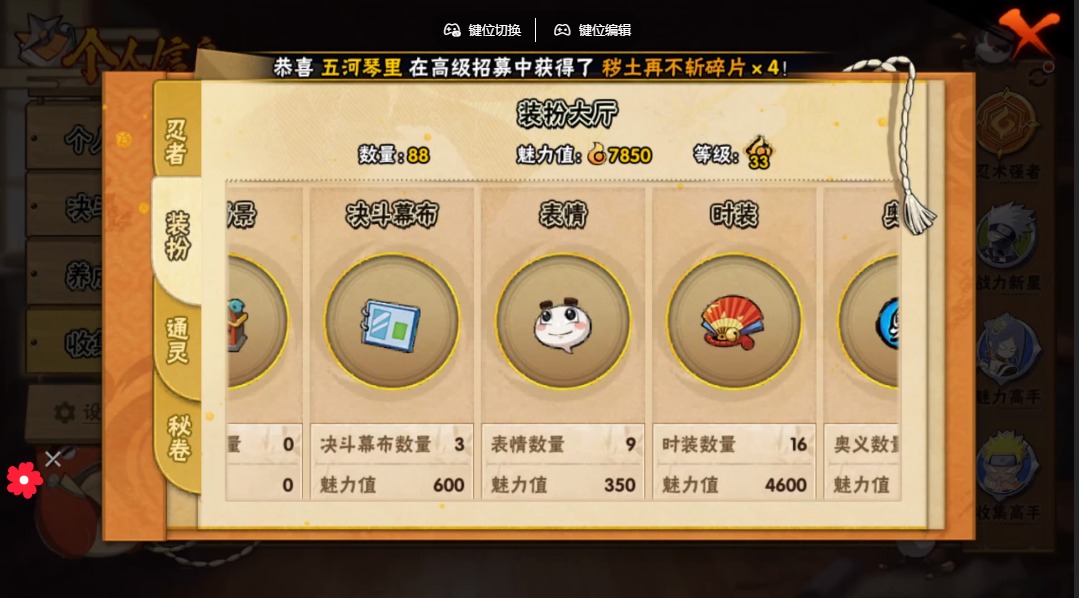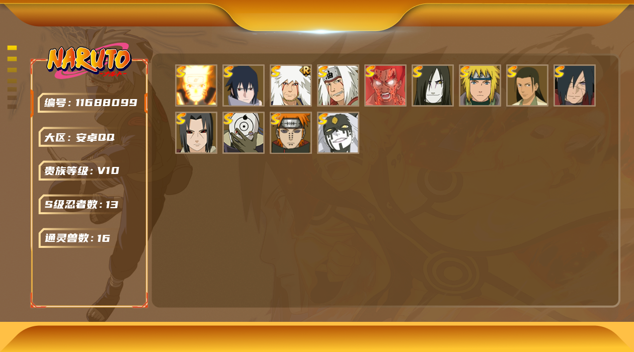 - [11678802]V11 16S忍 30A忍 21通灵 818.4W战力 可二次 可修改实名 优质装备:熊猫,猿飞日斩「秽土转生」,“宇智波斑” 「白面具」,漩涡鸣人 「九喇嘛连结」,春野樱 「忍界大战」,神秘面具男 「红夜之刃」,宇智波佐助「永恒万花筒」,千手柱间·木叶创立,宇智波斑「秽土转生·解」,大筒木桃式,艾「忍界大战」,宇智波止水「须佐能乎」,旗木卡卡西「须佐能乎」 S级忍者:自来也 「舞之豪杰」,宇智波鼬 「须佐能乎」,佩恩「天道」,波风水门