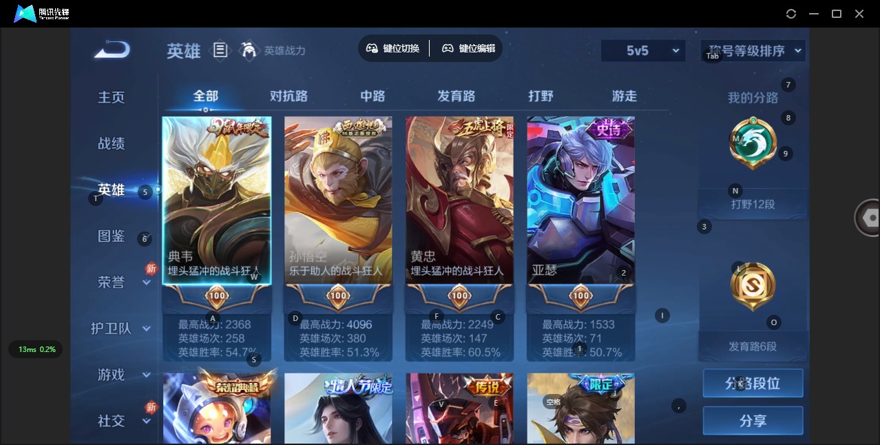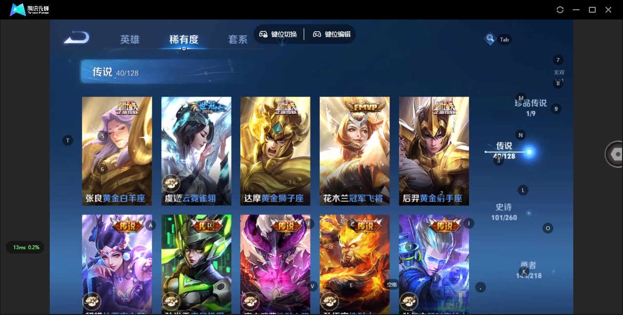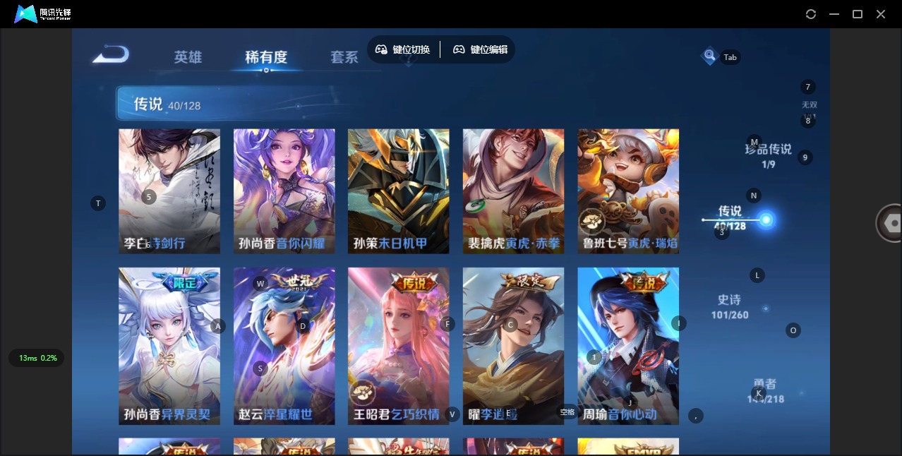 - [11677605]V8 11传说 124英雄 293皮肤 可修改实名 优质装备:黄金射手座,久胜战神,地狱火,零号·赤焰,地狱之眼,时之恋人-刘备(电焊工) 传说皮:幻光神枪 珍宝阁皮:妄想食味,优雅恋人 限定皮:鸣野蒿,至尊宝,白虎志(电光耗子),凤求凰(白切鸡),傲雪梅枪,神威(电光马子),飞衡(韩信年限),五谷丰年,冰锋战神,天狼运算者,梁祝,御风骁将(吕布年限),逐梦之星,岱宗(典韦年限),天狼溯光者,李小龙,朱雀志(守约年限),如梦令-嫦娥,如梦令-后羿,孙行者,大圣娶亲,乒乒小将,寅虎·心曲(虎婆) 史诗皮:鸭鸭历险记-刘禅,化蝶舞,龙之律动,百相守梦-周瑜,茶境仙,百相守梦-百里守约,百相守梦-黄忠,紫霞仙子,电玩小子(小书包),白龙吟,黄金分割率,特工魅影,千年之狐,江河有灵,雪夜绮愿(周瑜),百解令(蒙犽),冰冠公主,晚萤,末日机甲-吕布,猫狗日记-孙策,猫狗日记-大乔,时之恋人-孙尚香,乱世虎臣,节奏热浪,修罗,女仆咖啡,摇滚巨星,水果甜心,绅士熊喵,天才门将,星夜王子,功夫厨神,德古拉伯爵,暗隐猎兽者,幽灵船长,鬼剑武藏,乐园奇幻夜,天秀·启明,舞动绿茵,纤云弄巧,拒霜思,缤纷独角兽,乘风破浪,龙鼓争鸣,水晶猎龙者,曙光守护者,热力回旋,箭羽风息,金属风暴,圣诞恋歌,鹰眼统帅,无心,未来纪元-赵云