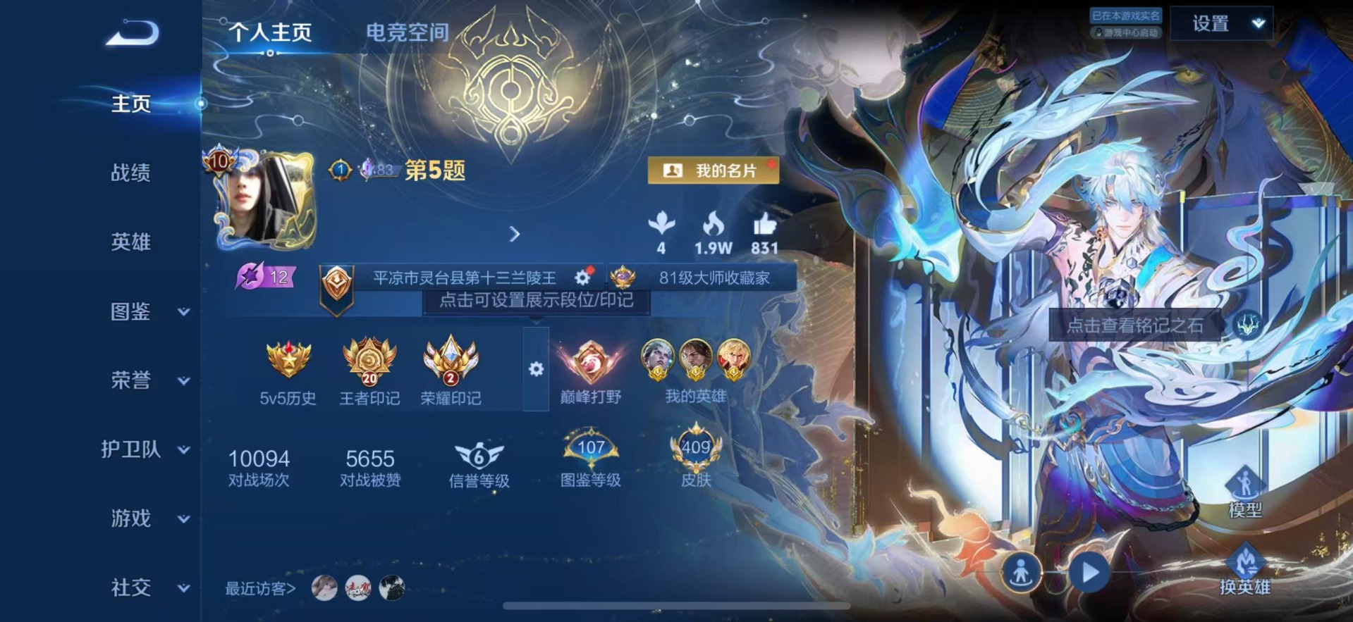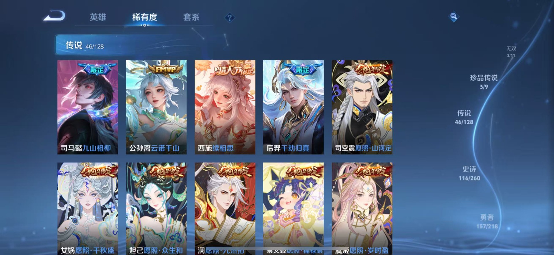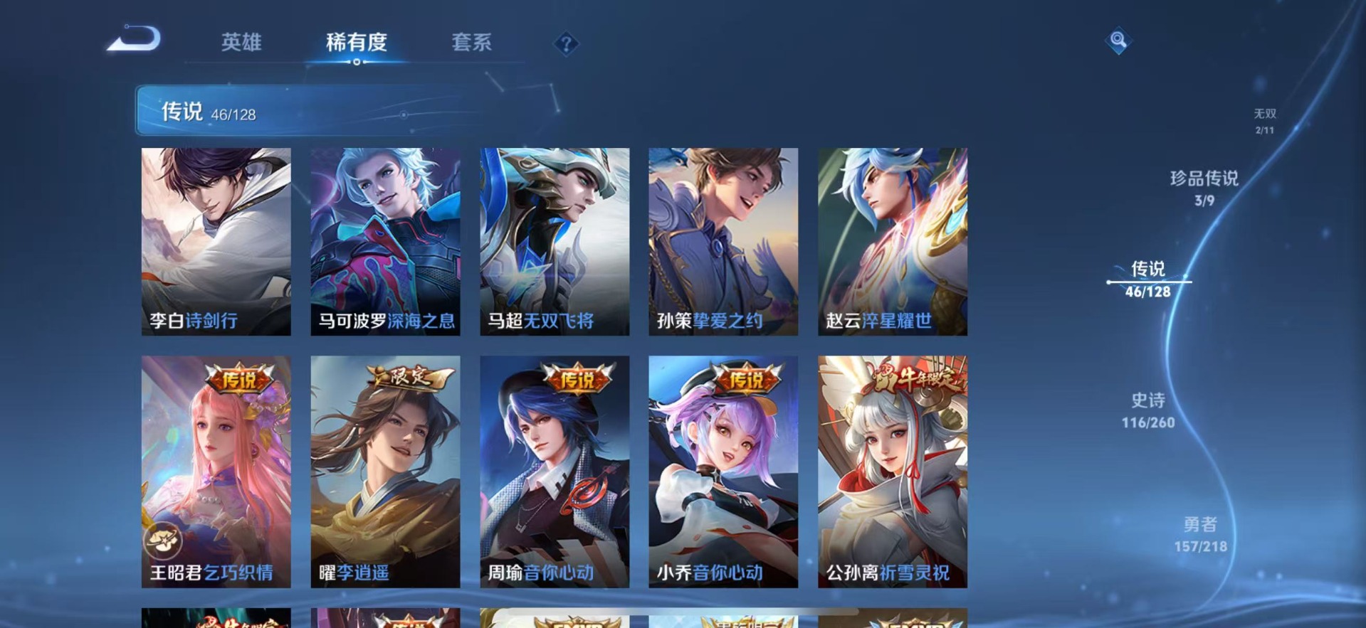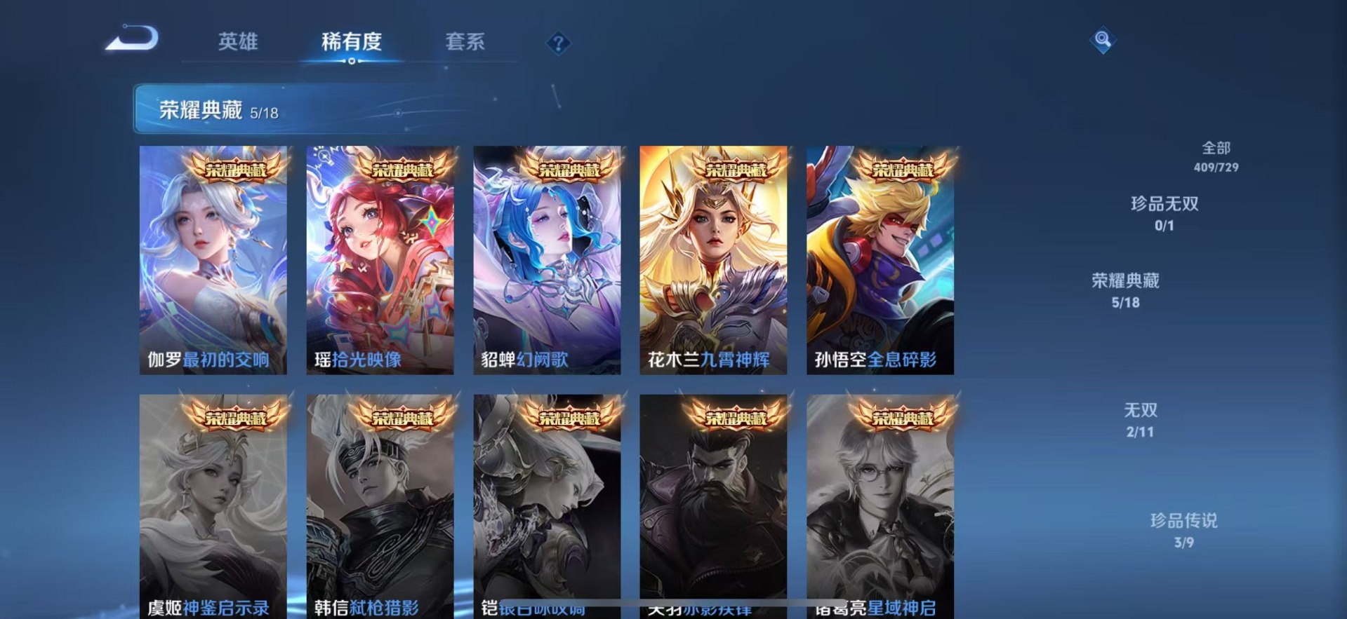 - PX_2095935-实名: 可修改 贵族等级: V5 英雄数: 124 皮肤数: 163 传说皮: 乘龙·问璇玑 限定皮: 李小龙,梁祝,御风骁将,引擎之心,飞衡,大圣娶亲,五谷丰年,山海·玄木吟,鸣野蒿,逐霄战戟
